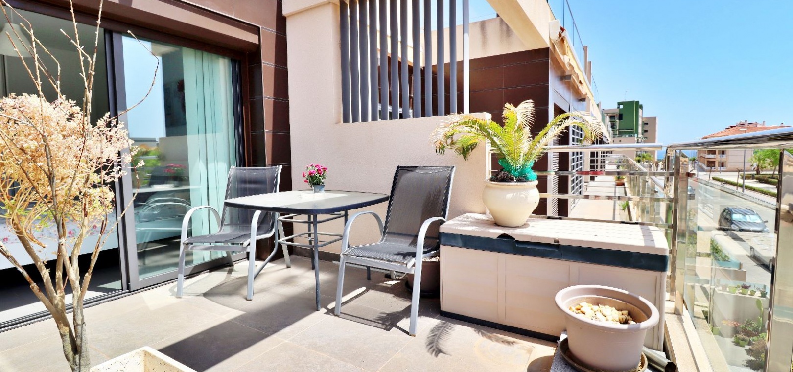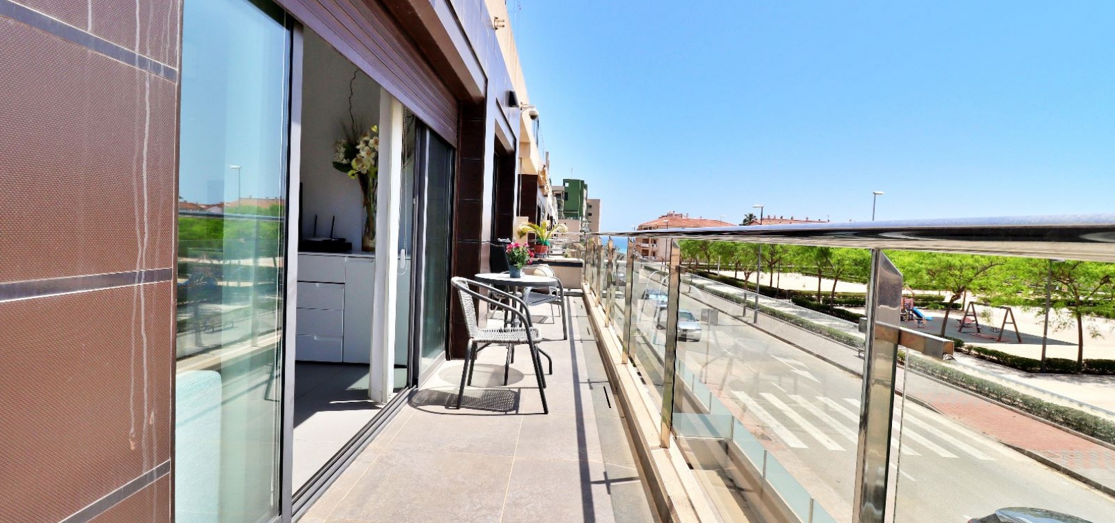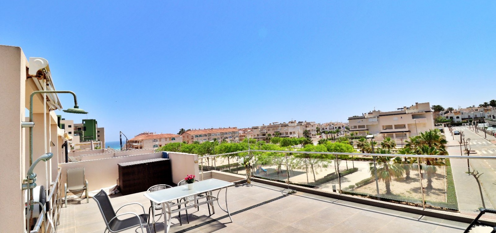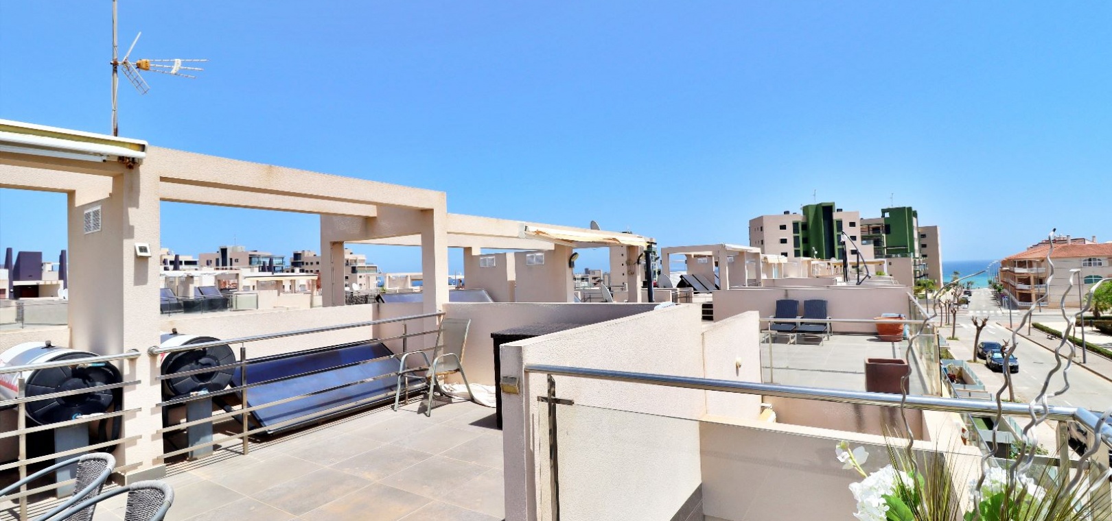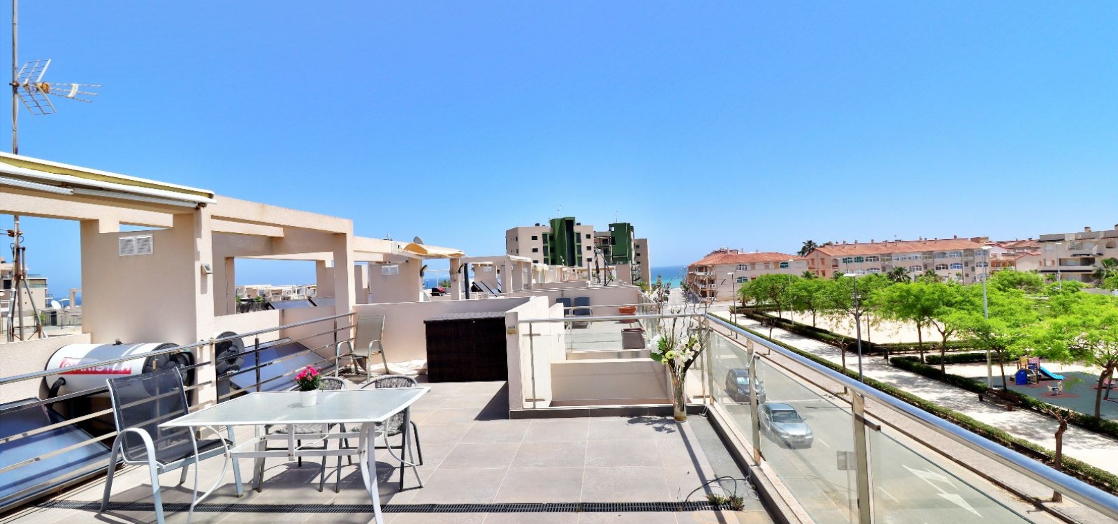 En ultramodern lägenhet med 2 sovrum och 1 badrum i söderläge på översta våningen med ett privat takterrass vid stranden Mil Palmeras, Costa Blanca.