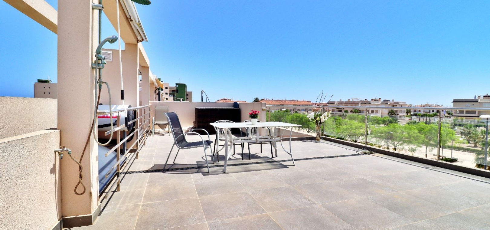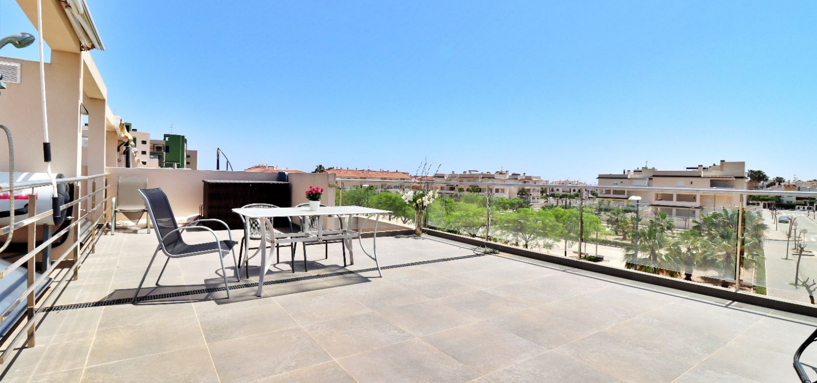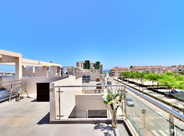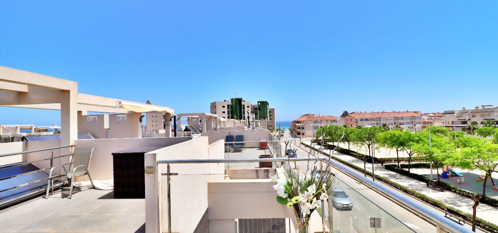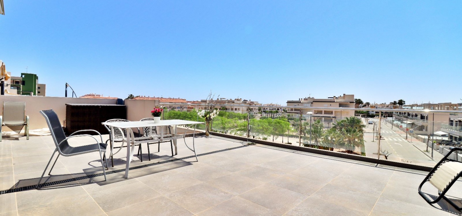 En ultramodern lägenhet med 2 sovrum och 1 badrum i söderläge på översta våningen med ett privat takterrass vid stranden Mil Palmeras, Costa Blanca.