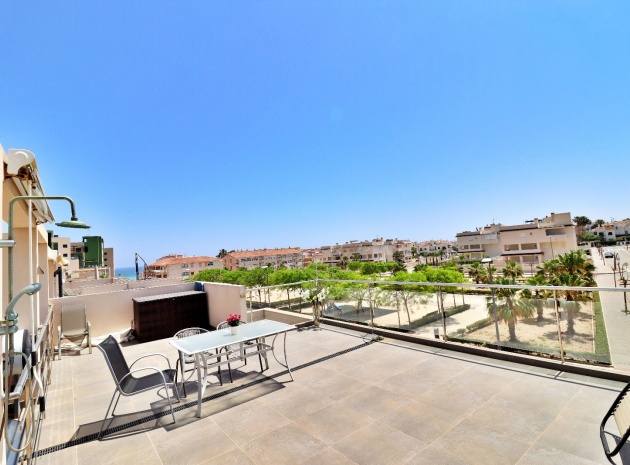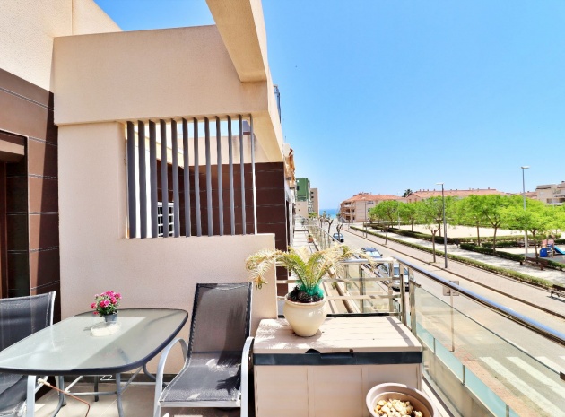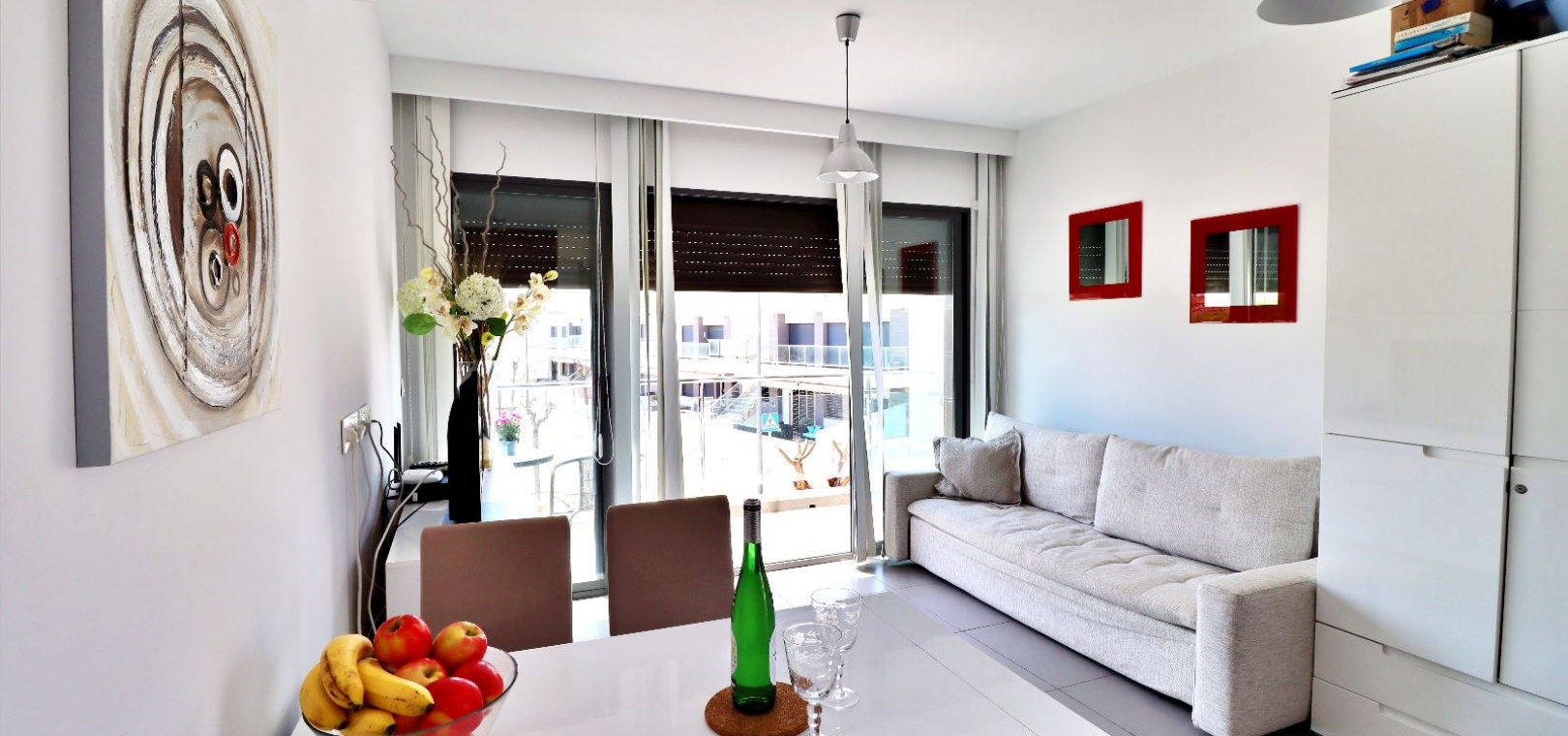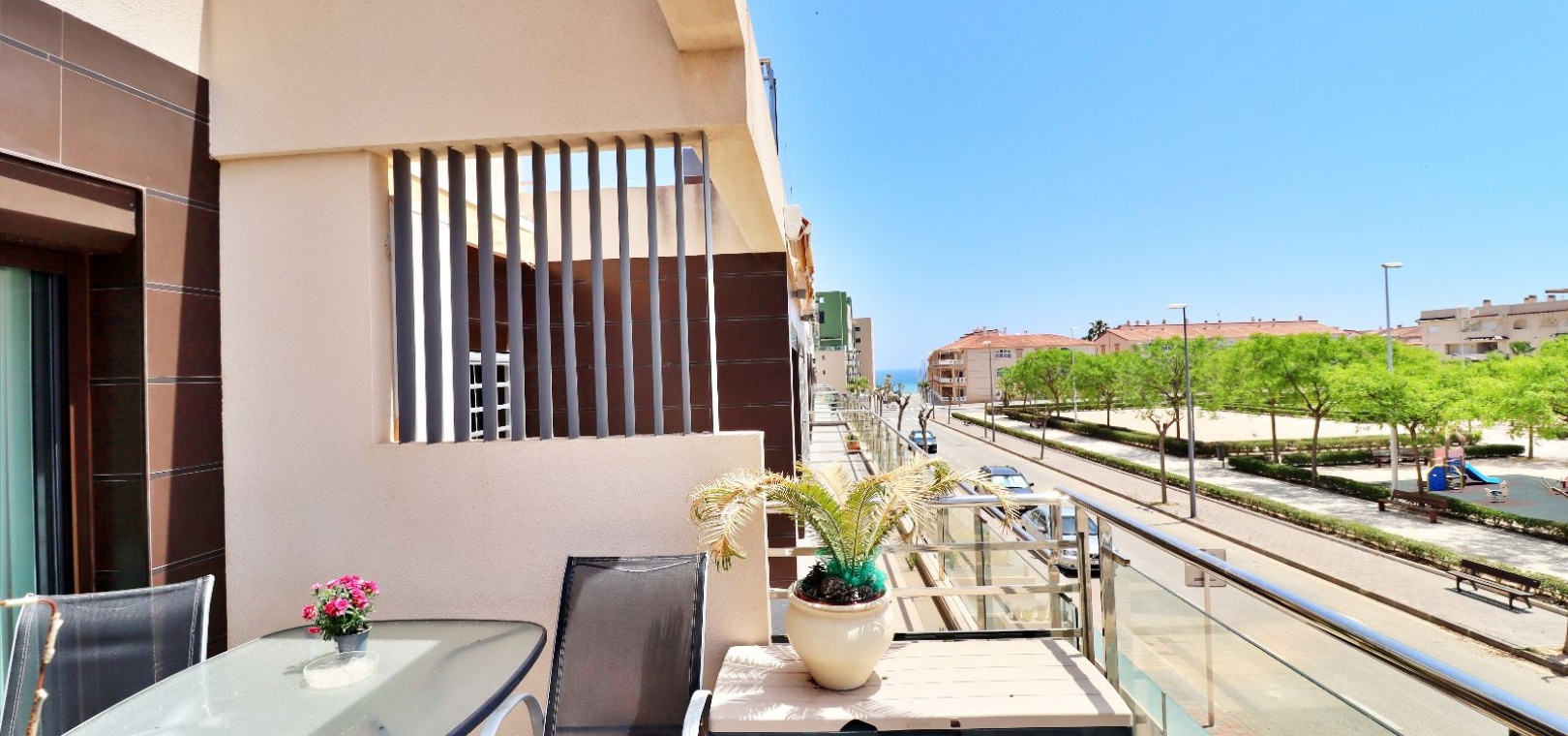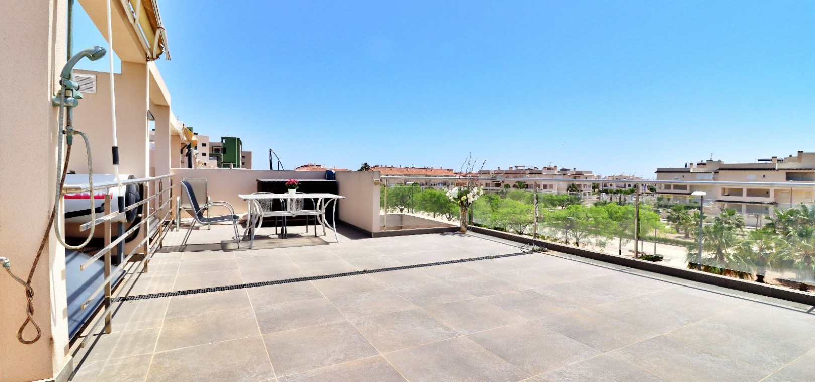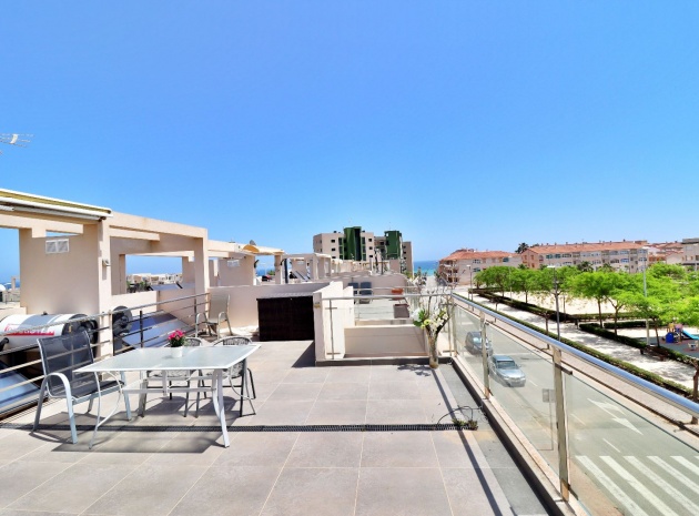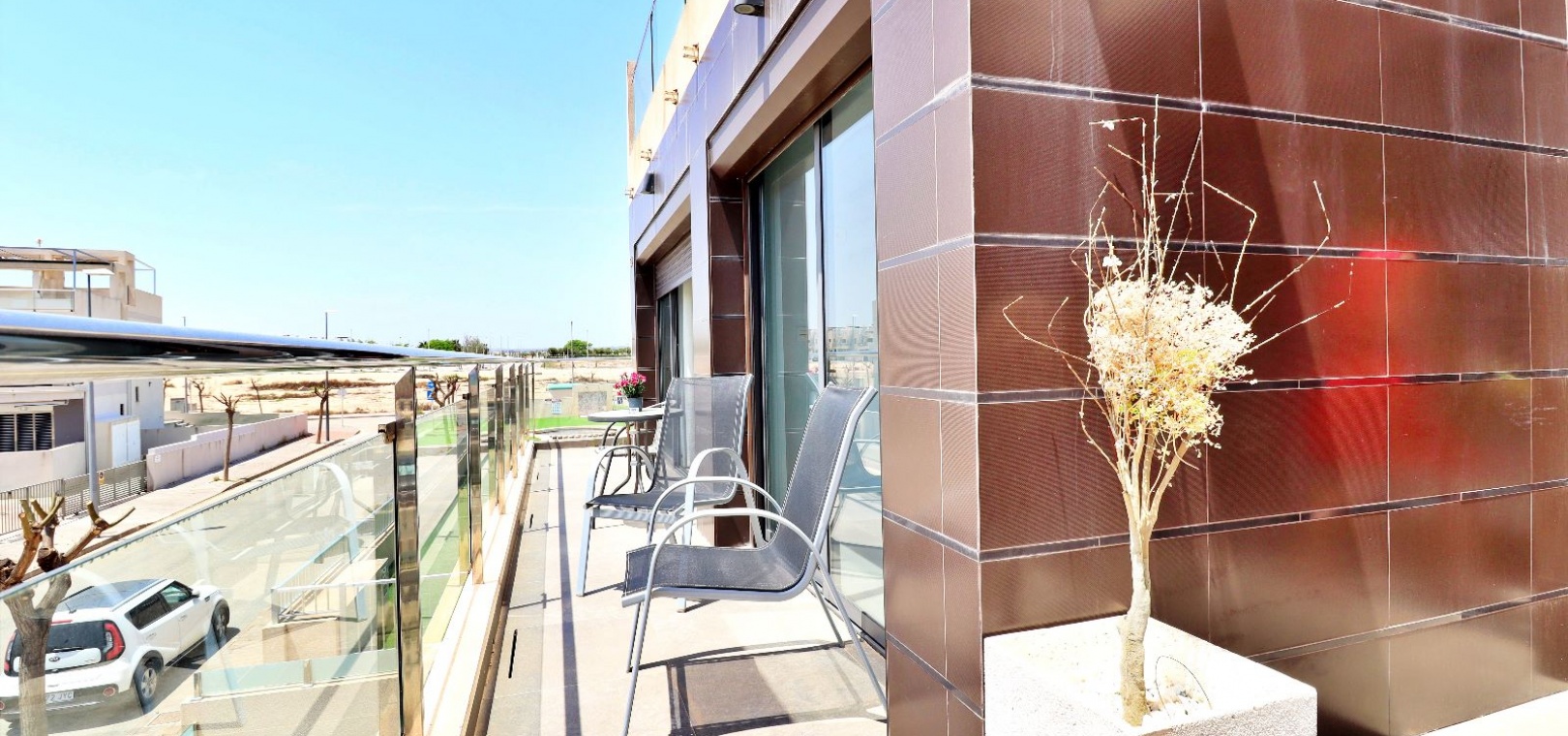 En ultramodern lägenhet med 2 sovrum och 1 badrum i söderläge på översta våningen med ett privat takterrass vid stranden Mil Palmeras, Costa Blanca.
