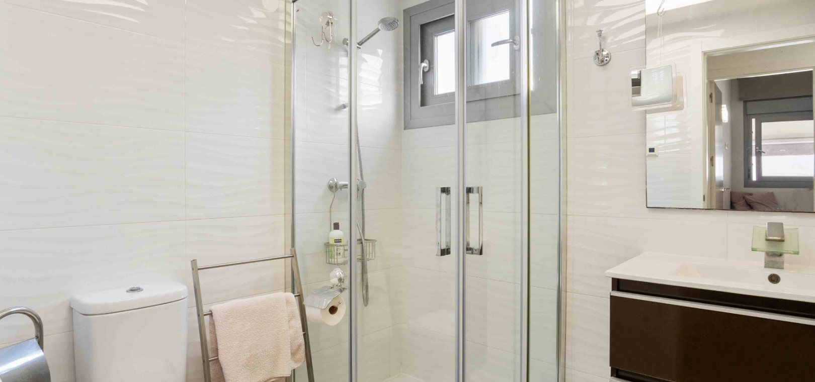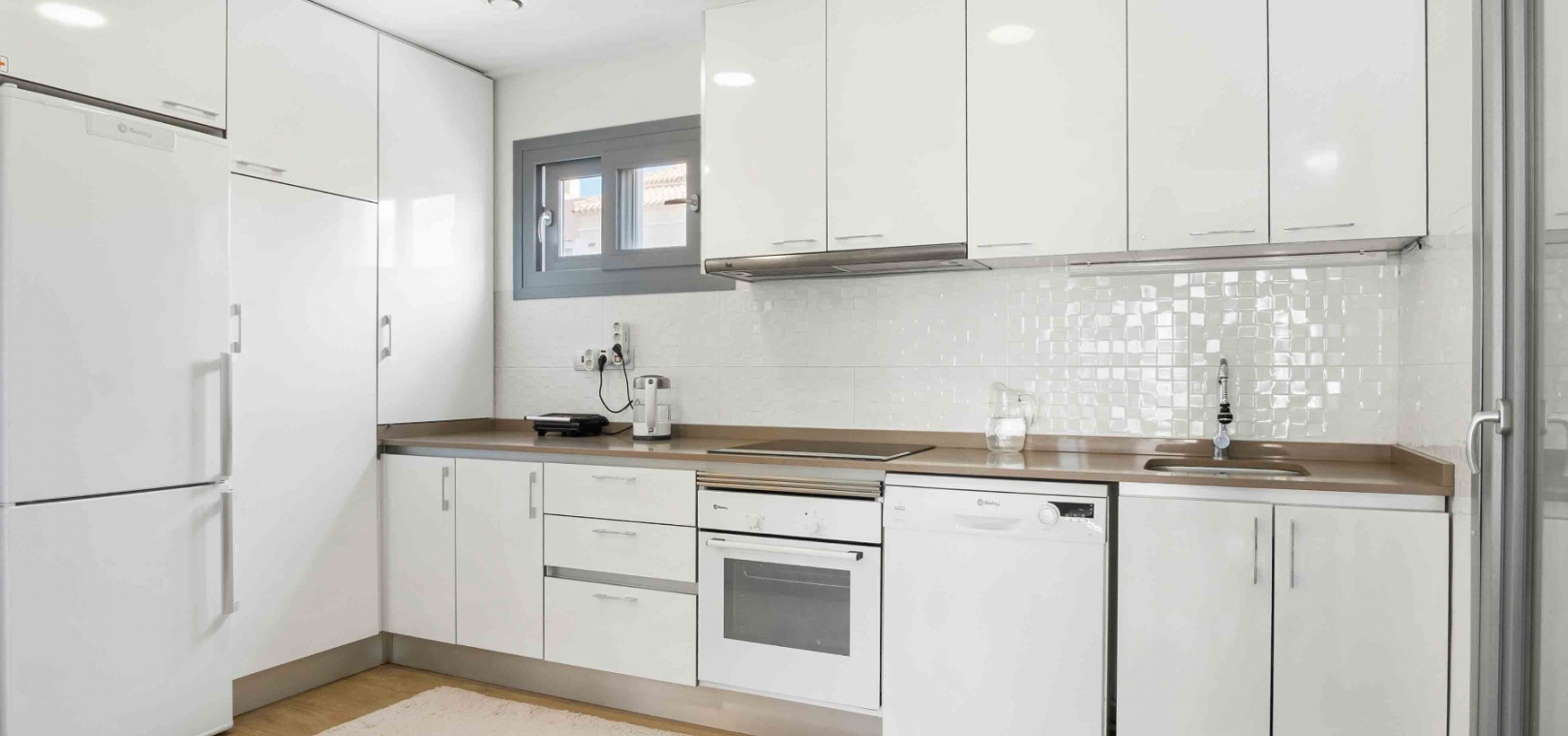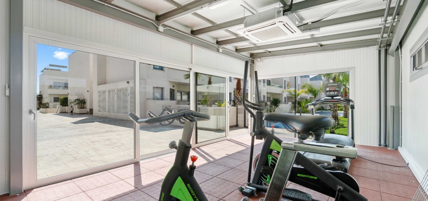 Vardagsrum/matsal, kök med öppen planlösning, 2 x dubbelrum med inbyggda garderober, 1 x familjebadrum, balkong med soltält, privat takterrass, gemensam pool, uppvärmd gemensam pool, gemensamt gym, underjordisk parkering och mycket mer.