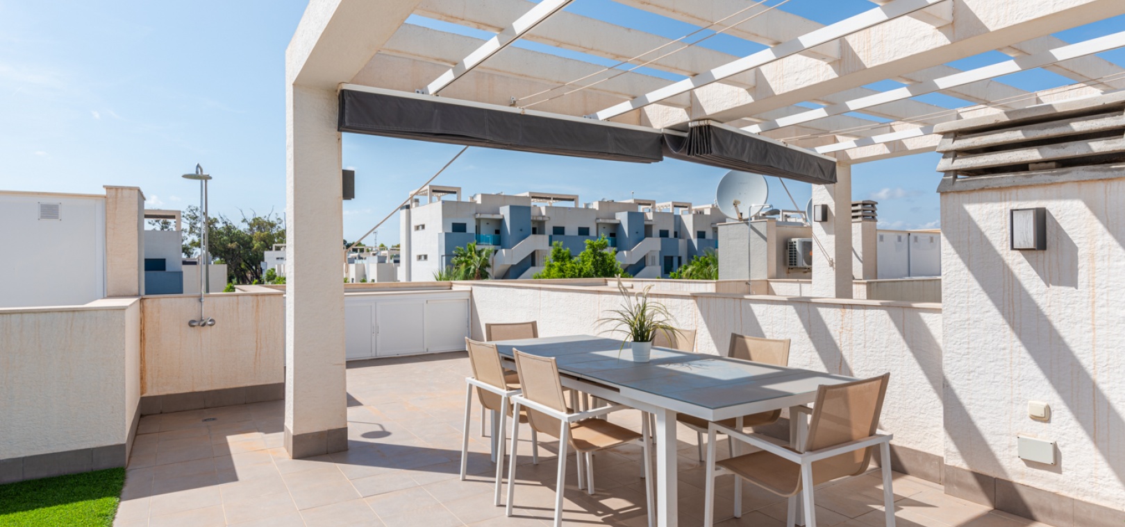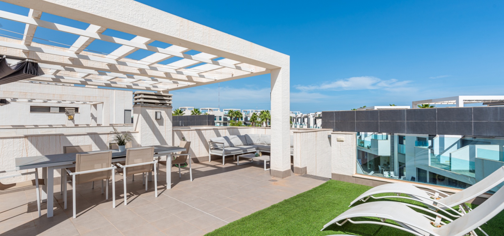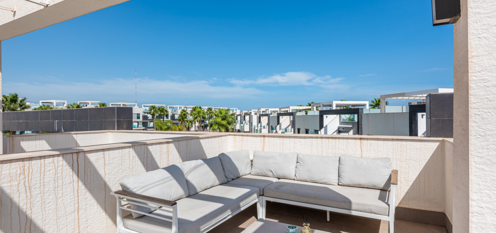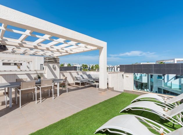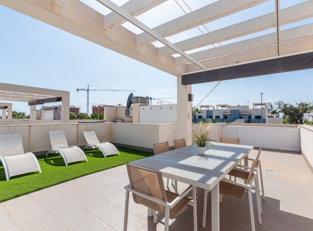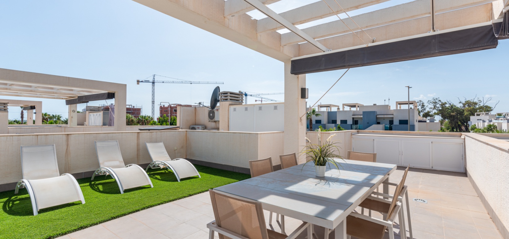 En lägenhet med 2 sovrum och 2 badrum i modern stil på översta våningen med ett privat takterrass belägen i Oasis Beach belägen på den populära urbaniseringen El Raso, Guardamar del Segura, Costa Blanca. Denna underbara fastighet säljs i mycket gott skick, säljs möblerad och består mycket kortfattat av följande:- Lounge/matsal, ett fullt utrustat kök med öppen planlösning i modern stil, 2 x dubbelrum med inbyggda garderober, det största sovrummet har ett eget badrum. svit duschrum & 1 x gästduschrum, balkong på 1:a våningen, stort privat taksolarium, gemensam pool och trädgård, en barnpark, boule, bastu och SPA. Den här fastigheten ligger på en säker gated community, med en underjordisk parkeringsplats och mycket mer. Denna fastighet ligger bara en kort promenad upp till det kommersiella området vid ingången till El Raso. Här hittar du en liten lanthandel, butiker, flera barer och restauranger och en regelbunden lokalbuss in till Guardamar. Guardamars gyllene stränder med blå flagg ligger bara 5 minuters bilresa bort. Alicantes flygplats ligger cirka 35 minuters bilresa bort och Murcia Corvera ligger cirka 50 minuters bilresa bort.