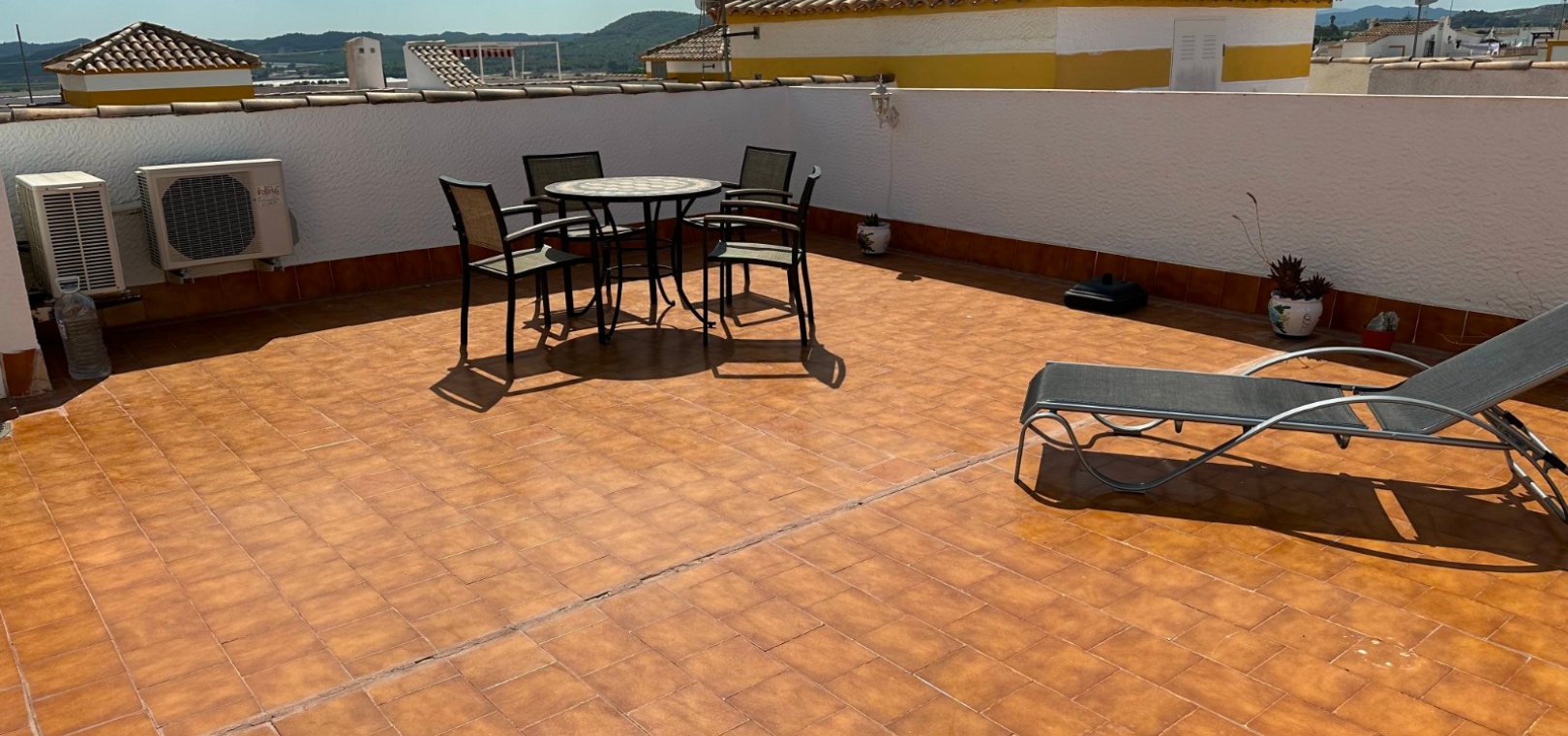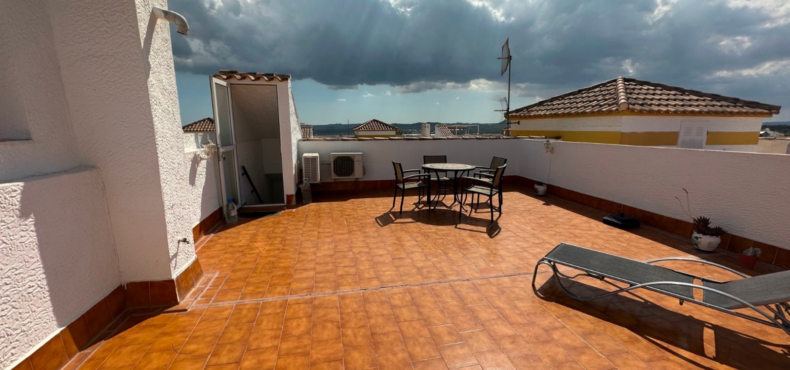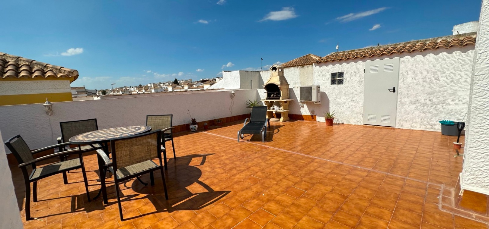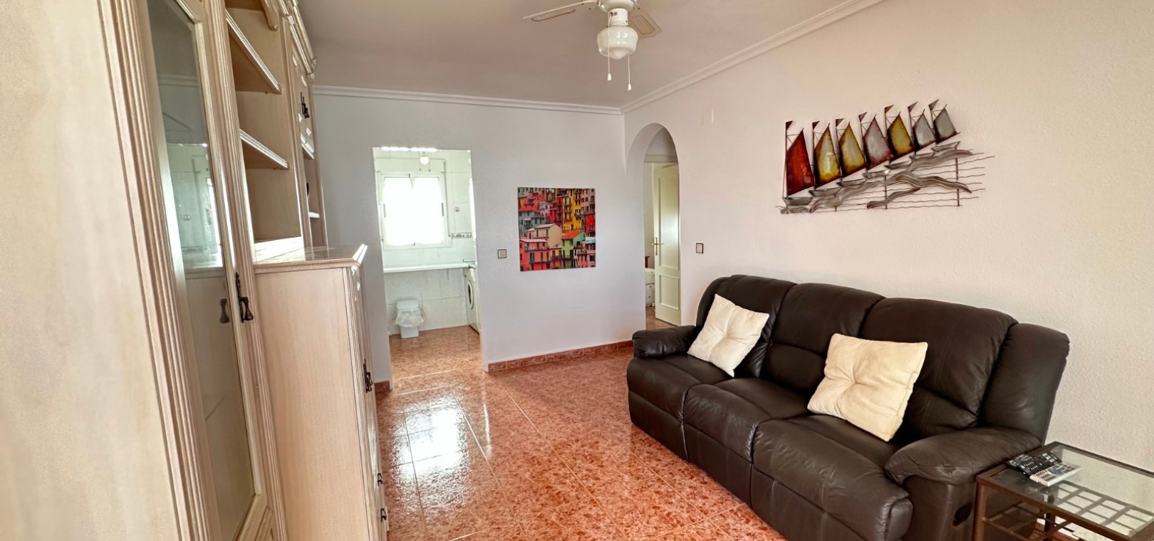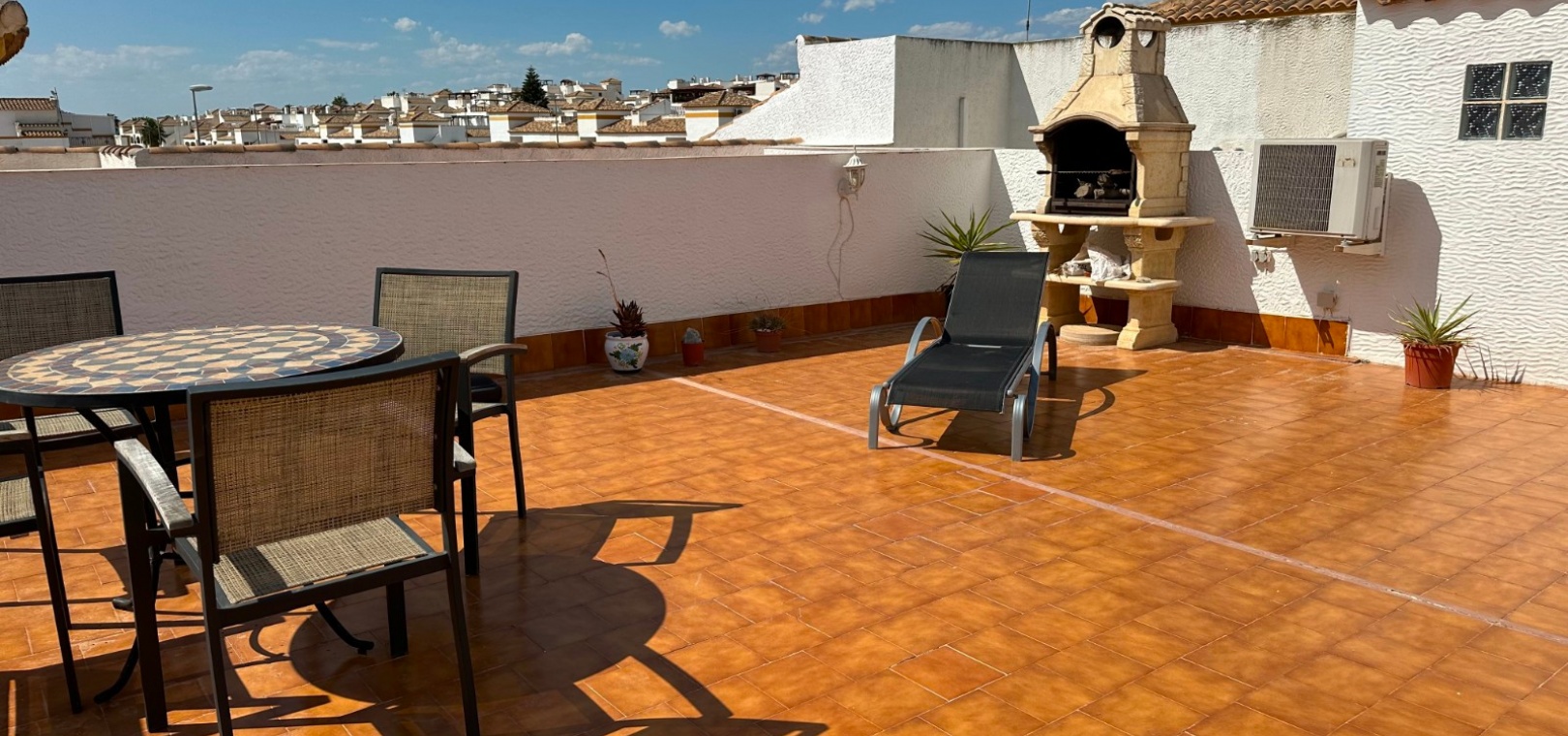 En lägenhet i söderläge med 2 sovrum och 1 badrum på översta våningen i Entre Naranjos (Vistabella Golf), Los Montesinos, Costa Blanca. Denna härliga fastighet säljs i gott skick, säljs möblerad och består mycket kortfattat av följande:- Lounge/matsal, separat fullt utrustat kök, 2 x dubbelrum båda med inbyggda garderober, ett av sovrummen har varmt och kallt A /C, 1 x familjebadrum, inglasad balkong utanför loungen, ett stort privat takterrass med ett förråd, 2 x härliga gemensamma pooler och gemensam parkering. Denna fastighet ligger bara några minuters promenad till två små kommersiella centra där du hittar barer, restauranger, ett apotek och en stor mataffär. Den nya golfbanan Vistabella ligger bara 500 meter bort. De vackra gyllene stränderna vid Guardamar ligger mindre än 20 minuters bilresa bort och det är cirka 35 minuters bilresa till Alicantes flygplats och Murcia Corvera flygplats ligger cirka 50 minuter bort.