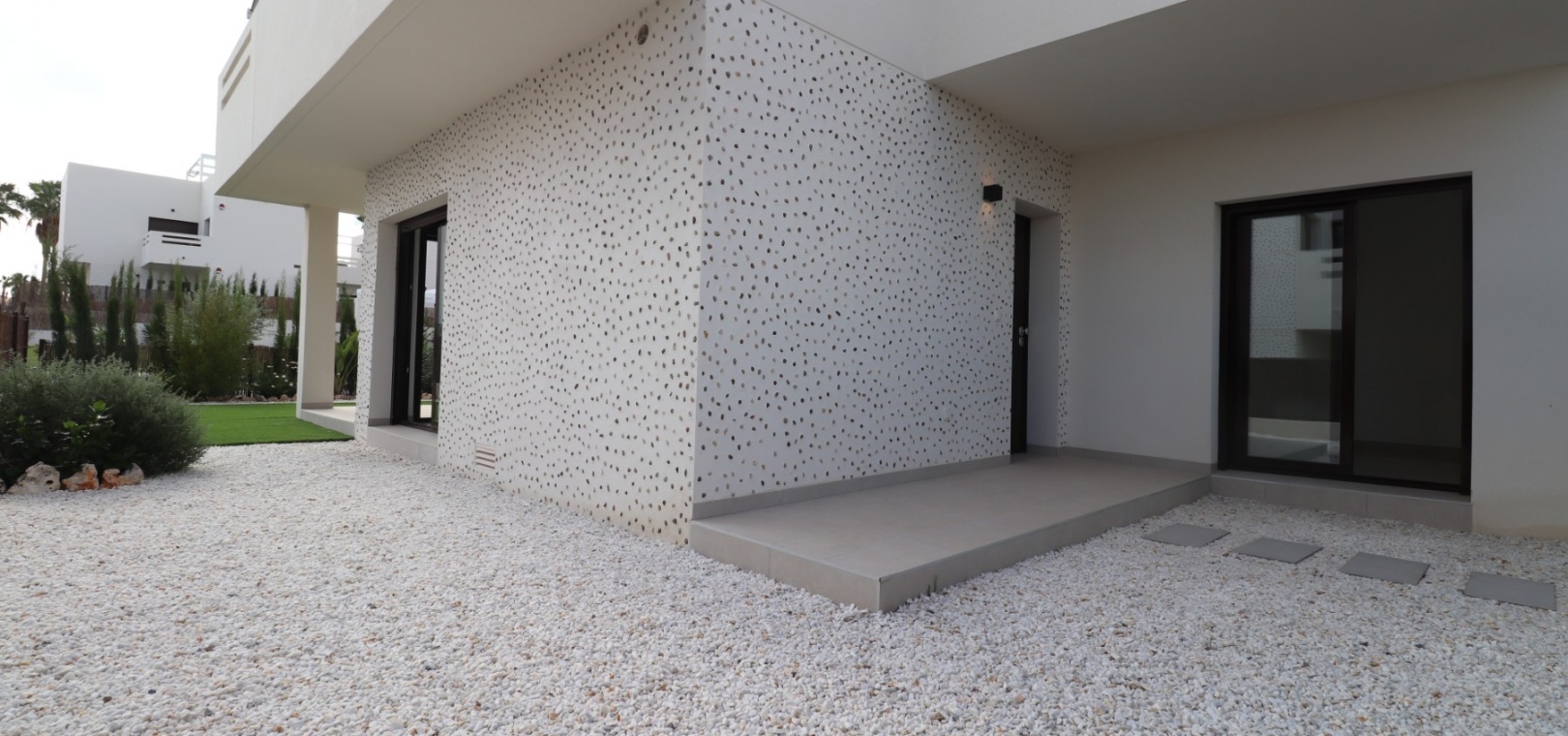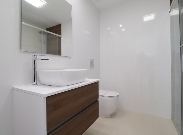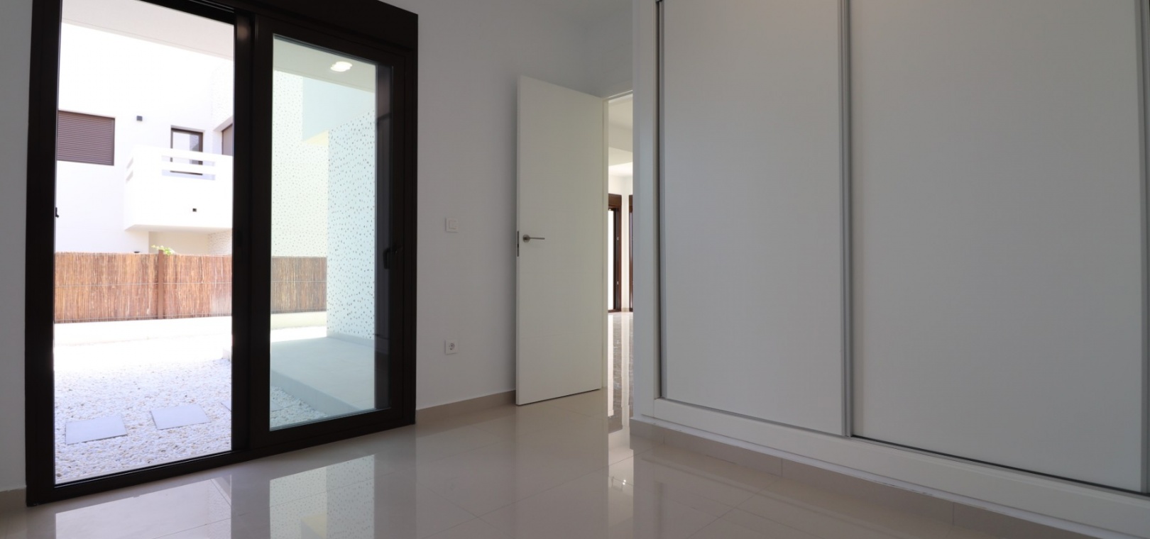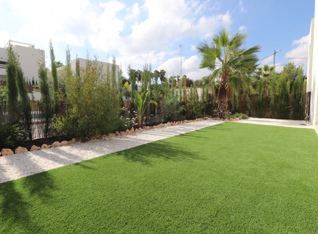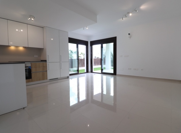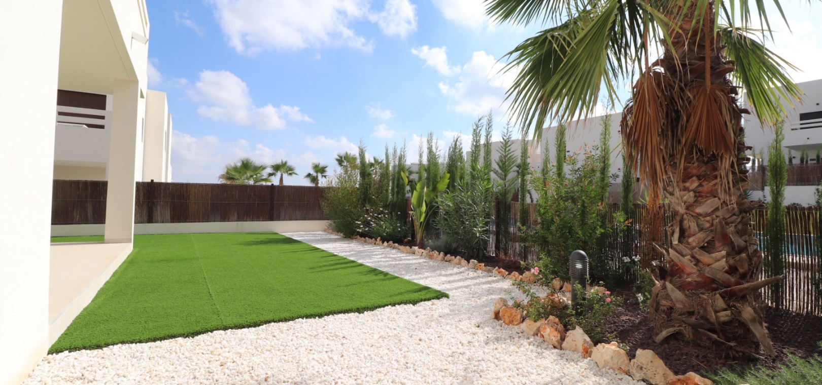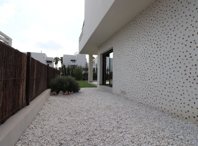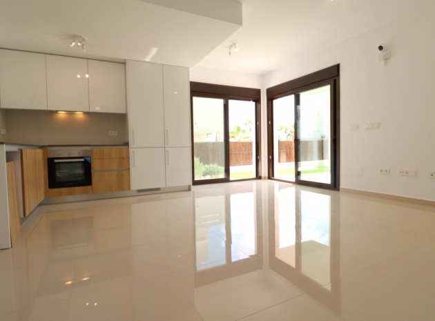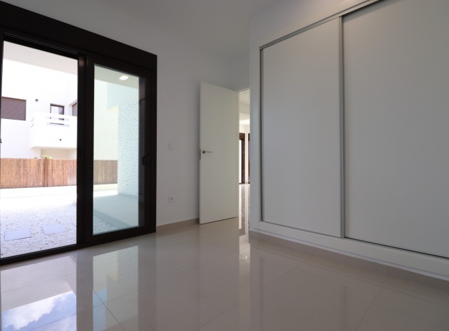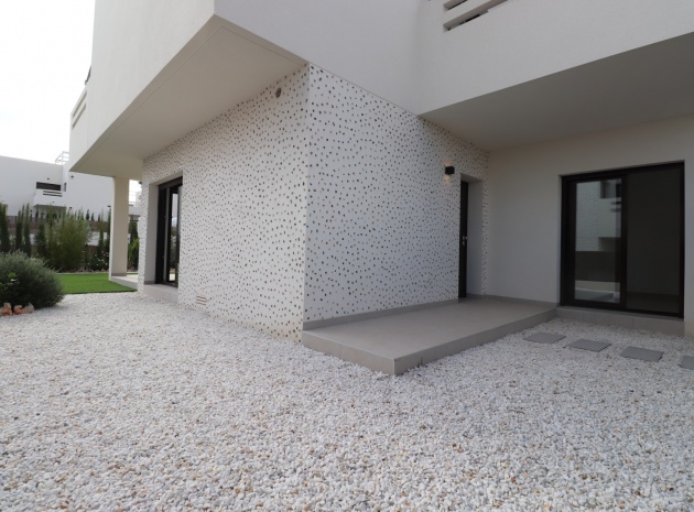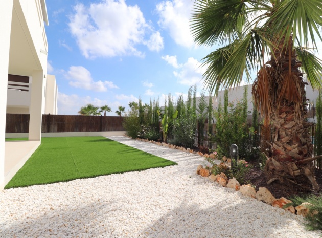 En sydostläge, nästan ny lägenhet med två sovrum, bottenvåningen i La Finca Golf, ett 5* hotell, spa och golfresort, beläget bara 4-5 minuters bilresa till olika populära restauranger, bistro, barer, butiker, som ligger på ingången till resorten. Den närmaste byn är Algorfa, med den stora staden Almoradí bara 5 minuters bilresa och Benijofar och Quesada 10 minuter. Kusten kan nås på 15-20 minuter. Lägenheten är bara 12 månader gammal och ligger i en säker gated community så erbjuder alla "nybyggda" kvaliteter och består av: rymlig täckt terrass; öppen planlösning med dubbla skjutdörrar som leder ut till trädgården; utrustat kök; två dubbelrum med inbyggda garderober, master med tillgång ut till trädgården och ett eget duschrum; ytterligare modernt familjeduschrum. Fastigheten upptar en fantastisk 224m2 anlagd tomt, som har klappats och lagts med konstgräs, med planterad bård. Det fantastiska modernt designade gemensamma poolområdet ligger framför fastigheten och extrafunktioner inkluderar förinstallerad luftkonditionering, elektriska persienner, CCTV, bevattningssystem.