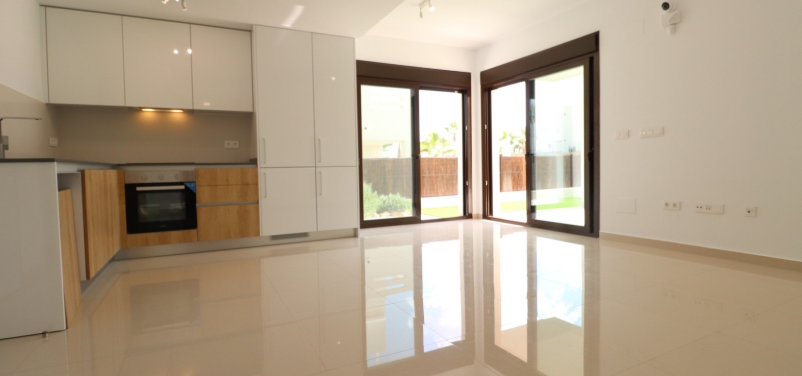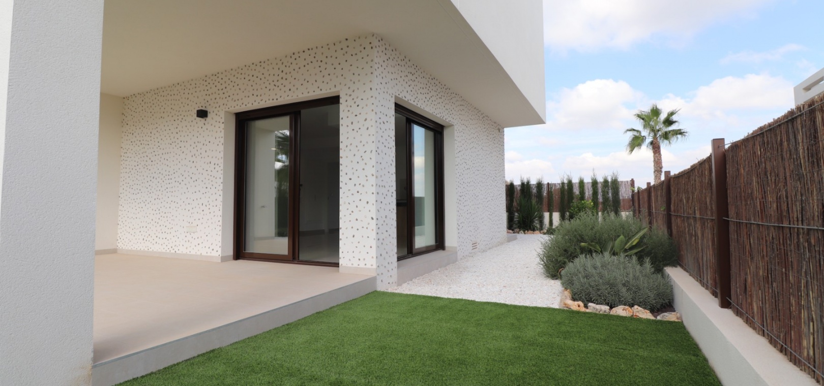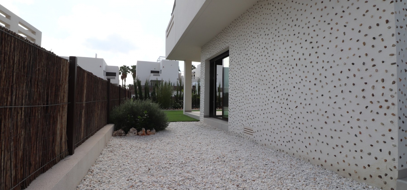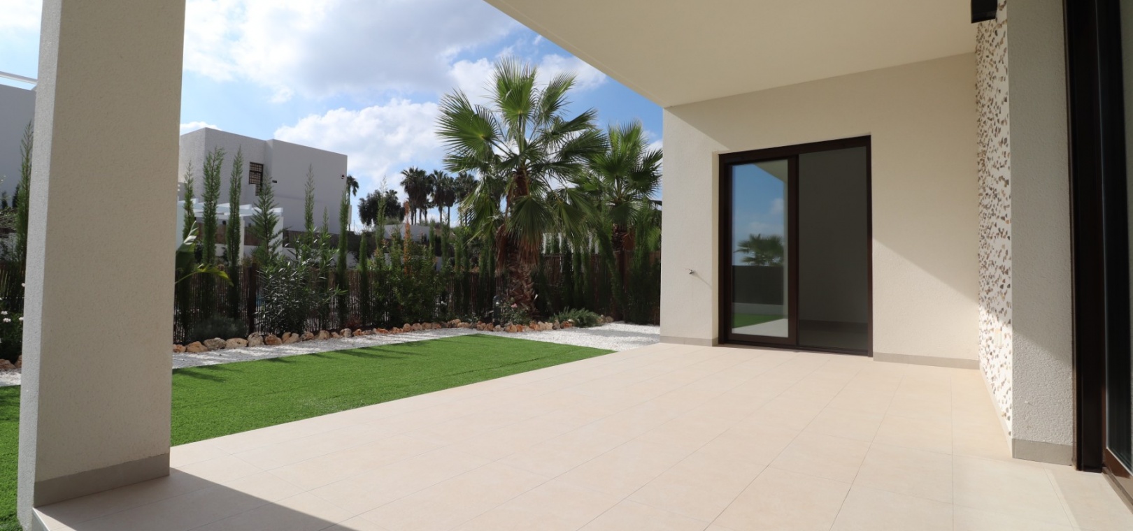 En sydostläge, nästan ny lägenhet med två sovrum, bottenvåningen i La Finca Golf, ett 5* hotell, spa och golfresort, beläget bara 4-5 minuters bilresa till olika populära restauranger, bistro, barer, butiker, som ligger på ingången till resorten. Den närmaste byn är Algorfa, med den stora staden Almoradí bara 5 minuters bilresa och Benijofar och Quesada 10 minuter. Kusten kan nås på 15-20 minuter. Lägenheten är bara 12 månader gammal och ligger i en säker gated community så erbjuder alla "nybyggda" kvaliteter och består av: rymlig täckt terrass; öppen planlösning med dubbla skjutdörrar som leder ut till trädgården; utrustat kök; två dubbelrum med inbyggda garderober, master med tillgång ut till trädgården och ett eget duschrum; ytterligare modernt familjeduschrum. Fastigheten upptar en fantastisk 224m2 anlagd tomt, som har klappats och lagts med konstgräs, med planterad bård. Det fantastiska modernt designade gemensamma poolområdet ligger framför fastigheten och extrafunktioner inkluderar förinstallerad luftkonditionering, elektriska persienner, CCTV, bevattningssystem.