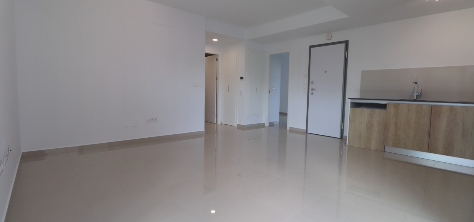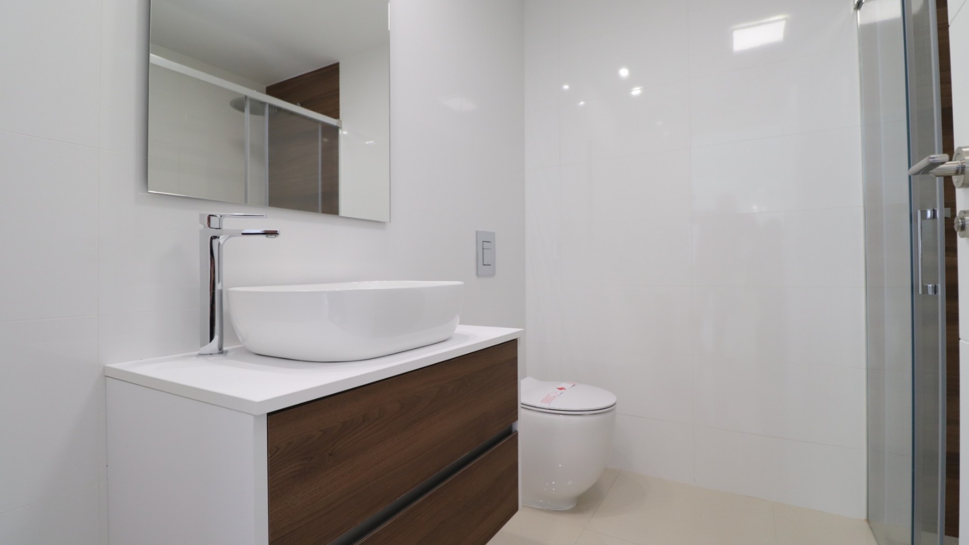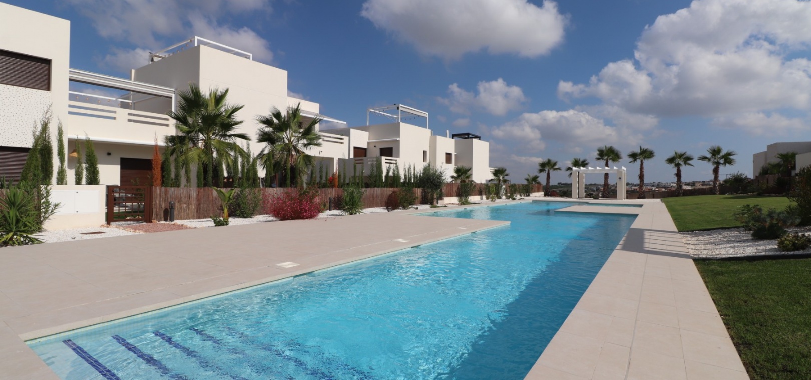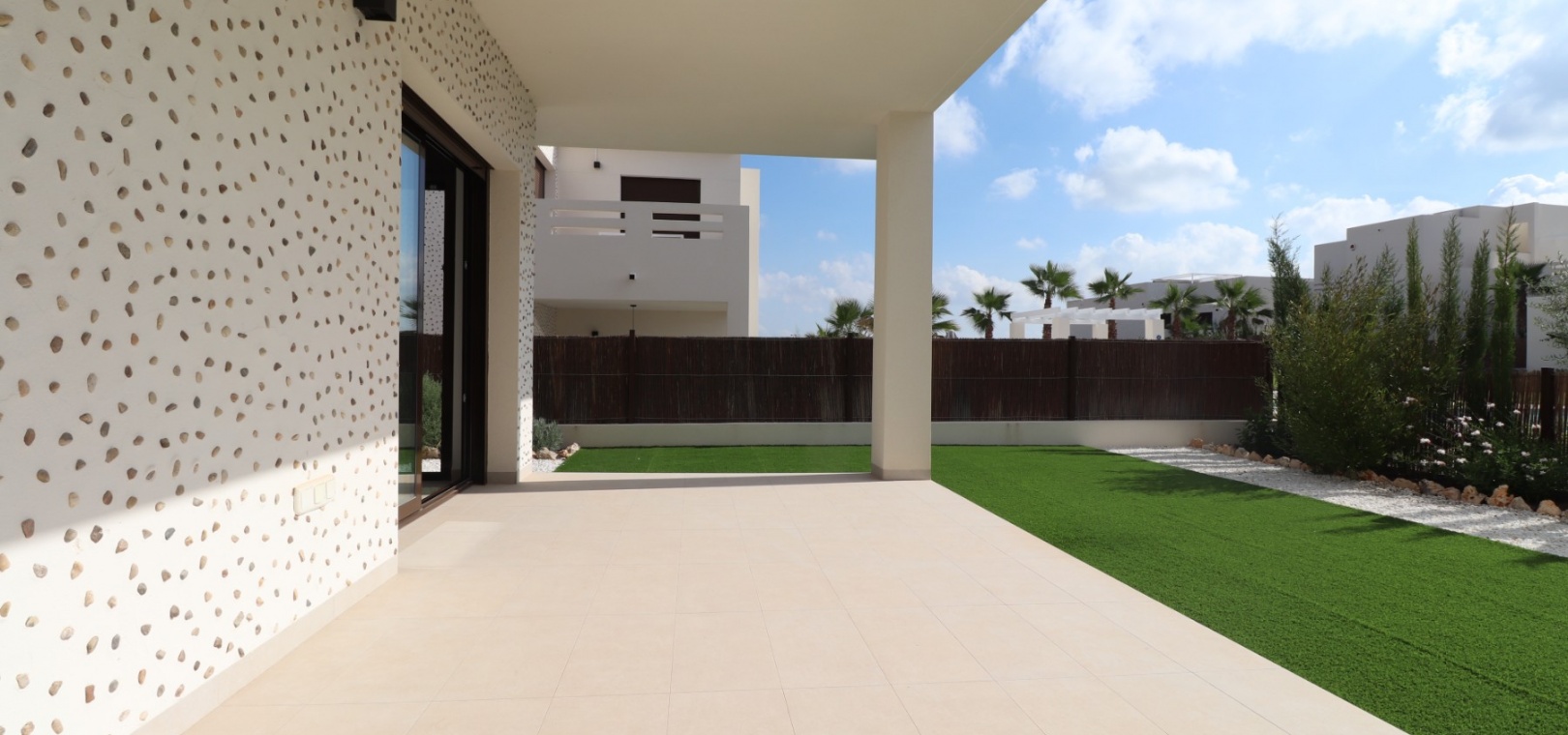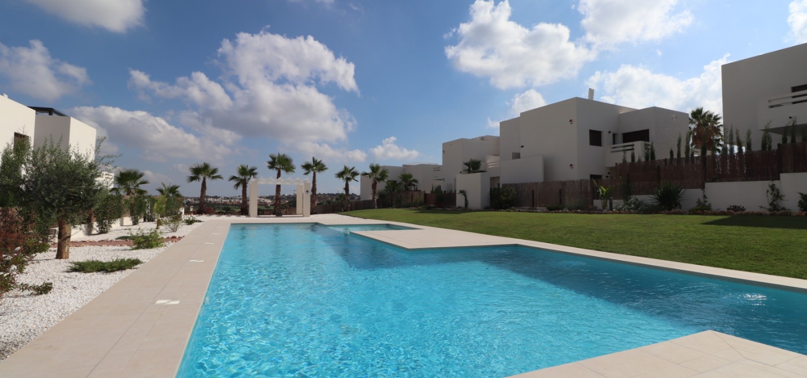 En sydostläge, nästan ny lägenhet med två sovrum, bottenvåningen i La Finca Golf, ett 5* hotell, spa och golfresort, beläget bara 4-5 minuters bilresa till olika populära restauranger, bistro, barer, butiker, som ligger på ingången till resorten. Den närmaste byn är Algorfa, med den stora staden Almoradí bara 5 minuters bilresa och Benijofar och Quesada 10 minuter. Kusten kan nås på 15-20 minuter. Lägenheten är bara 12 månader gammal och ligger i en säker gated community så erbjuder alla "nybyggda" kvaliteter och består av: rymlig täckt terrass; öppen planlösning med dubbla skjutdörrar som leder ut till trädgården; utrustat kök; två dubbelrum med inbyggda garderober, master med tillgång ut till trädgården och ett eget duschrum; ytterligare modernt familjeduschrum. Fastigheten upptar en fantastisk 224m2 anlagd tomt, som har klappats och lagts med konstgräs, med planterad bård. Det fantastiska modernt designade gemensamma poolområdet ligger framför fastigheten och extrafunktioner inkluderar förinstallerad luftkonditionering, elektriska persienner, CCTV, bevattningssystem.
