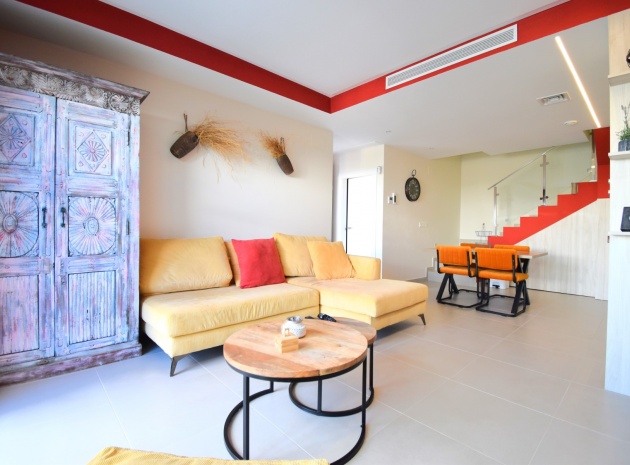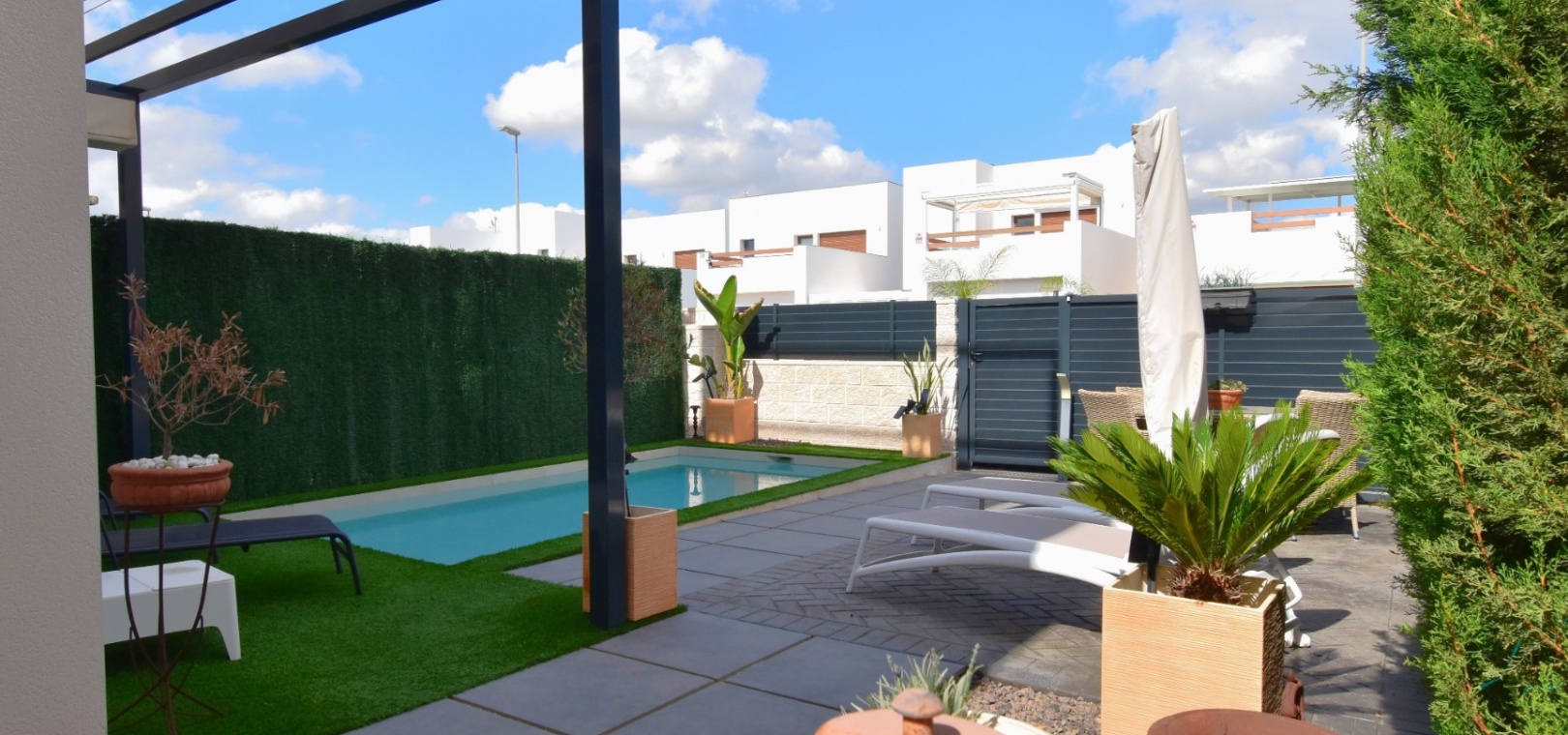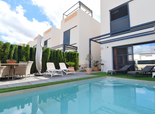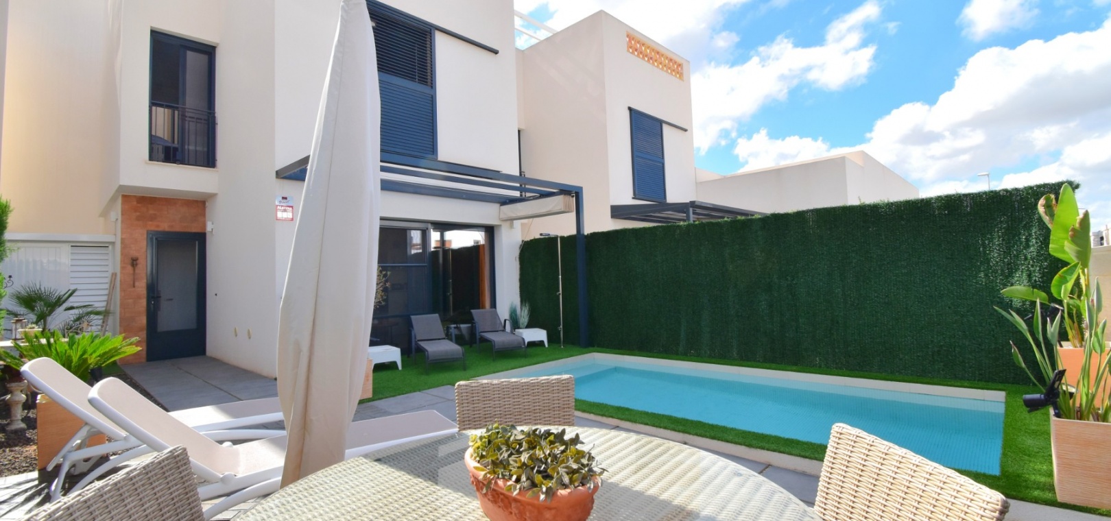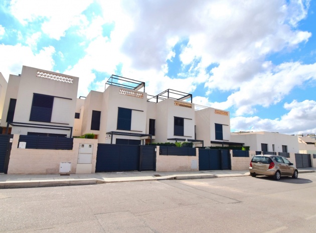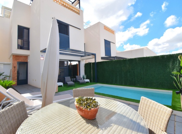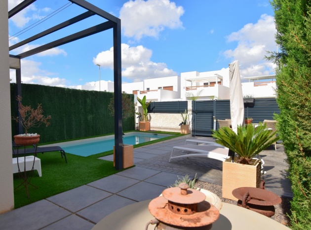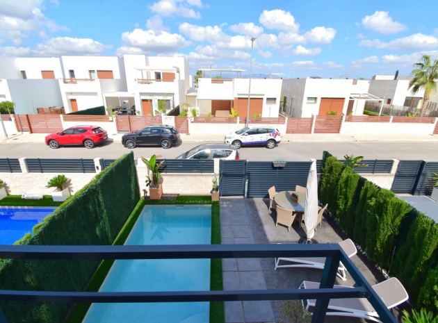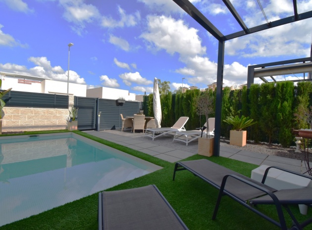 Denna nästan nya, fristående villa med två sovrum, i Benijofar, ligger i utkanten av staden men ändå bara fem-tio minuters promenad till centrum. Benijofar erbjuder stormarknader, apotek, bageri, bank, affärer, barer, restauranger (inklusive McDonalds), skola, vårdcentral, kommunal idrottsplats och pool. Närmaste strand kan nås på tio minuters bilresa, med närmaste golfbana kurs på La Marquesa, bara fem minuter bort. Denna moderna fastighet som byggdes för bara tre år sedan erbjuder vardagsrum med öppen planlösning, med trappor som leder upp till första våningen och breda skjutdörrar som leder ut till trädgården; köksdel som är anpassad till en modern spec, dörr som leder utanför; familjens duschrum. På första våningen finns två dubbelrum och ytterligare ett modernt duschrum; fantastiskt stort solarium, delvis lagt med konstgräs, kök/grillplats. Trädgården har anlagts med asfalterad biltillgång, privat pool med konstgräs. Extra som ingår i detta vackra hem inkluderar luftkonditionering, elektriska persienner, elektrisk grind, bevattningssystem, förråd.