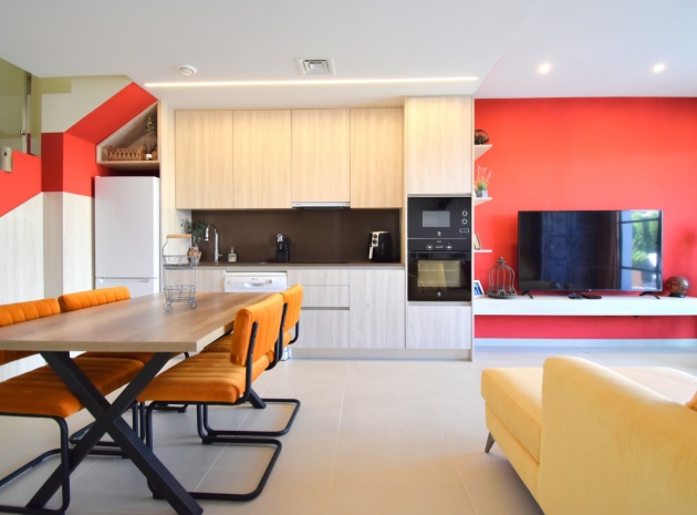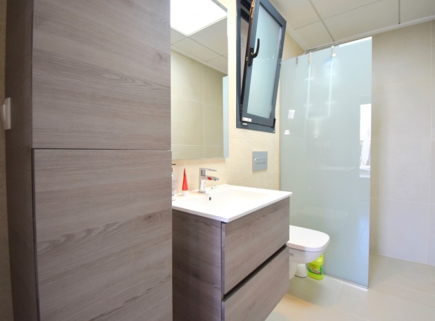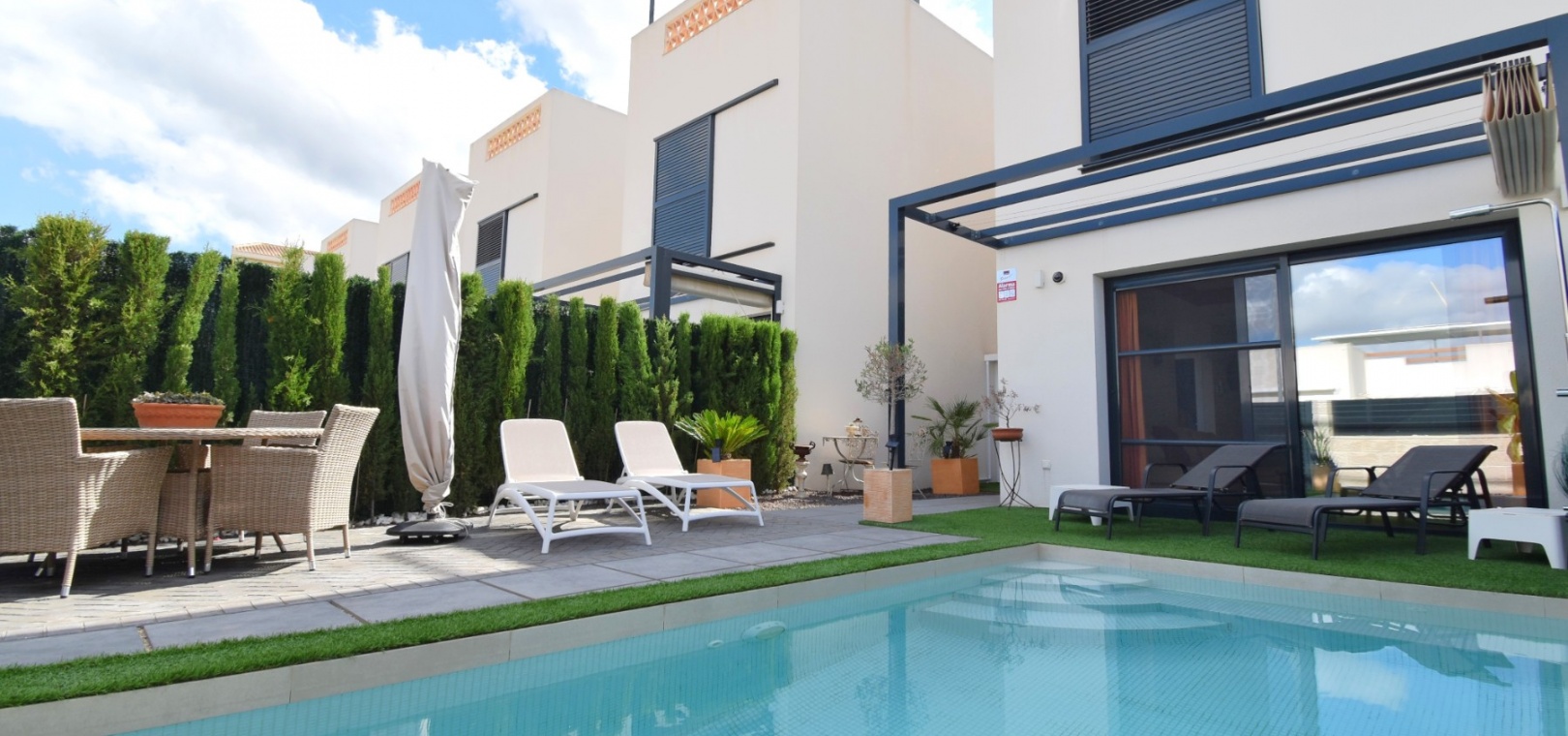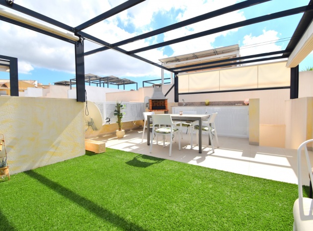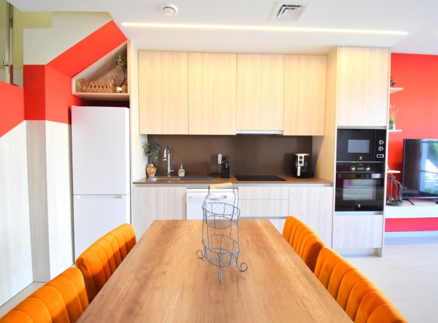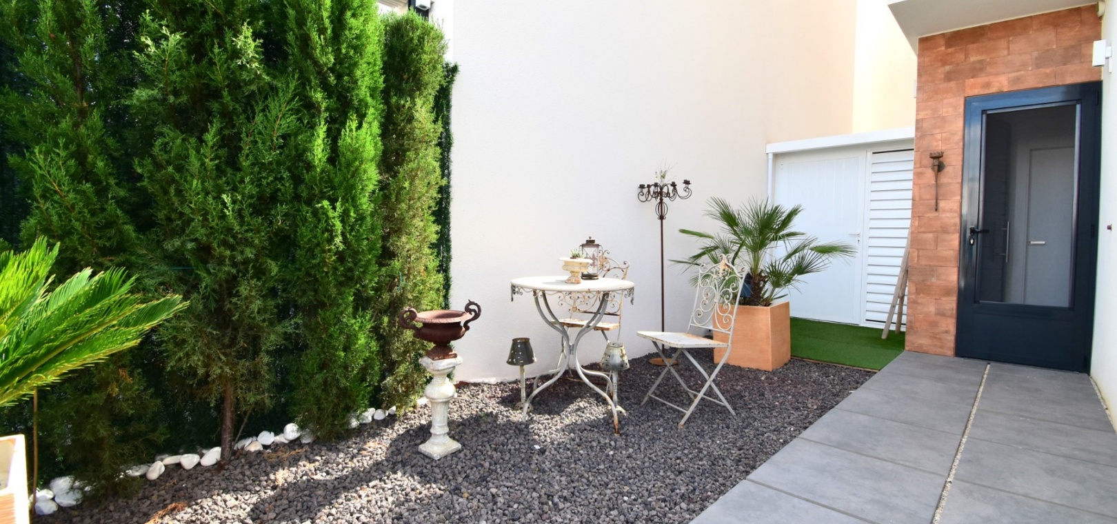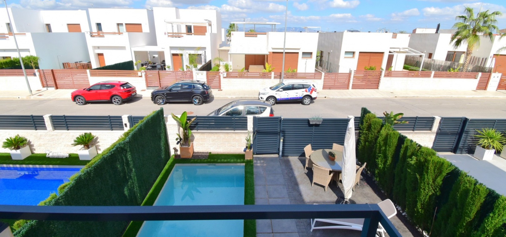 Denna nästan nya, fristående villa med två sovrum, i Benijofar, ligger i utkanten av staden men ändå bara fem-tio minuters promenad till centrum. Benijofar erbjuder stormarknader, apotek, bageri, bank, affärer, barer, restauranger (inklusive McDonalds), skola, vårdcentral, kommunal idrottsplats och pool. Närmaste strand kan nås på tio minuters bilresa, med närmaste golfbana kurs på La Marquesa, bara fem minuter bort. Denna moderna fastighet som byggdes för bara tre år sedan erbjuder vardagsrum med öppen planlösning, med trappor som leder upp till första våningen och breda skjutdörrar som leder ut till trädgården; köksdel som är anpassad till en modern spec, dörr som leder utanför; familjens duschrum. På första våningen finns två dubbelrum och ytterligare ett modernt duschrum; fantastiskt stort solarium, delvis lagt med konstgräs, kök/grillplats. Trädgården har anlagts med asfalterad biltillgång, privat pool med konstgräs. Extra som ingår i detta vackra hem inkluderar luftkonditionering, elektriska persienner, elektrisk grind, bevattningssystem, förråd.