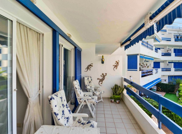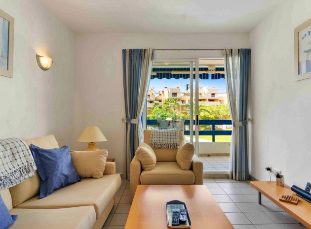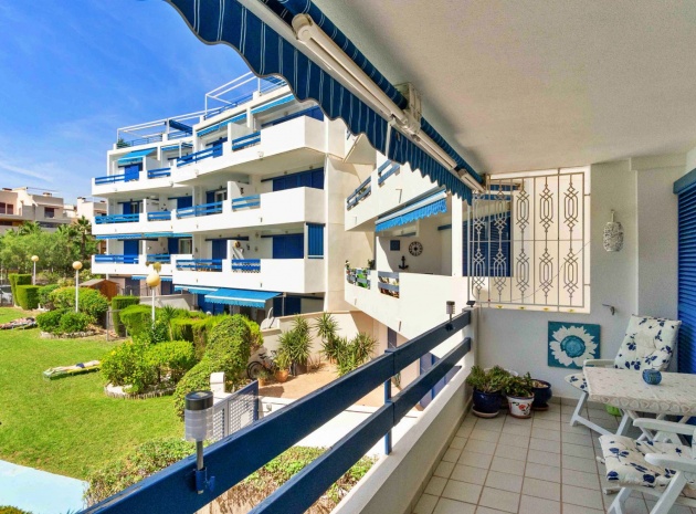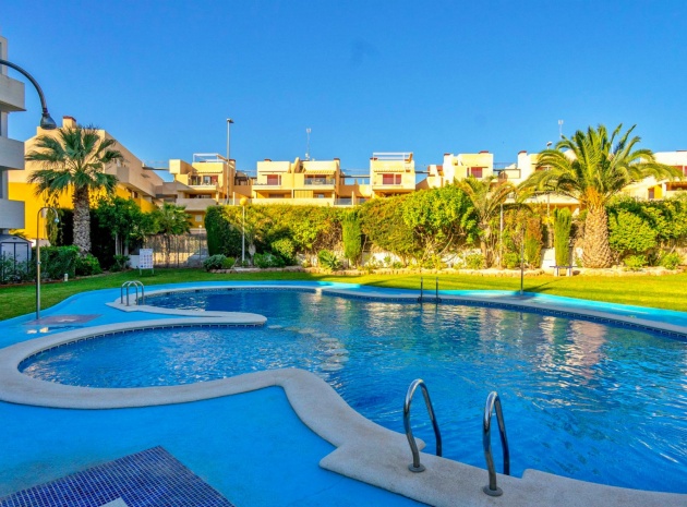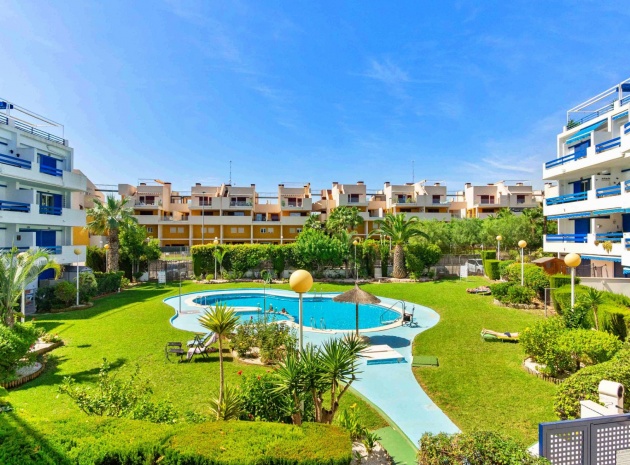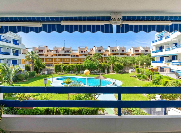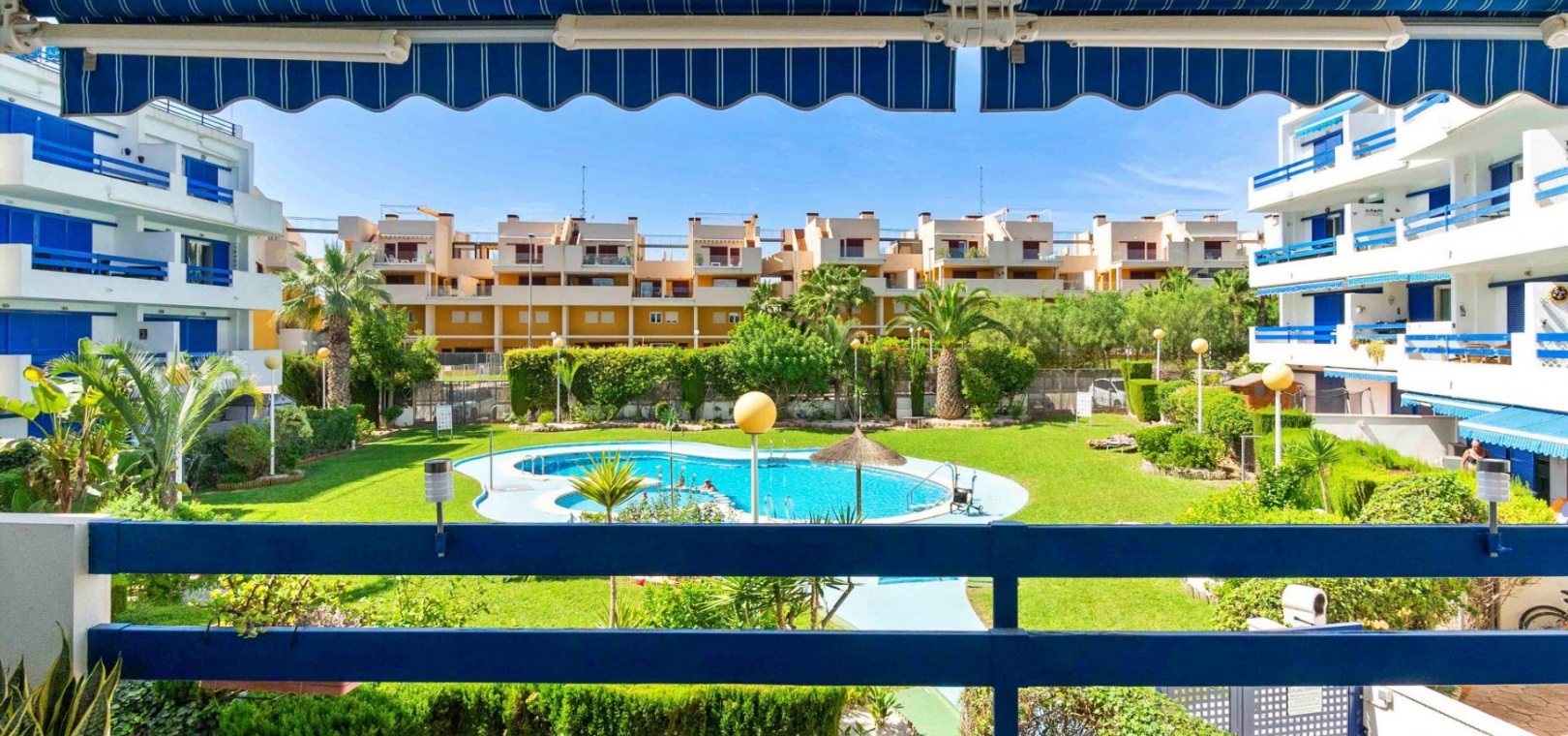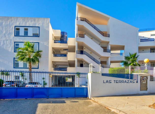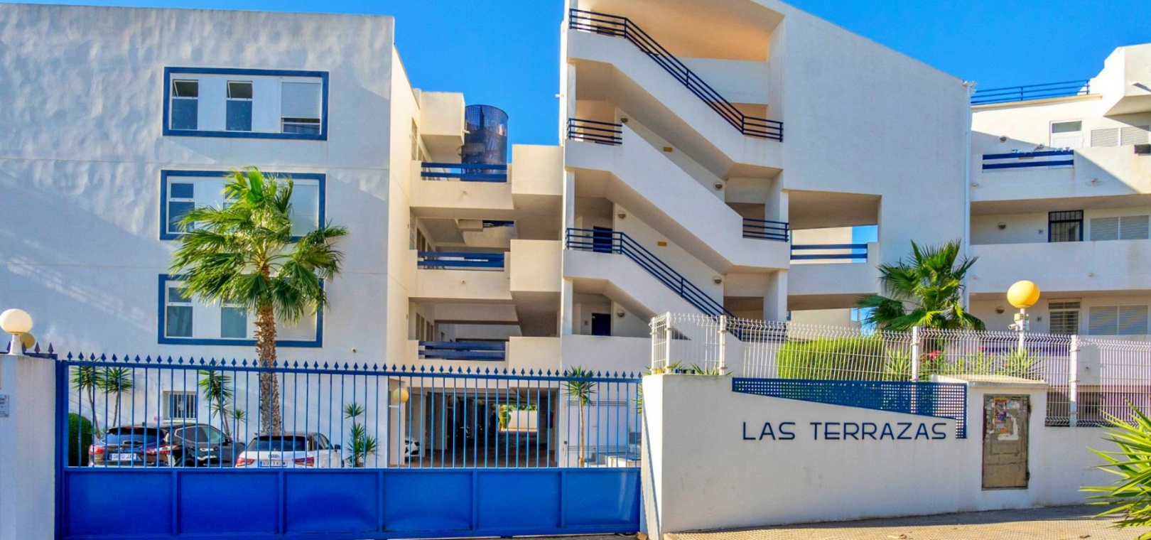 En lägenhet med 2 sovrum och 2 badrum på 1:a våningen som vetter mot väster bara 500 meter från havet, belägen i det moderna säkra gated komplexet Las Terrazas, Playa Flamenca, Costa Blanca.
