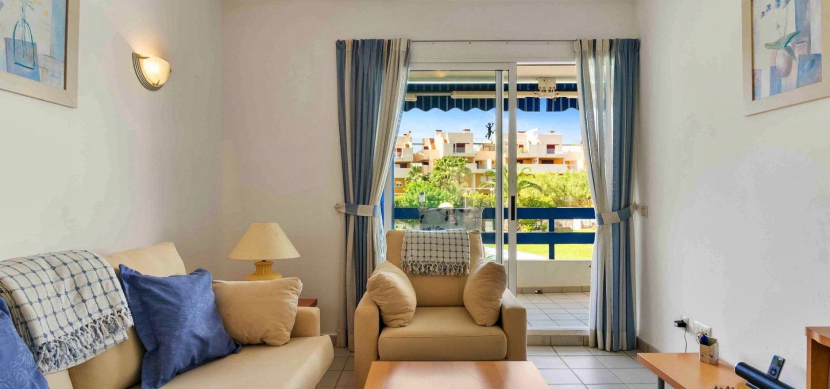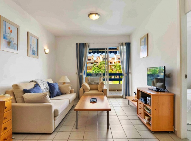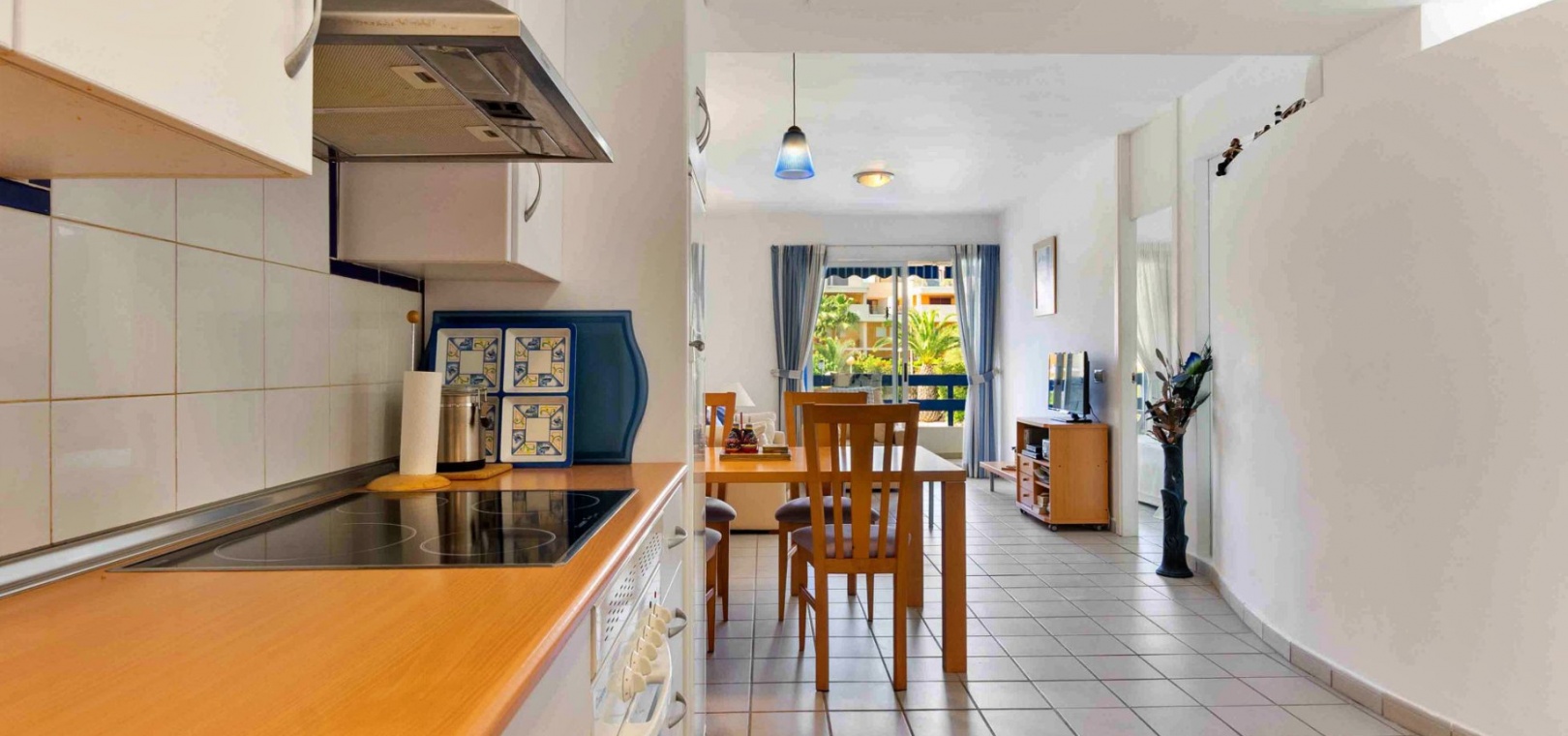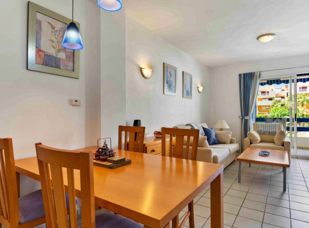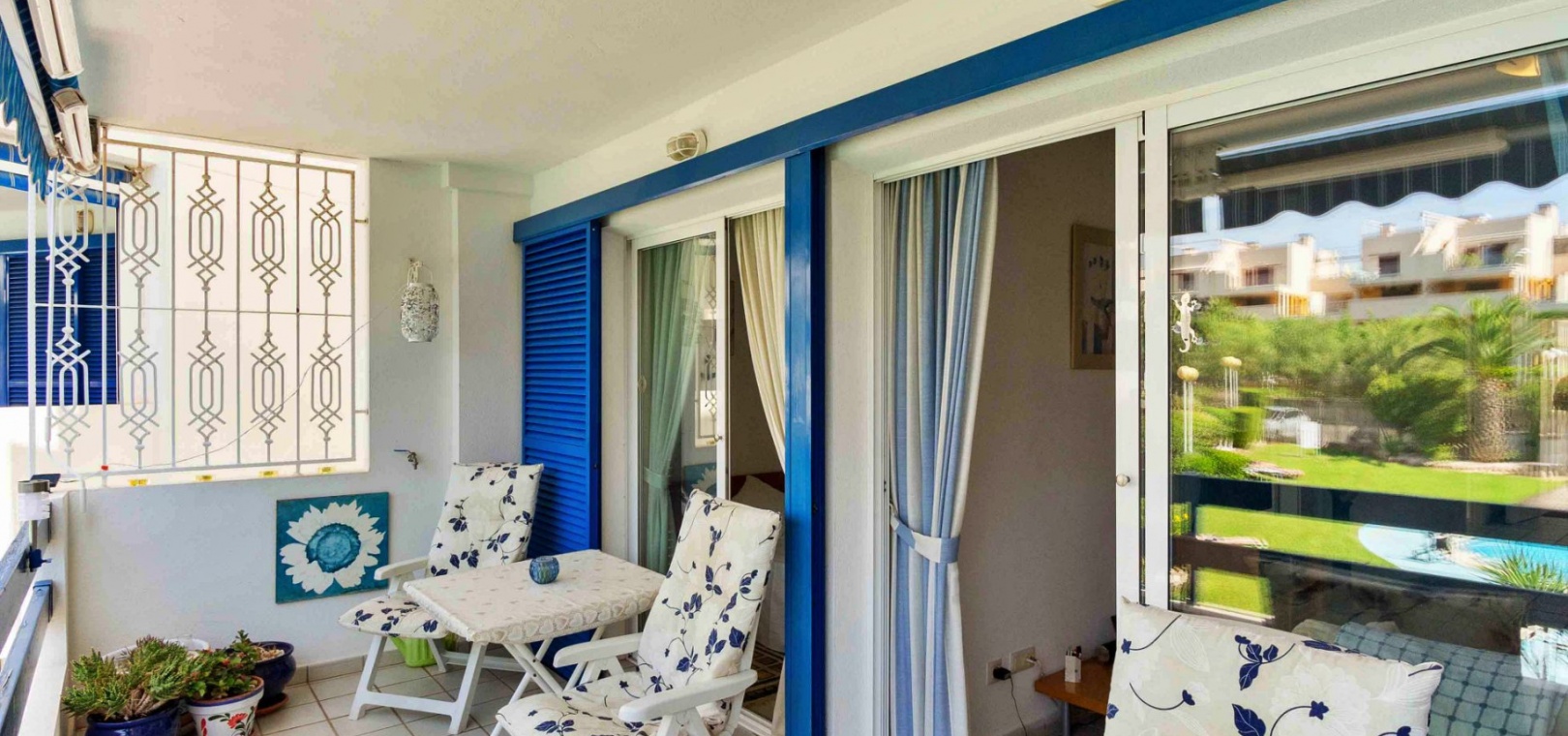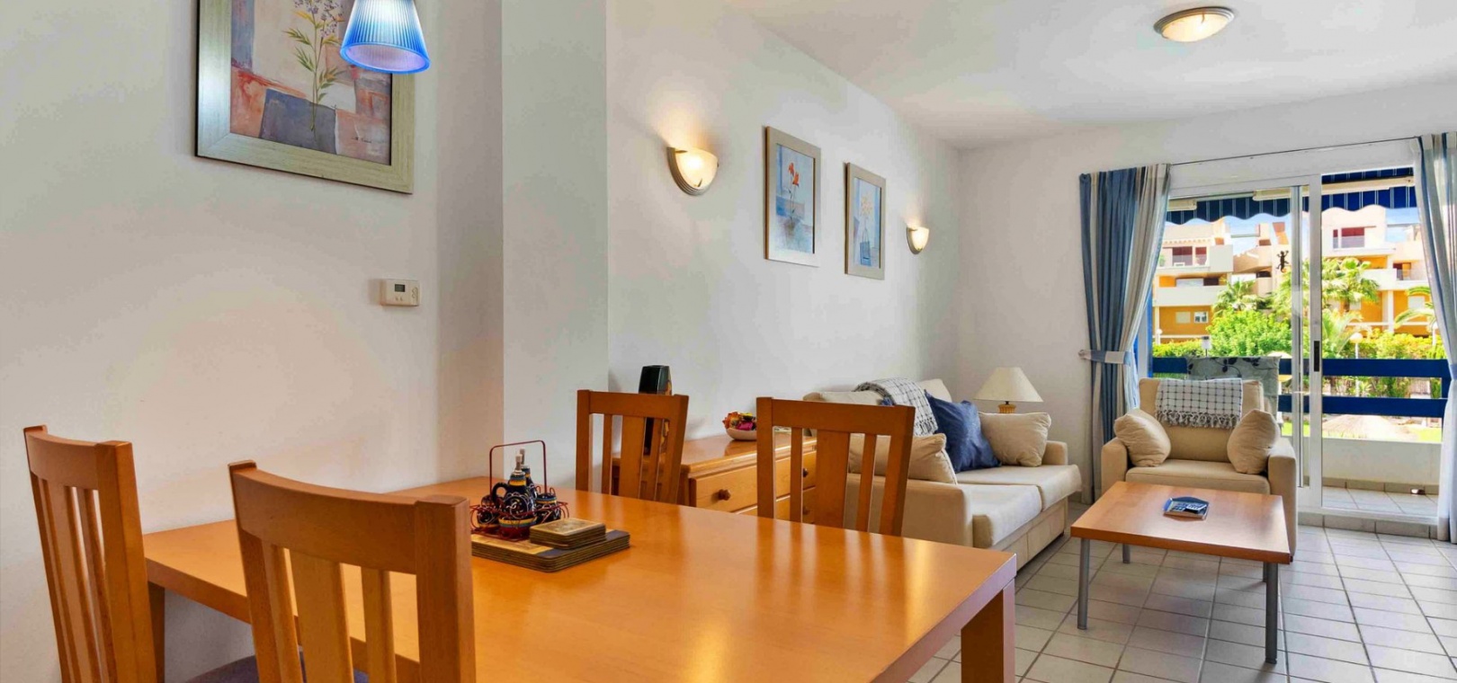 När du går in i lägenheten finns ett öppet kök som leder till ett vardagsrum / matsal med altandörrar ut till den stora balkongen med utsikt över den gemensamma poolen, 2 x dubbelrum båda med inbyggda garderober och badrum med golvvärme , ett separat verktyg/förvaringsområde och härlig gemensam pool och trädgårdar.
