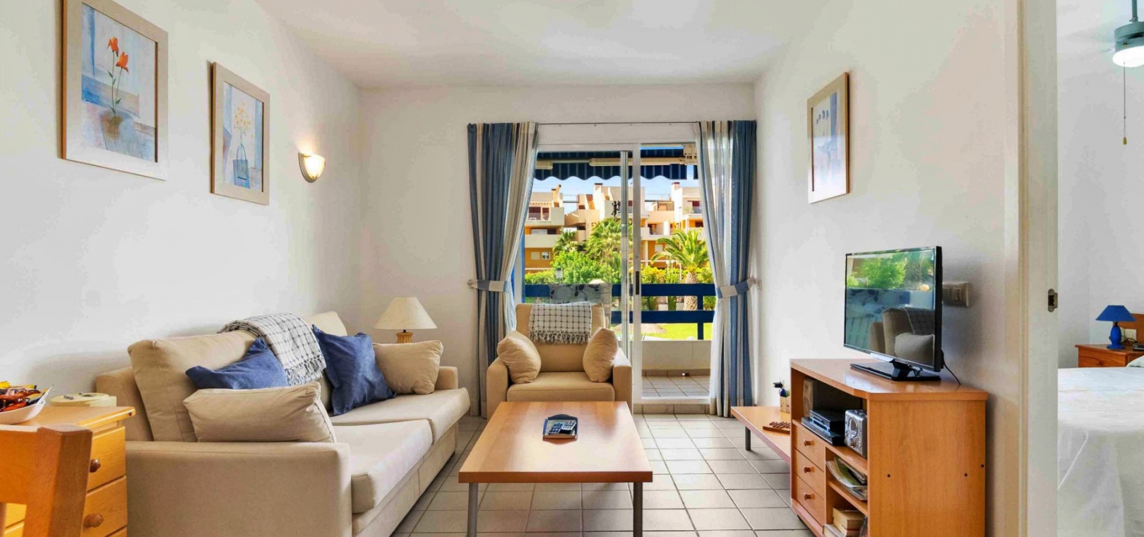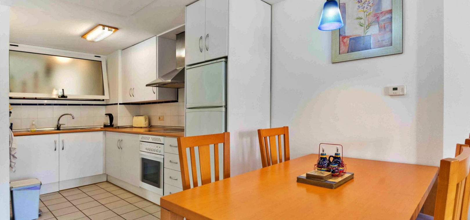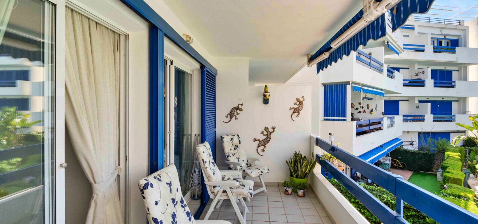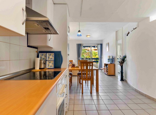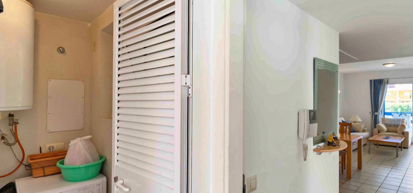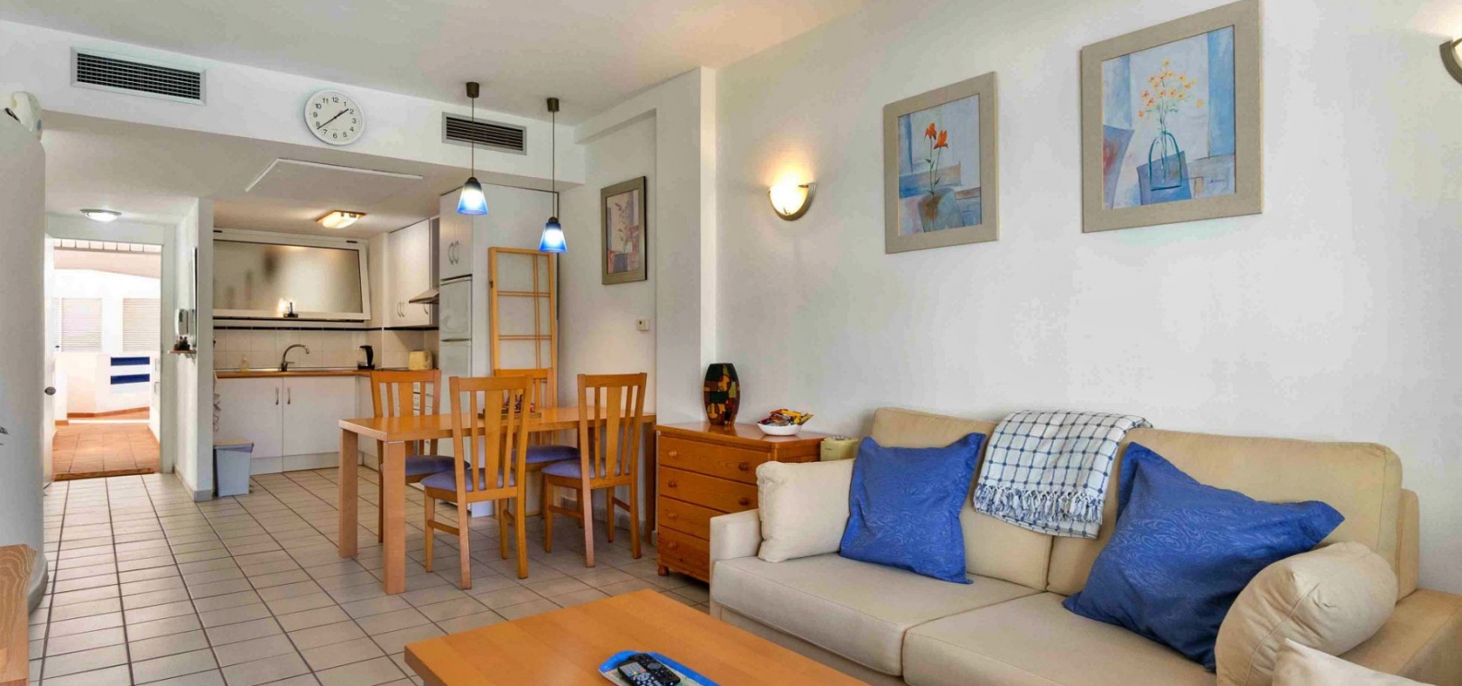 När du går in i lägenheten finns ett öppet kök som leder till ett vardagsrum / matsal med altandörrar ut till den stora balkongen med utsikt över den gemensamma poolen, 2 x dubbelrum båda med inbyggda garderober och badrum med golvvärme , ett separat verktyg/förvaringsområde och härlig gemensam pool och trädgårdar.