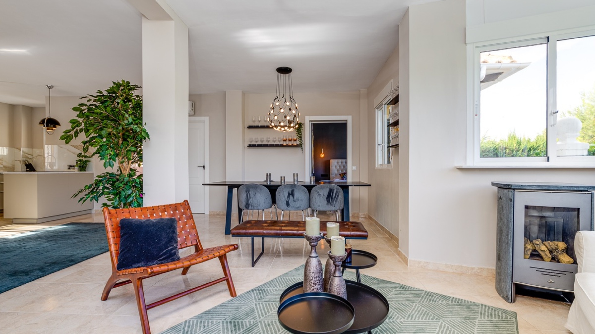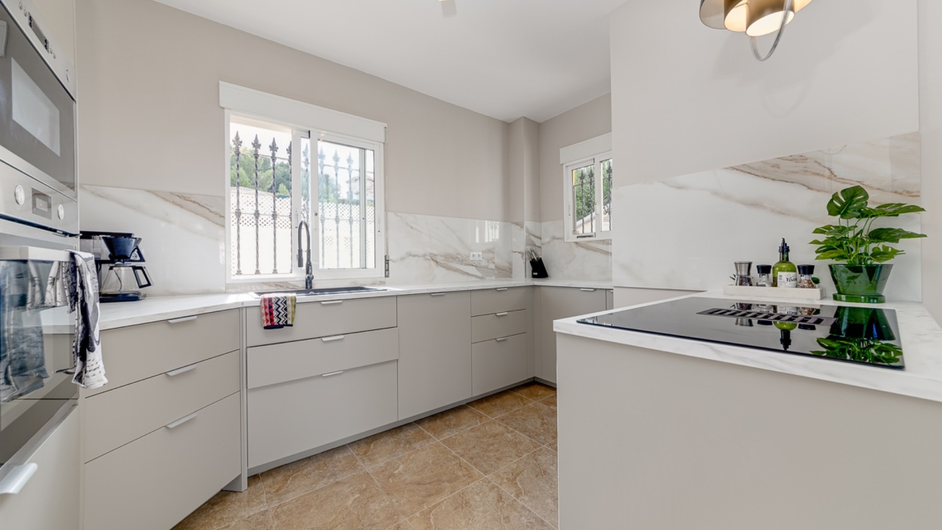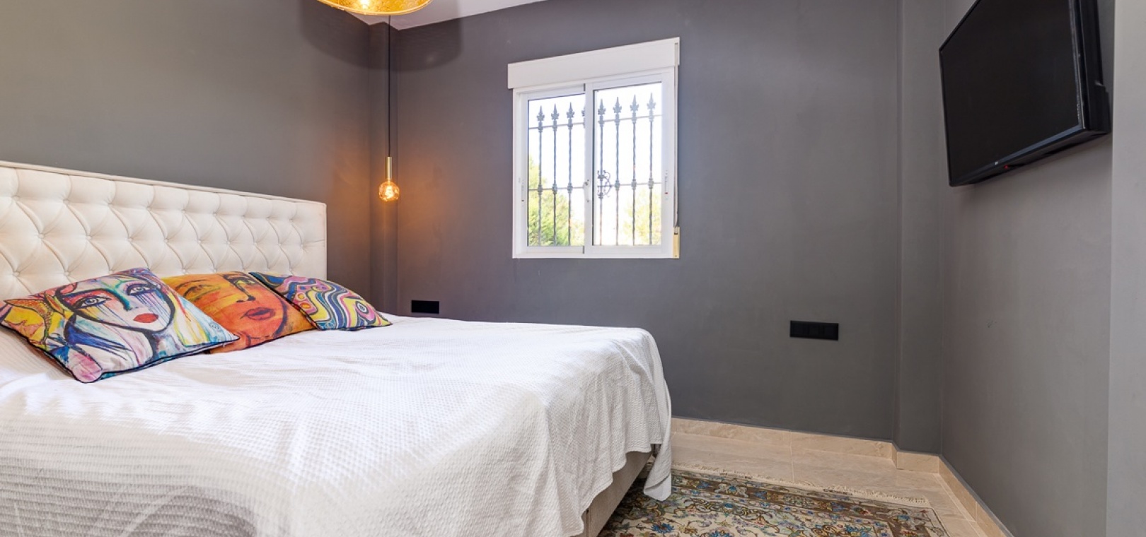 Stort vardagsrum/matrum med varm och kall A/C, ett fullt moderniserat kök med öppen planlösning, 2 x dubbelrum med inbyggda garderober och 2 x nyinredda badrum.