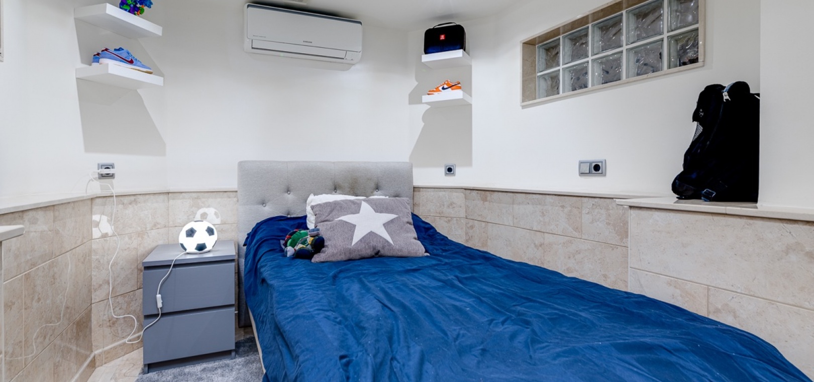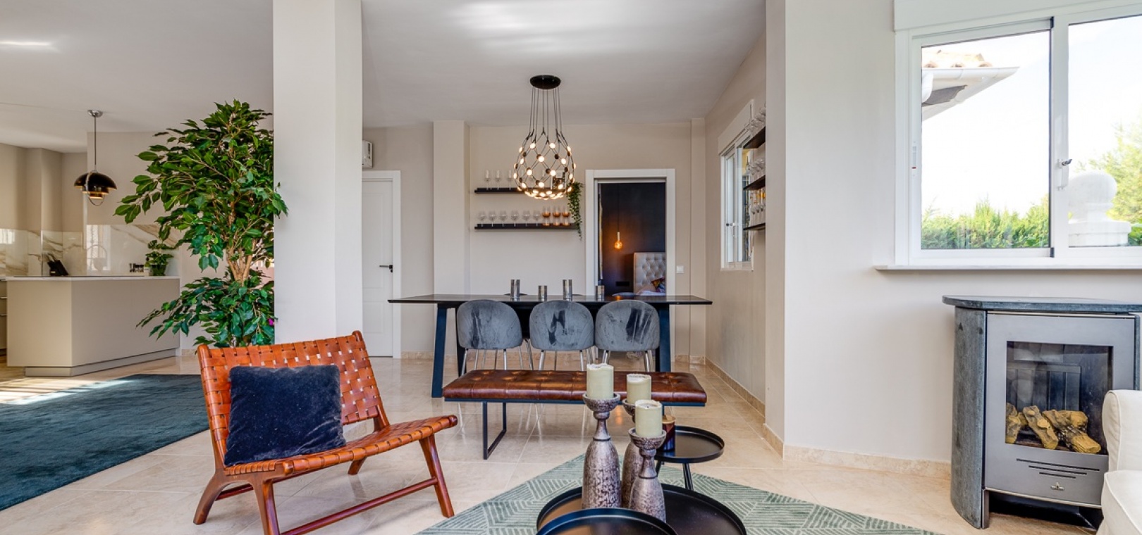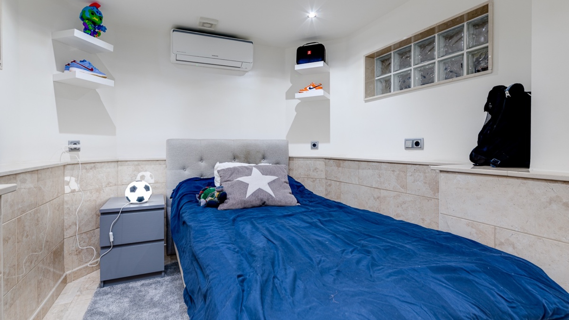 Stort vardagsrum/matrum med varm och kall A/C, ett fullt moderniserat kök med öppen planlösning, 2 x dubbelrum med inbyggda garderober och 2 x nyinredda badrum.