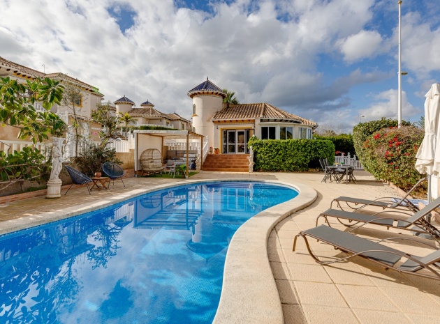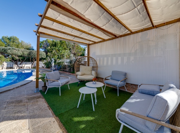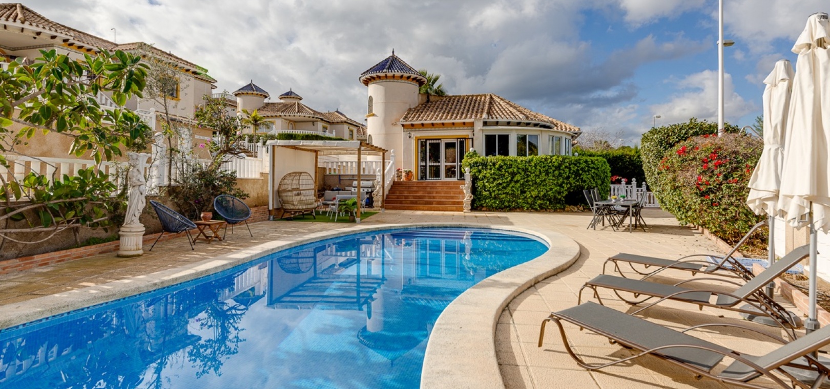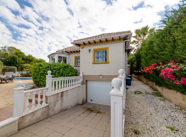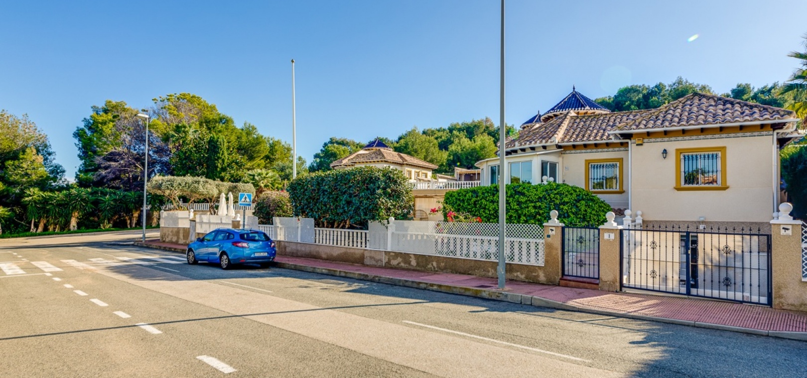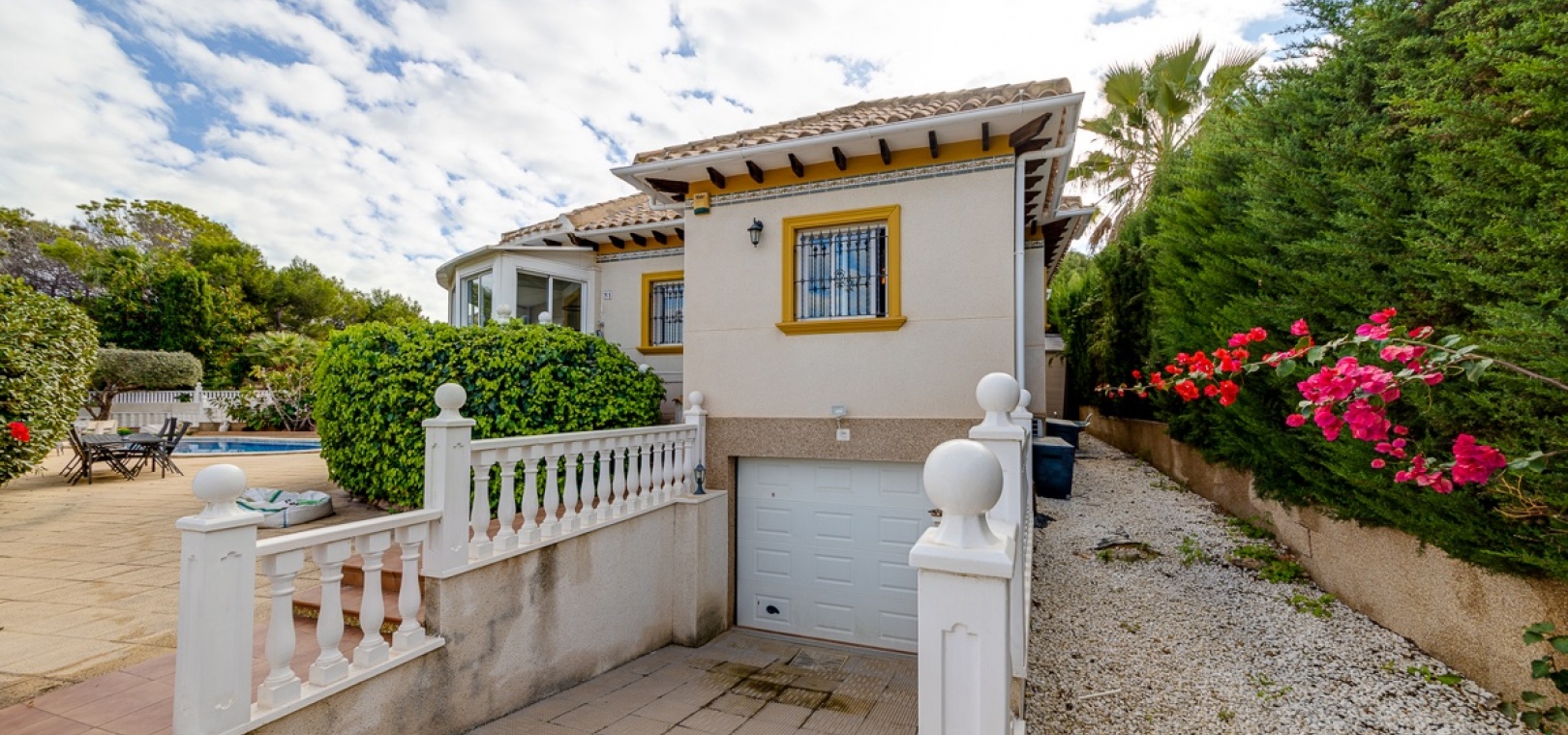 En fristående villa med 4 sovrum och 2 badrum med privat pool på en stor 550m2 tomt belägen i Pinada Golf I, Villamartin, Costa Blanca.