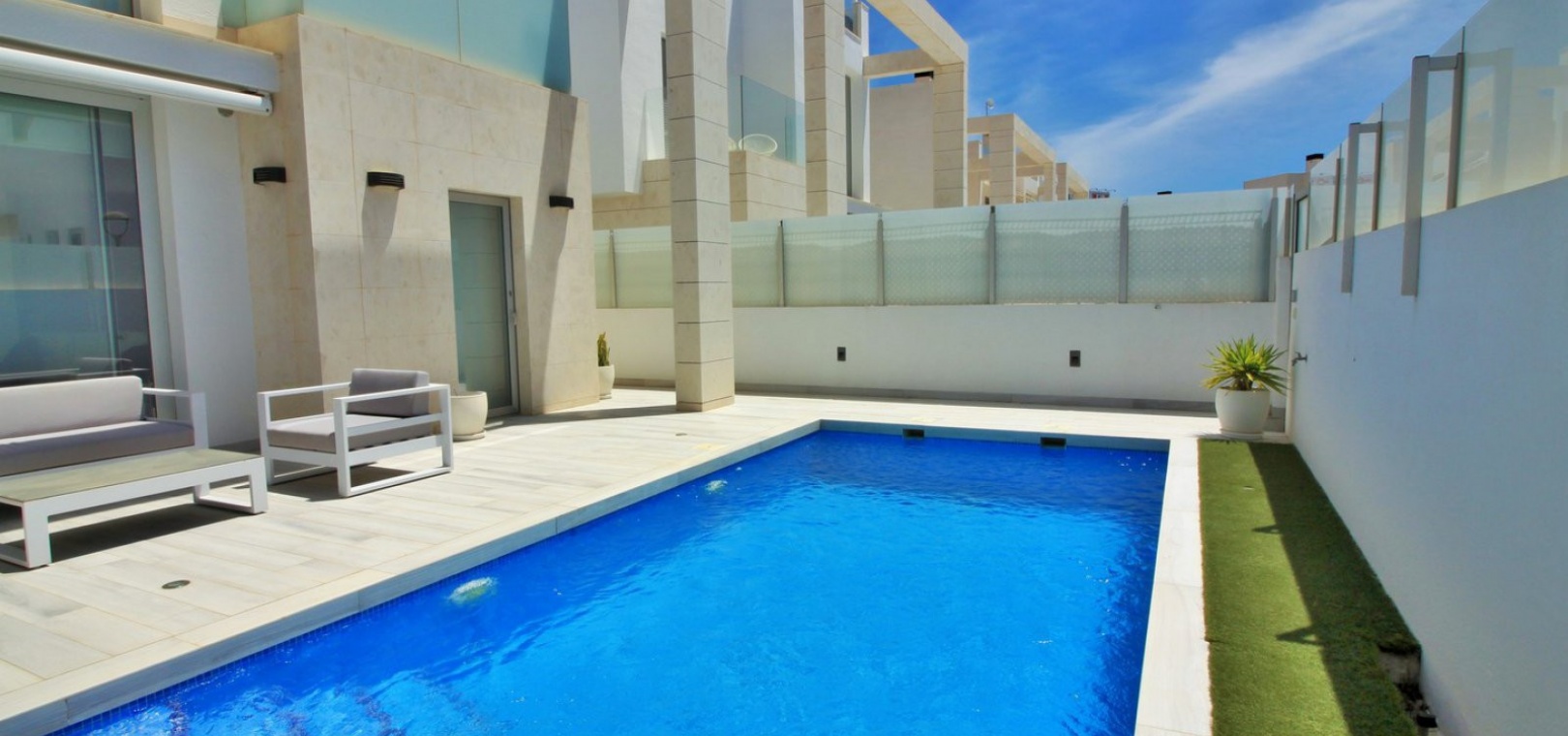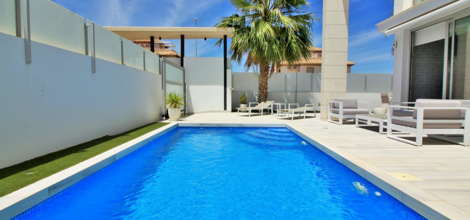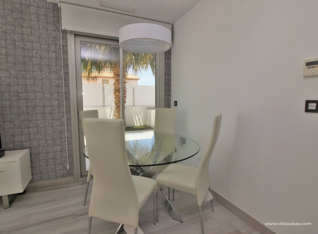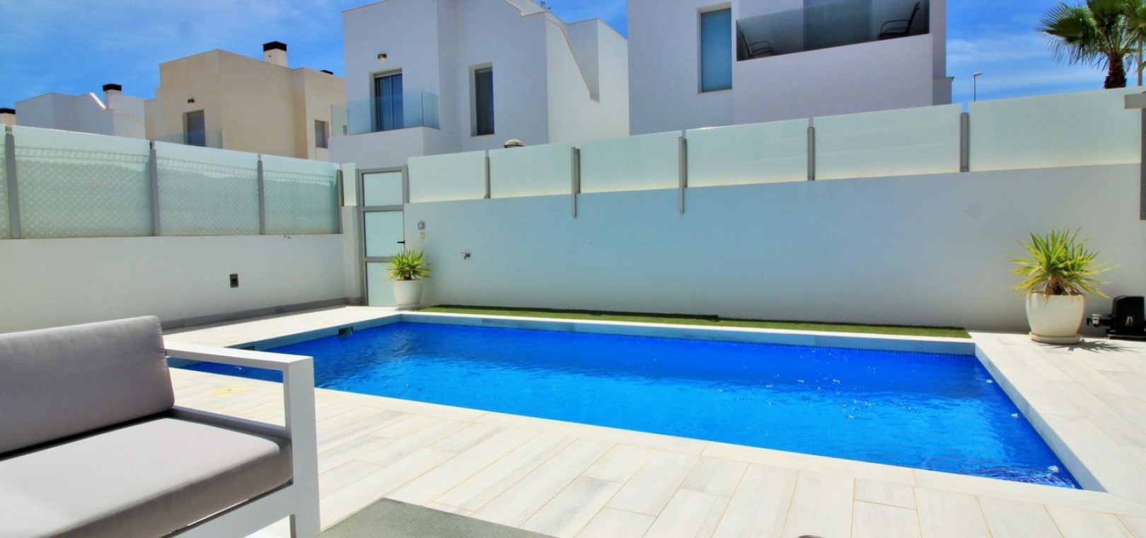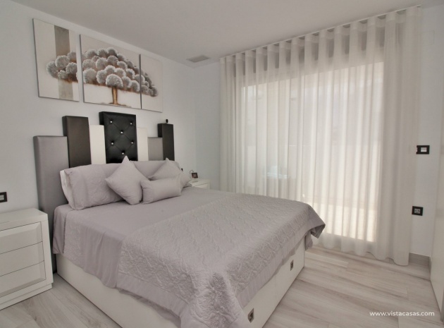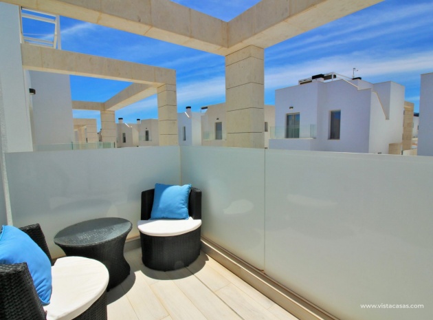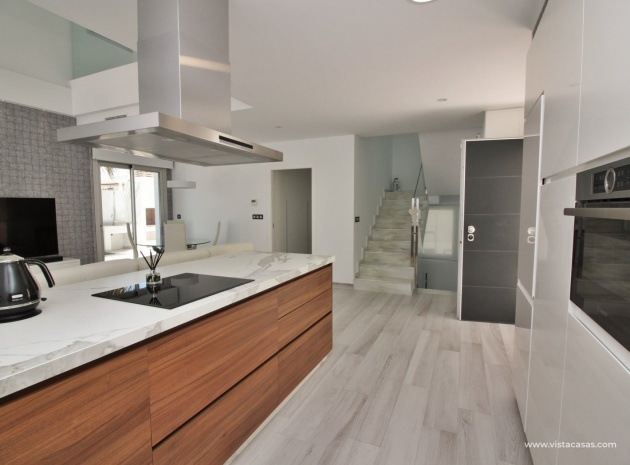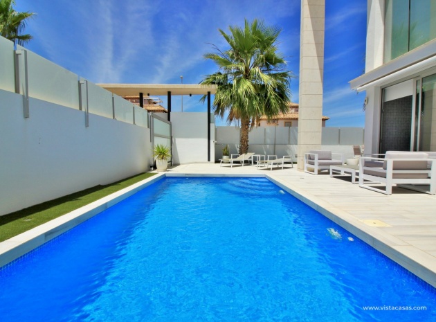 Fantastisk modern design 4 sovrum 4 badrum fristående villa med privat pool belägen i Lomas de Cabo Roig, Costa Blanca. Denna underbara fastighet bjuds ut till försäljning i mycket gott skick och består mycket kortfattat av följande: - På bottenvåningen finns ett rymligt vardagsrum / matsal med direkt tillgång till den privata poolen, kök med öppen planlösning, 1 x dubbelrum med en eget duschrum och 1 x W/C. På första våningen finns 2 x dubbelrum med inbyggda garderober och tillgång till balkonger, 1 x duschrum och ett privat takterrass. Det finns också ett stort underbyggt med 1 sovrum, 1 x badrum och en stor lounge. Utanför finns en uppfart för terrängparkering, privat pool, inventarier och tillbehör av högsta kvalitet i varm och kall A/C, alla möbler av högsta kvalitet är förhandlingsbara och mycket mer. Denna fastighet ligger bara en kort promenad från lokala barer, butiker, restaurang, snabbköp och den lokala busshållplatsen. De gyllene stränderna i Campoamor och Cabo Roig ligger bara några minuters bilresa bort, liksom 4 golfbanor. Köpcentret Zenia Boulevard ligger 5 minuters bilresa bort. Alicantes flygplats ligger 50 minuter bort.