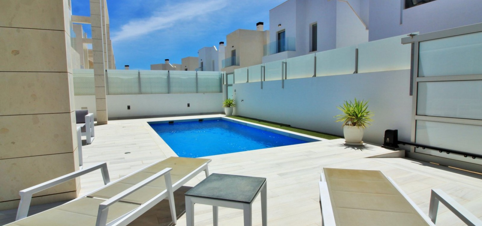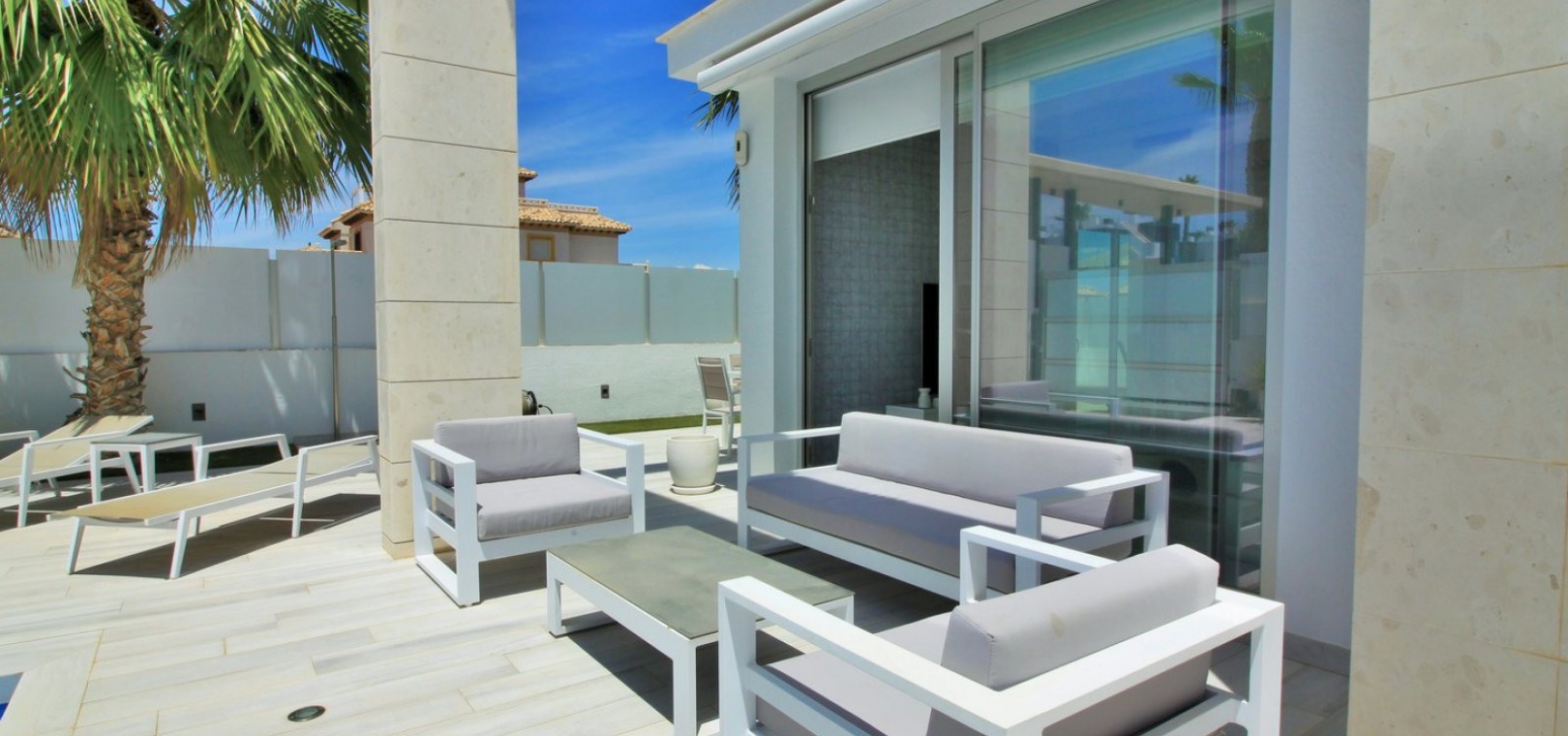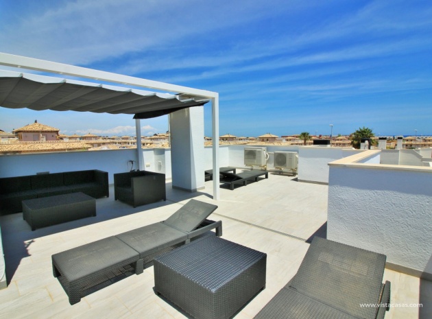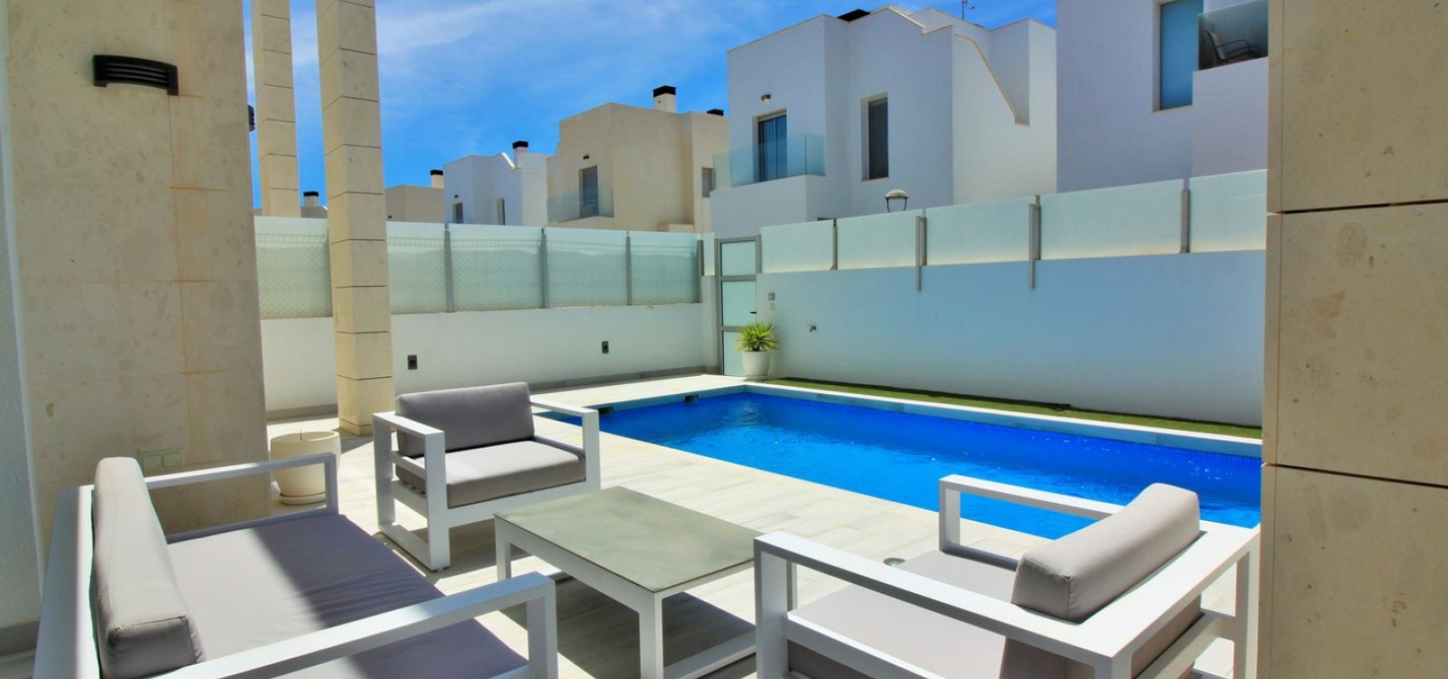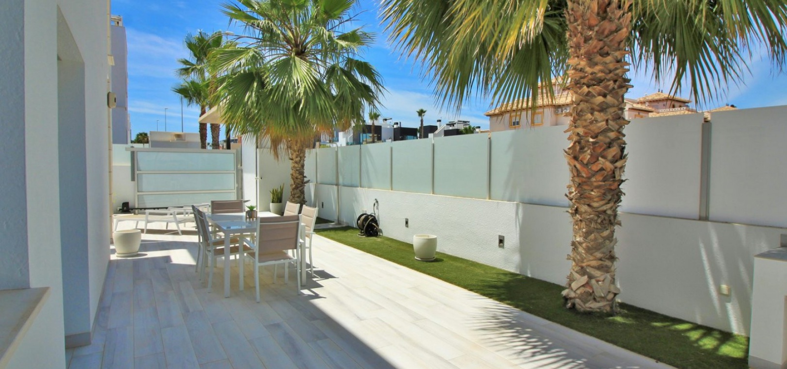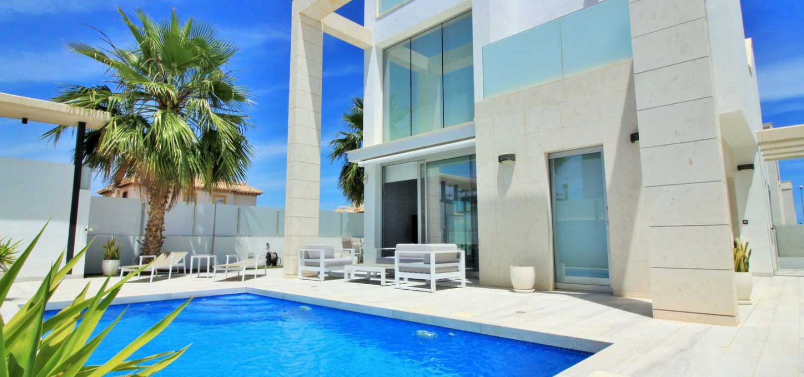 Fantastisk modern design 4 sovrum 4 badrum fristående villa med privat pool belägen i Lomas de Cabo Roig, Costa Blanca. Denna underbara fastighet bjuds ut till försäljning i mycket gott skick och består mycket kortfattat av följande: - På bottenvåningen finns ett rymligt vardagsrum / matsal med direkt tillgång till den privata poolen, kök med öppen planlösning, 1 x dubbelrum med en eget duschrum och 1 x W/C. På första våningen finns 2 x dubbelrum med inbyggda garderober och tillgång till balkonger, 1 x duschrum och ett privat takterrass. Det finns också ett stort underbyggt med 1 sovrum, 1 x badrum och en stor lounge. Utanför finns en uppfart för terrängparkering, privat pool, inventarier och tillbehör av högsta kvalitet i varm och kall A/C, alla möbler av högsta kvalitet är förhandlingsbara och mycket mer. Denna fastighet ligger bara en kort promenad från lokala barer, butiker, restaurang, snabbköp och den lokala busshållplatsen. De gyllene stränderna i Campoamor och Cabo Roig ligger bara några minuters bilresa bort, liksom 4 golfbanor. Köpcentret Zenia Boulevard ligger 5 minuters bilresa bort. Alicantes flygplats ligger 50 minuter bort.