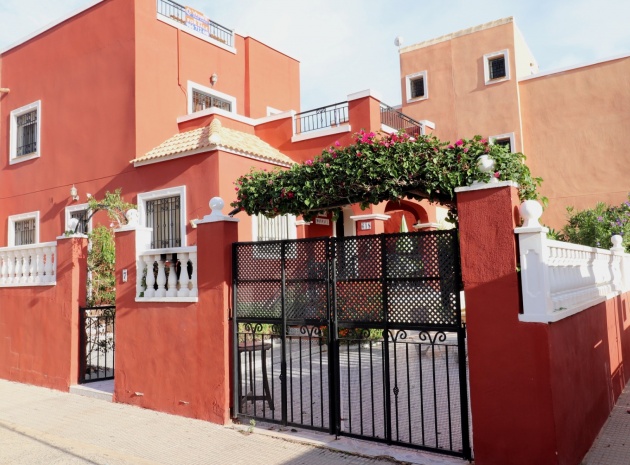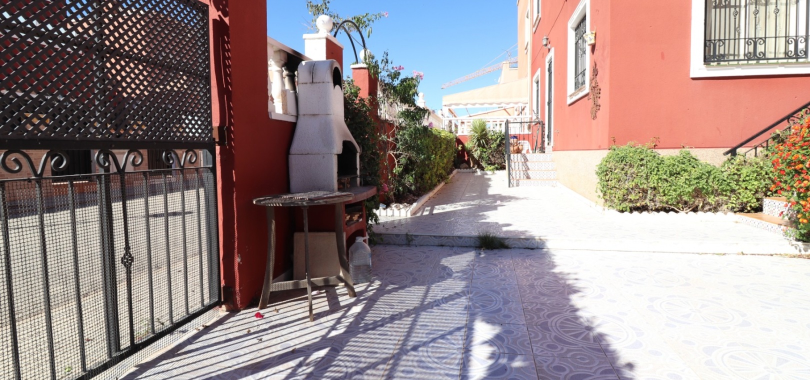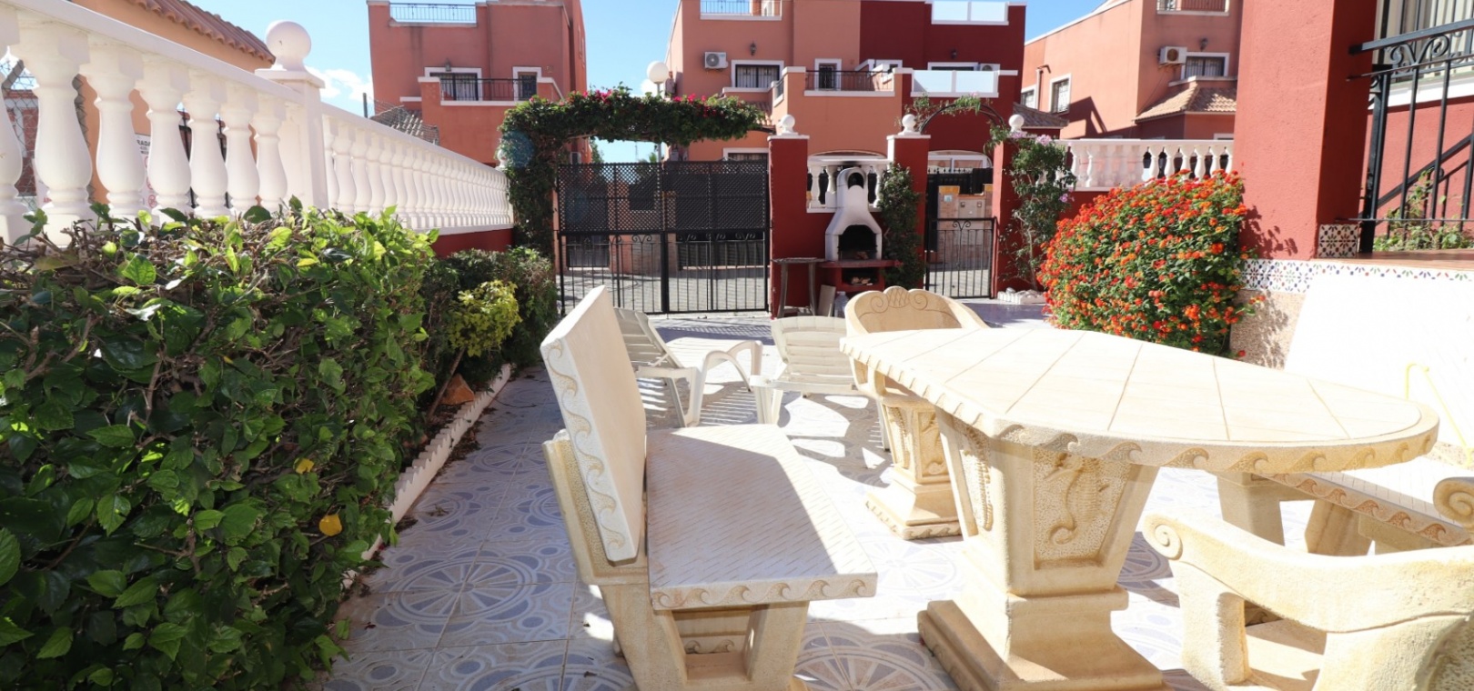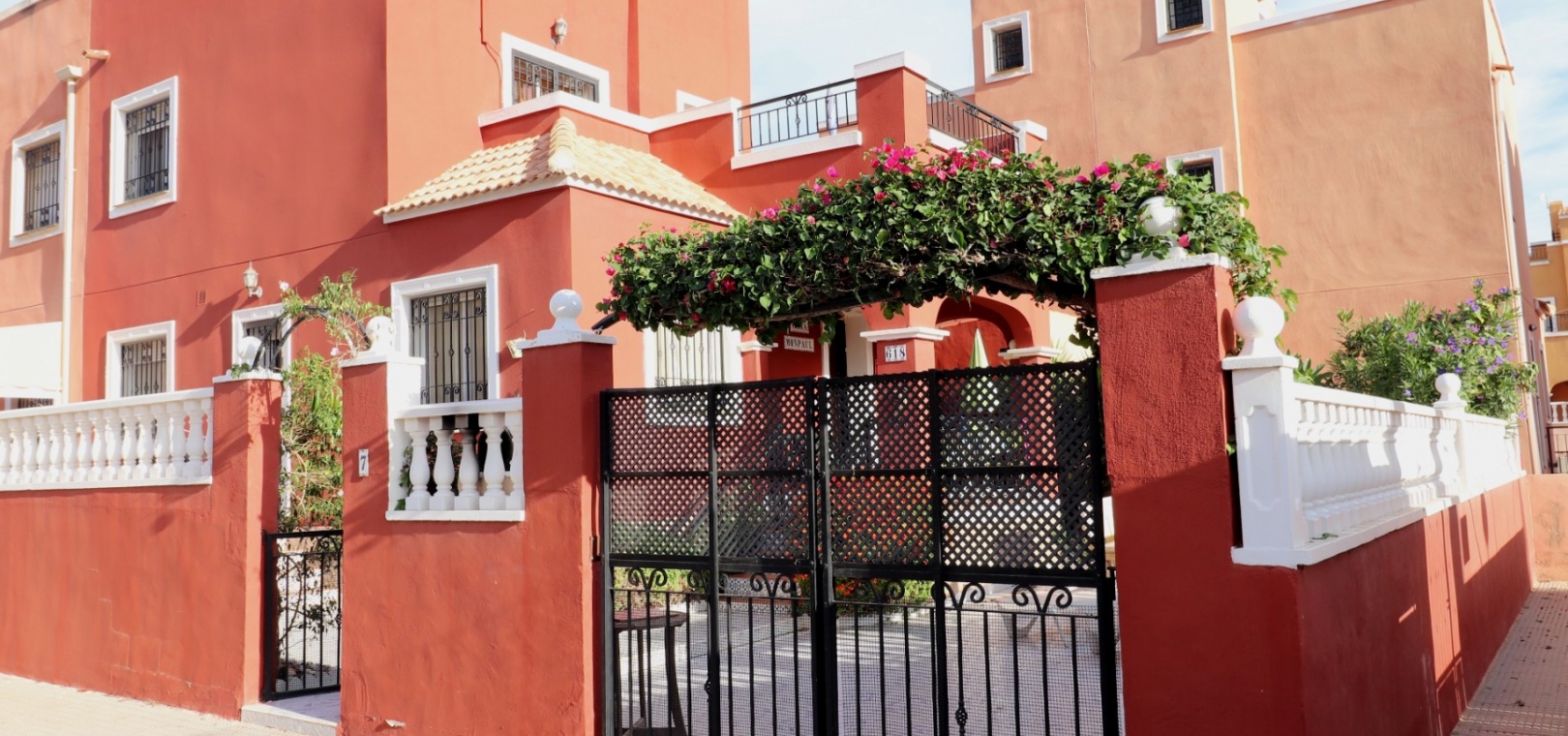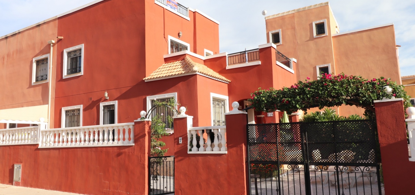 Detta hörn, sydostläge, tre sovrum, parhus i La Herrada, ett populärt bostadsområde med snabbköp och bar bara fem minuters promenad bort. Staden Los Montesinos kan nås till fots på femton minuter, där du kan hitta ett snabbköp, butiker, populära torg, en mängd olika kafébarer och restauranger, skola, teater.. Närmaste golfbana vid Vistabella ligger bara 10 minuter bort. med bil, Quesada, Torrevieja 10—15 minuter bort och stränder 20 minuter. Fastigheten nås via en täckt ingångsterrass, som leder in till vardagsrummet/matsalen, med luftkonditionering; Utrustat kök i amerikansk stil med dörr som leder ut åt sidan; dubbelrum; familjens duschrum. På första våningen finns ytterligare ett dubbelrum och ett familjebadrum. Intern trappa leder upp till andra våningen, med ett dubbelrum som har en terrass utanför, plus det finns en bonus med ett privat solarium. Trädgården är kaklad för enkelt underhåll med planterade bårder och off-road parkering. Fastigheten kommer med fördelen av en gemensam pool som ligger framför fastigheten, som du kan njuta av från terrassen och solariet. Extra inkluderar sovrum med inbyggda garderober och takfläktar, två med mygggardiner och ett förråd.