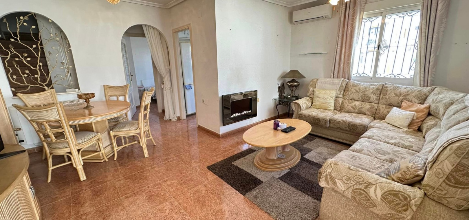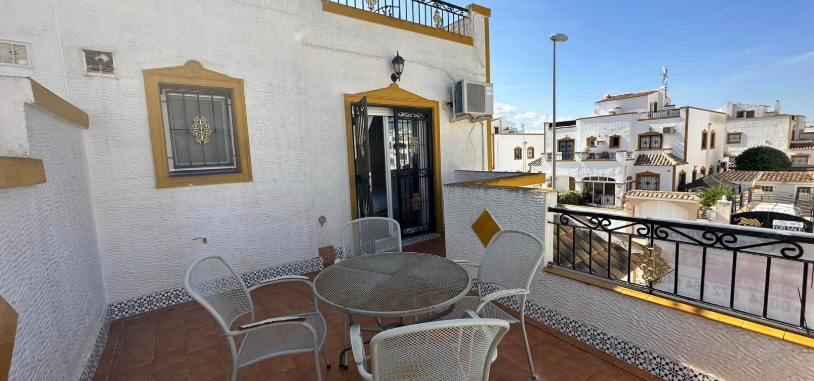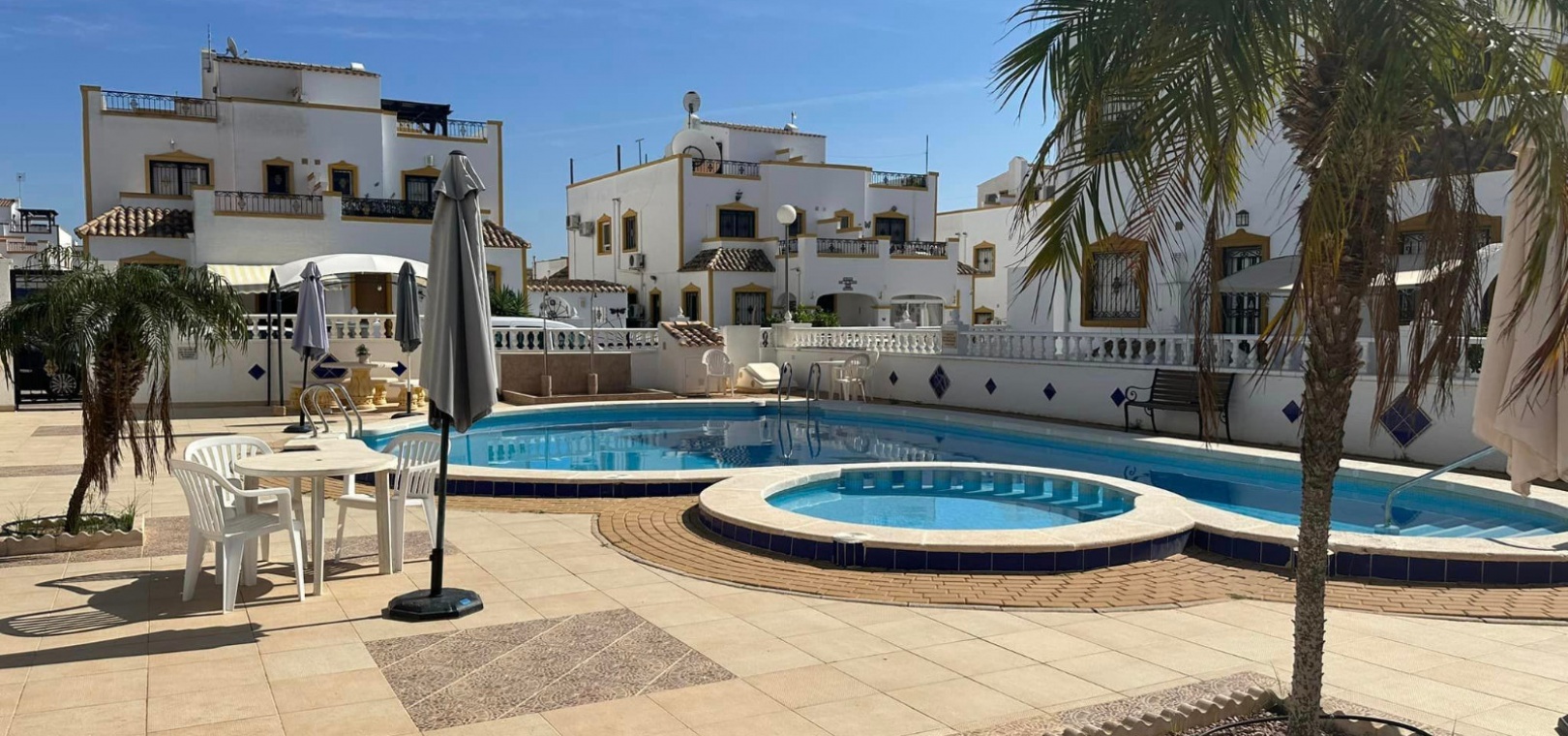Ett västläge fyrbäddshus med 3 sovrum och 2 badrum med en trädgård på framsidan och sidan beläget i Entre Naranjos (Vistabella Golf), Los Montesinos, södra Costa Blanca. Denna fastighet säljs i gott skick, säljs möblerad och består mycket kortfattat av följande:- På bottenvåningen finns en L-form vardagsrum/matsal med varm och kall luftkonditionering, separat fullt utrustat kök med dörr ut till sidoträdgården, 1 x tvåbäddsrum med inbyggda garderober och 1 x duschrum. På första våningen finns 2 x dubbelrum med inbyggda garderober, det största sovrummet har varm och kall A/C & en privat balkong & 1 x duschrum. Från första våningen leder en inre trappa upp till en liten landning/förvaring och ut till det privata solariet på taket. Utanför finns en täckt terrass, en trädgård på framsidan och sidan med en uppfart för off-road parkering och en härlig gemensam pool. Denna fastighet ligger bara några minuters promenad till två små kommersiella centra där du hittar barer, restauranger, ett apotek och en stor mataffär. Den nya golfbanan Vistabella ligger bara 500 meter bort. De vackra gyllene stränderna vid Guardamar ligger mindre än 20 minuters bilresa bort och det är cirka 35 minuters bilresa till Alicantes flygplats och Murcia Corvera flygplats ligger cirka 50 minuter bort.