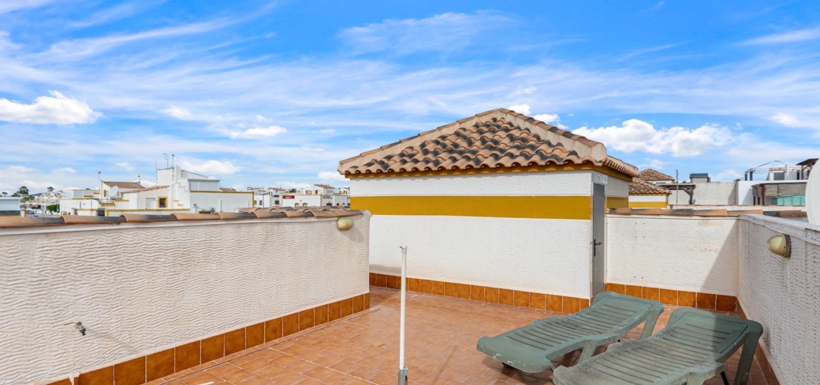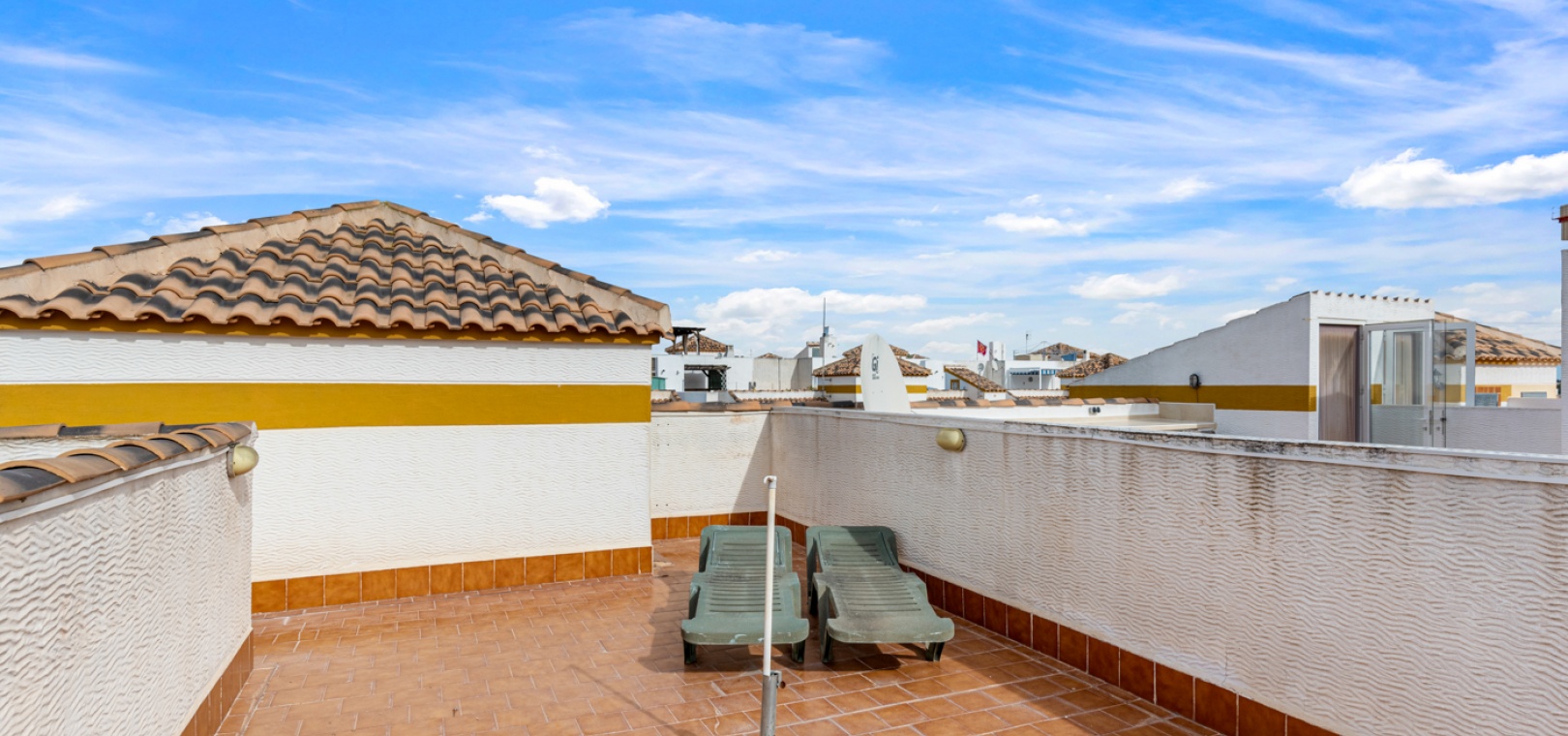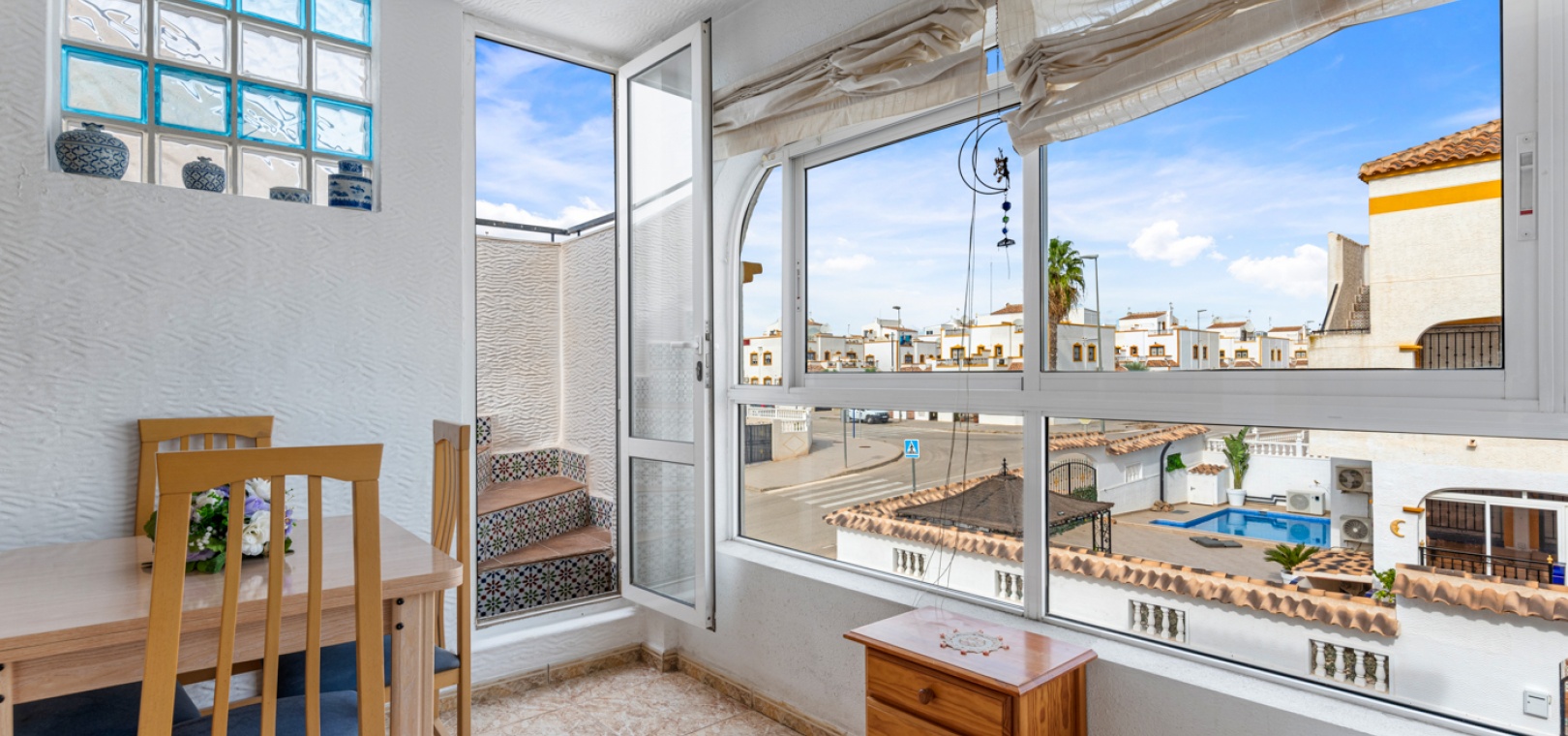 Vardagsrum/matsal, separat fullt utrustat kök, 2 x dubbelrum båda med inbyggda garderober, 1 x familjebadrum, inglasad balkong utanför loungen, ett stort privat takterrass med ett förråd, härlig gemensam pool och gemensam parkering.