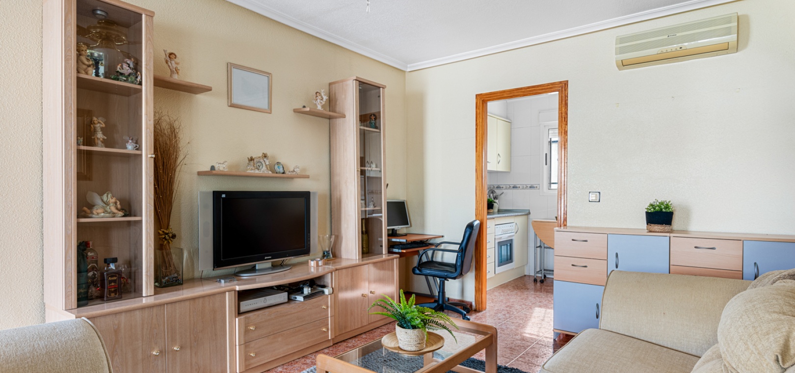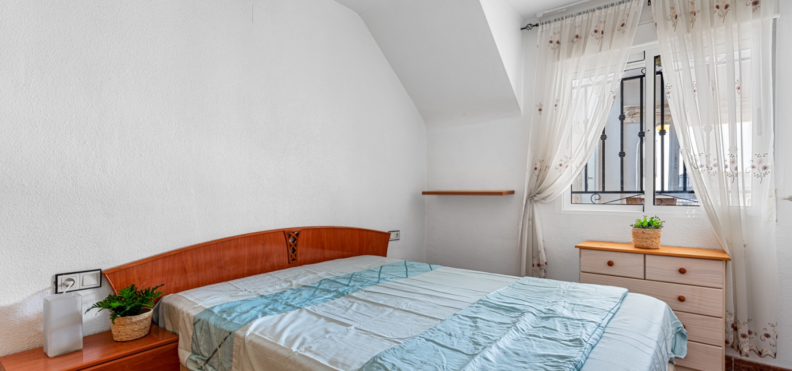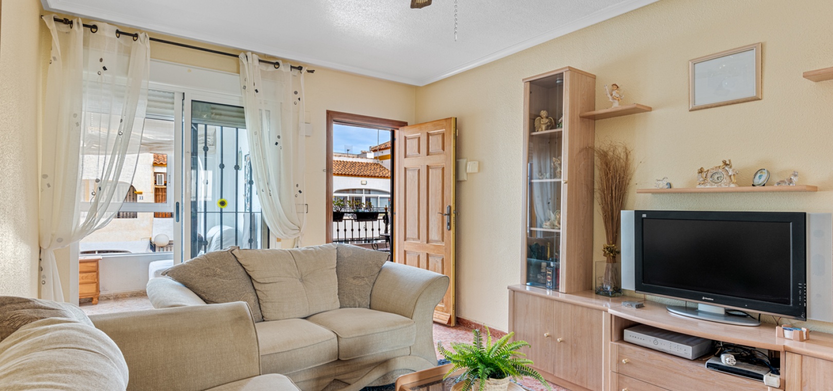 Vardagsrum/matsal, separat fullt utrustat kök, 2 x dubbelrum båda med inbyggda garderober, 1 x familjebadrum, inglasad balkong utanför loungen, ett stort privat takterrass med ett förråd, härlig gemensam pool och gemensam parkering.