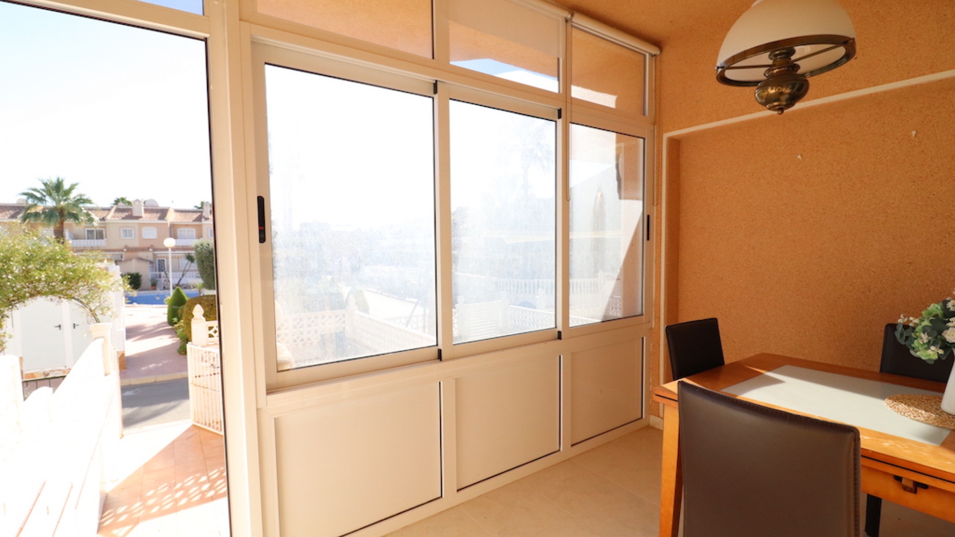 Utanför finns en inglasad terrass på framsidan, trädgård fram och bak, gemensam pool precis framför fastigheten, gemensam parkering och mycket mer.