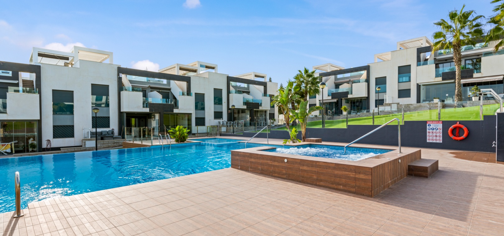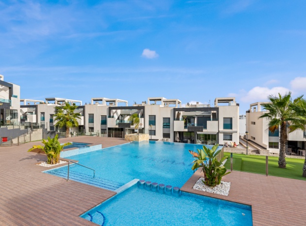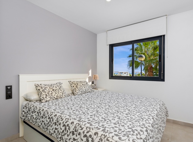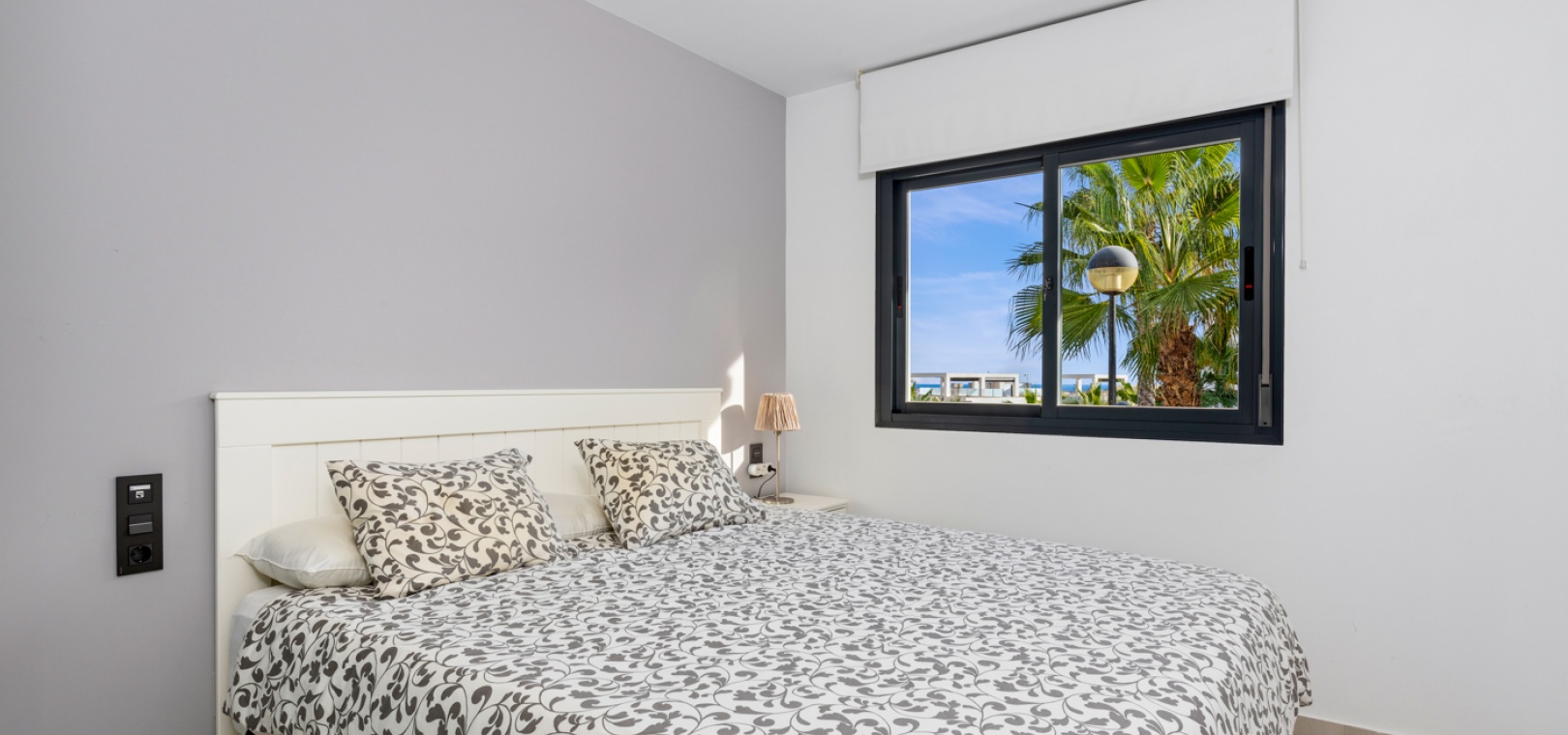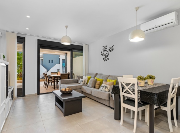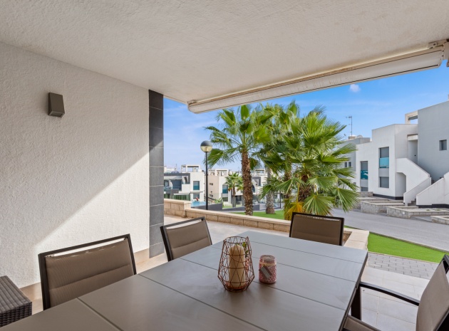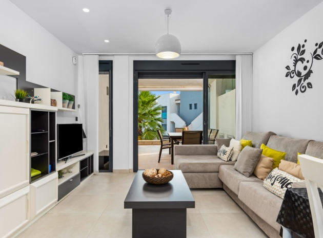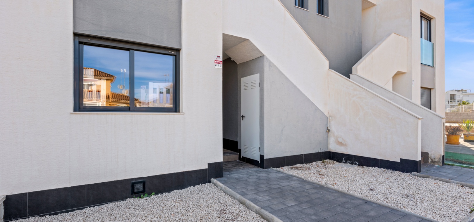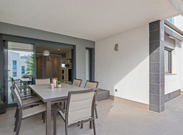 En lägenhet i söderläge med 2 sovrum och 2 badrum i modern stil på bottenvåningen i Res. Oasis Beach, Punta Prima, Costa Blanca.