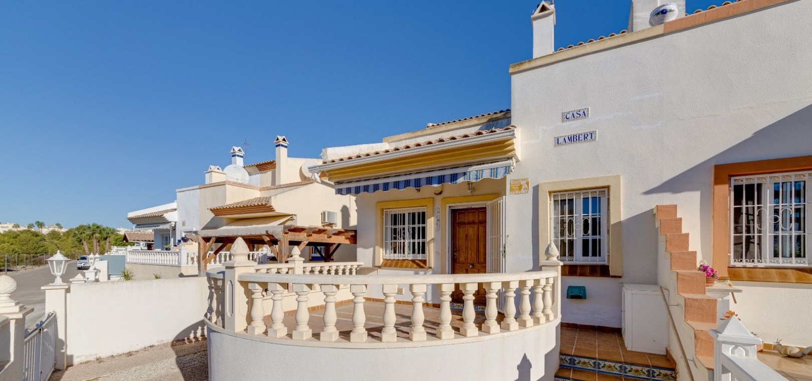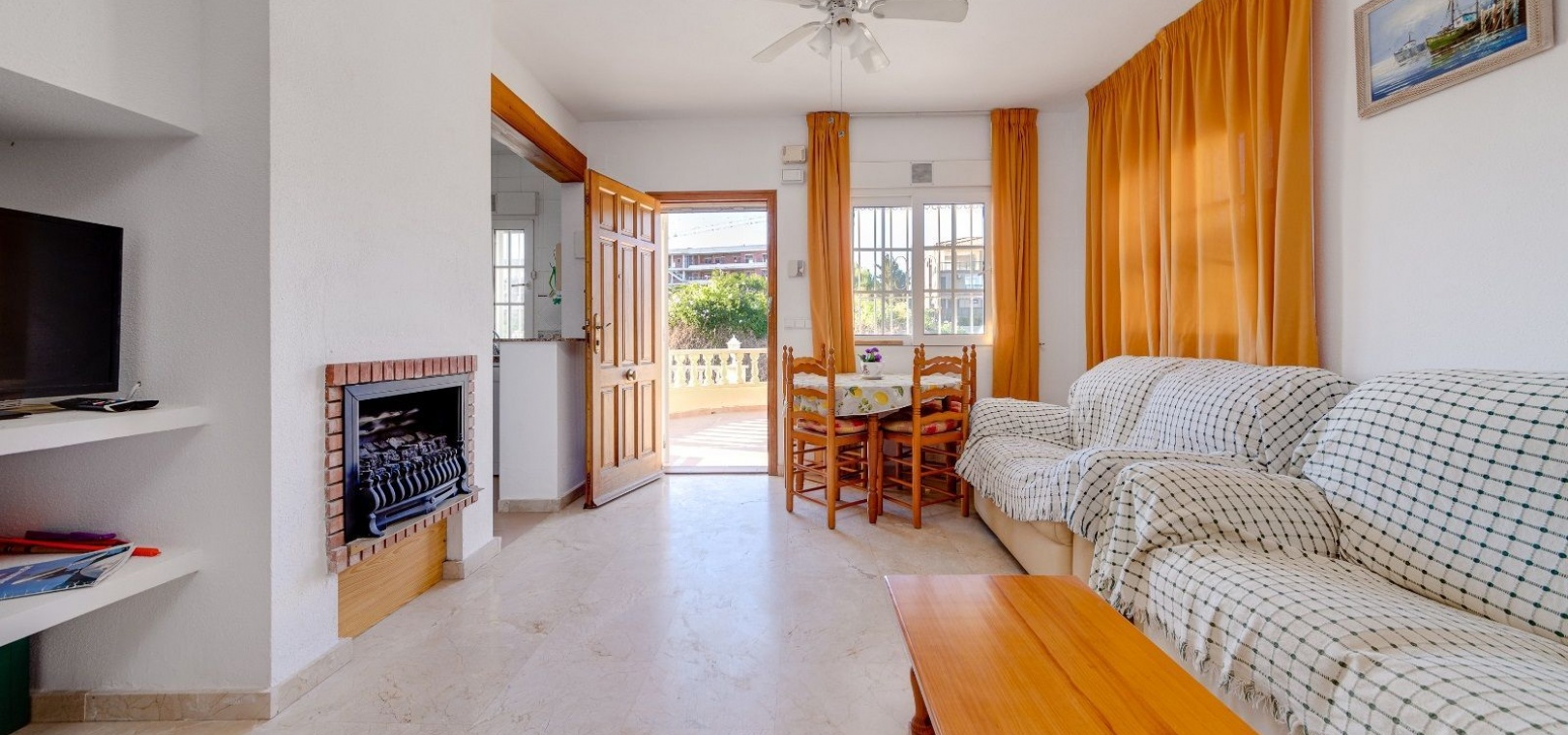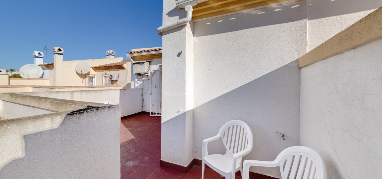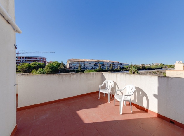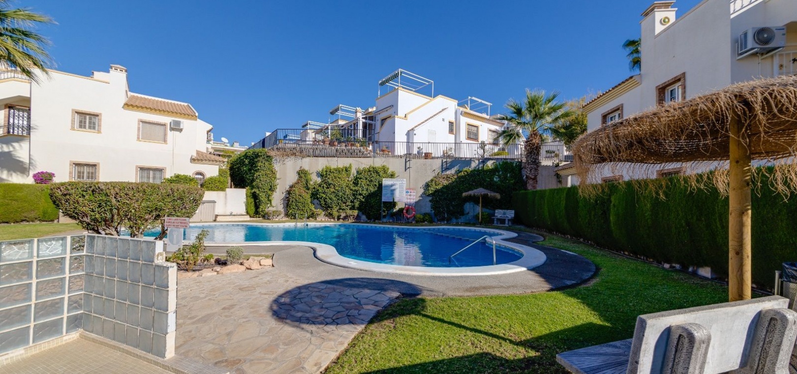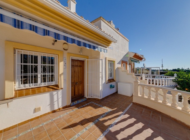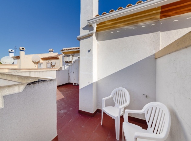 Ett parhus med 3 sovrum och 2 badrum i söderläge med privat takterrass som ligger nära Playa Flamenca Commercial Centre i Res. Jumilla, Playa Flamenca, Costa Blanca. Denna härliga fastighet säljs i mycket gott skick, säljs möblerad och består i korthet av följande: - På bottenvåningen finns ett vardagsrum/matrum med öppen spis, ett fullt utrustat kök med öppen planlösning, 2 x dubbelrum båda med inbyggda garderober & 1 x nymonterat duschrum. På första våningen finns det stora dubbelrum med inbyggda garderober, 1 x familjebadrum och dörrar ut till det privata solariumet på taket. Utanför finns en utökad terrass, fram- och sidoträdgård med off-road parkering, vacker gemensam pool och mycket mycket mer. Denna fastighet ligger bara 1 minuts promenad från Playa Flamenca Commercial Centre där du hittar många stormarknader, butiker, barer och restauranger etc. Vackra gyllene sandstränder med blå flagg finns i närheten vid Playa Flamenca-stranden (700m) och även vid Punta Prima, La Zenia och Cabo Roig. Det finns också en bra busslinje (var 30:e minut), som förbinder området med alla de viktigaste kustområdena som Torrevieja och Alicante i norr och Cartagena och Mar Menor i söder. Shopping: Köpcentret Zenia boulevard ligger mindre än 5 minuters bilresa från fastigheten. Murcia Corvera flygplats ligger 35 minuters bilresa och Alicantes flygplats ligger 50 minuters bilresa bort.