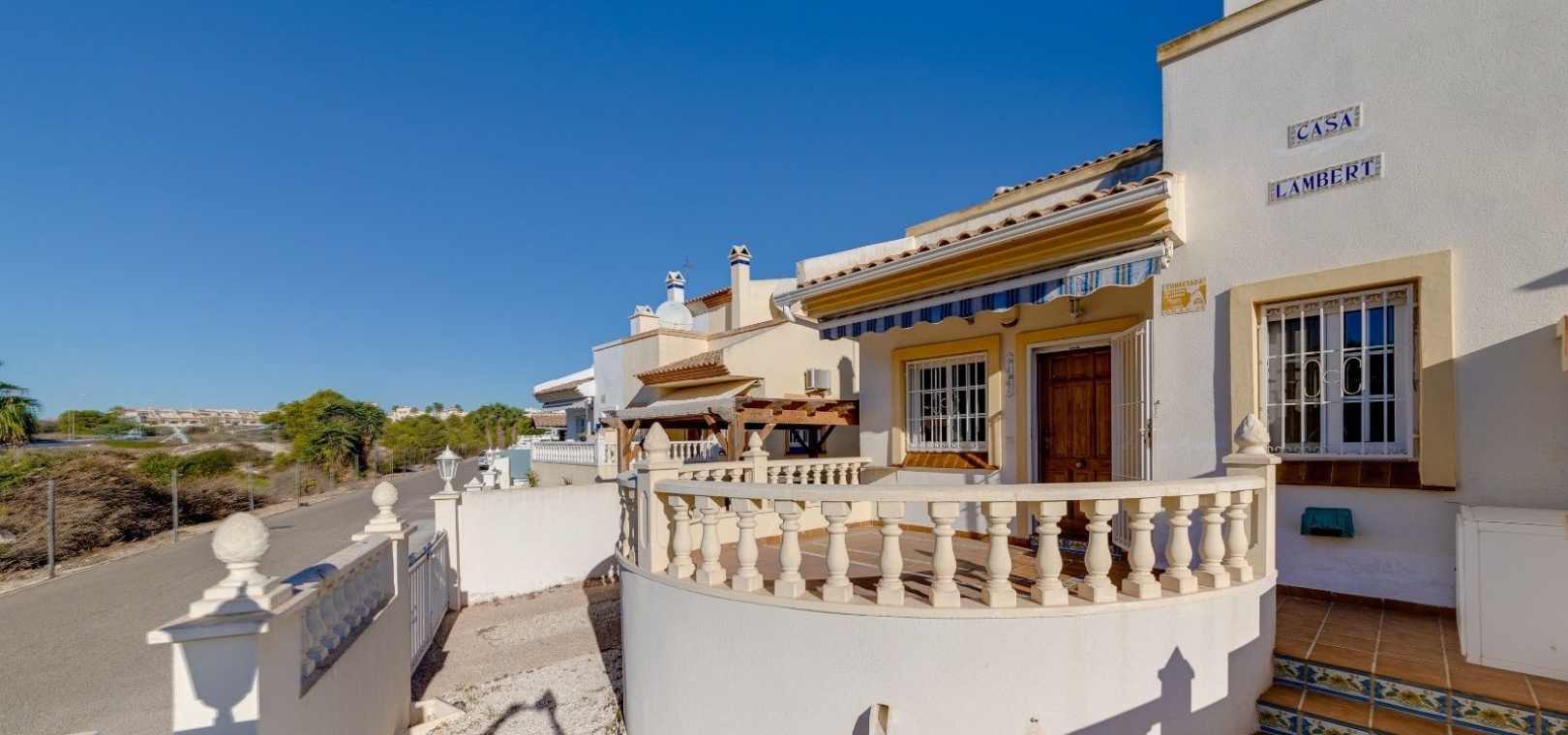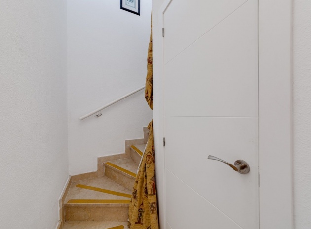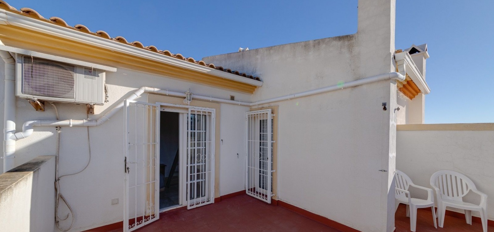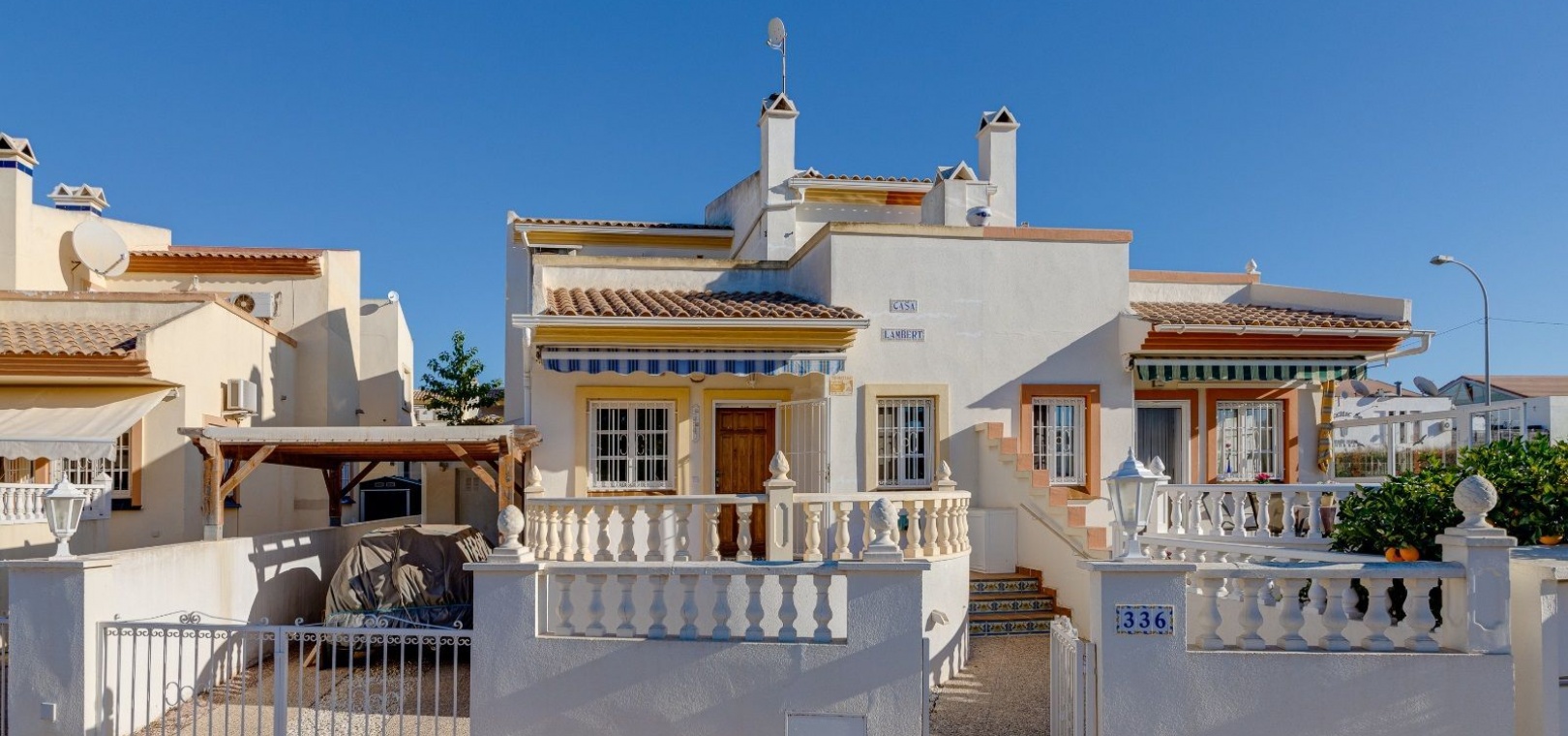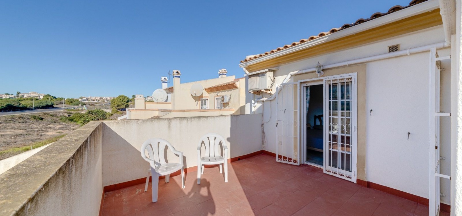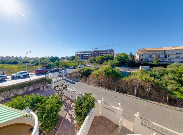 Ett parhus med 3 sovrum och 2 badrum i söderläge med privat takterrass som ligger nära Playa Flamenca Commercial Centre i Res. Jumilla, Playa Flamenca, Costa Blanca. Denna härliga fastighet säljs i mycket gott skick, säljs möblerad och består i korthet av följande: - På bottenvåningen finns ett vardagsrum/matrum med öppen spis, ett fullt utrustat kök med öppen planlösning, 2 x dubbelrum båda med inbyggda garderober & 1 x nymonterat duschrum. På första våningen finns det stora dubbelrum med inbyggda garderober, 1 x familjebadrum och dörrar ut till det privata solariumet på taket. Utanför finns en utökad terrass, fram- och sidoträdgård med off-road parkering, vacker gemensam pool och mycket mycket mer. Denna fastighet ligger bara 1 minuts promenad från Playa Flamenca Commercial Centre där du hittar många stormarknader, butiker, barer och restauranger etc. Vackra gyllene sandstränder med blå flagg finns i närheten vid Playa Flamenca-stranden (700m) och även vid Punta Prima, La Zenia och Cabo Roig. Det finns också en bra busslinje (var 30:e minut), som förbinder området med alla de viktigaste kustområdena som Torrevieja och Alicante i norr och Cartagena och Mar Menor i söder. Shopping: Köpcentret Zenia boulevard ligger mindre än 5 minuters bilresa från fastigheten. Murcia Corvera flygplats ligger 35 minuters bilresa och Alicantes flygplats ligger 50 minuters bilresa bort.