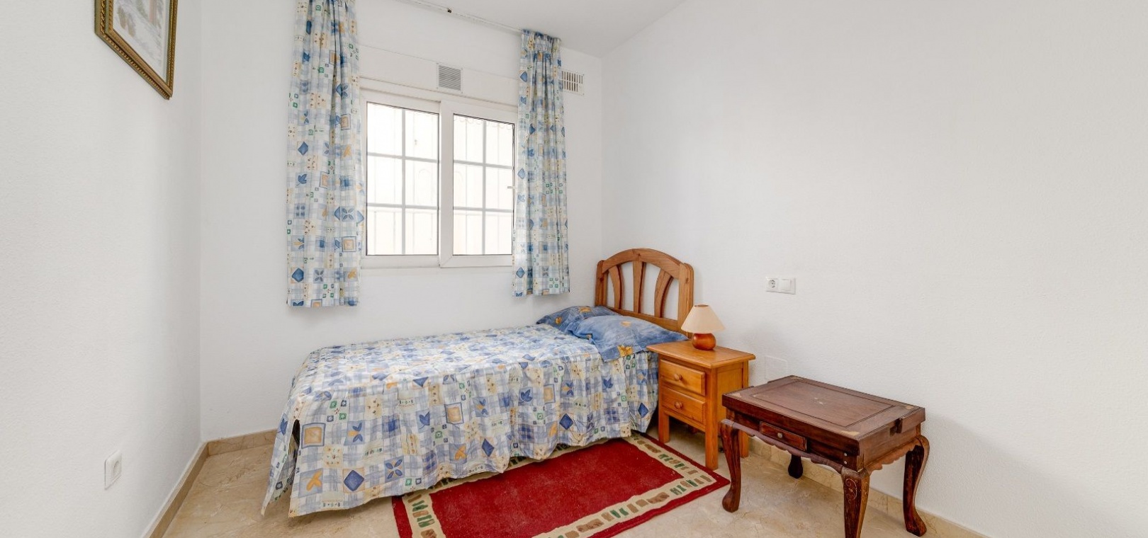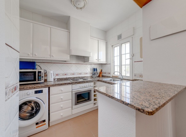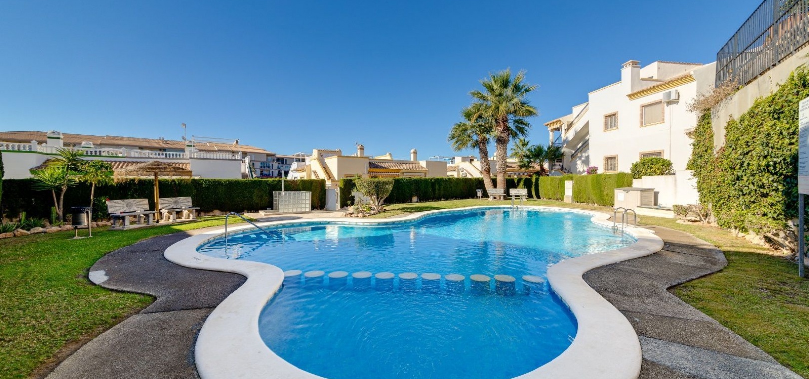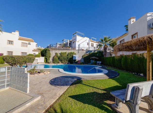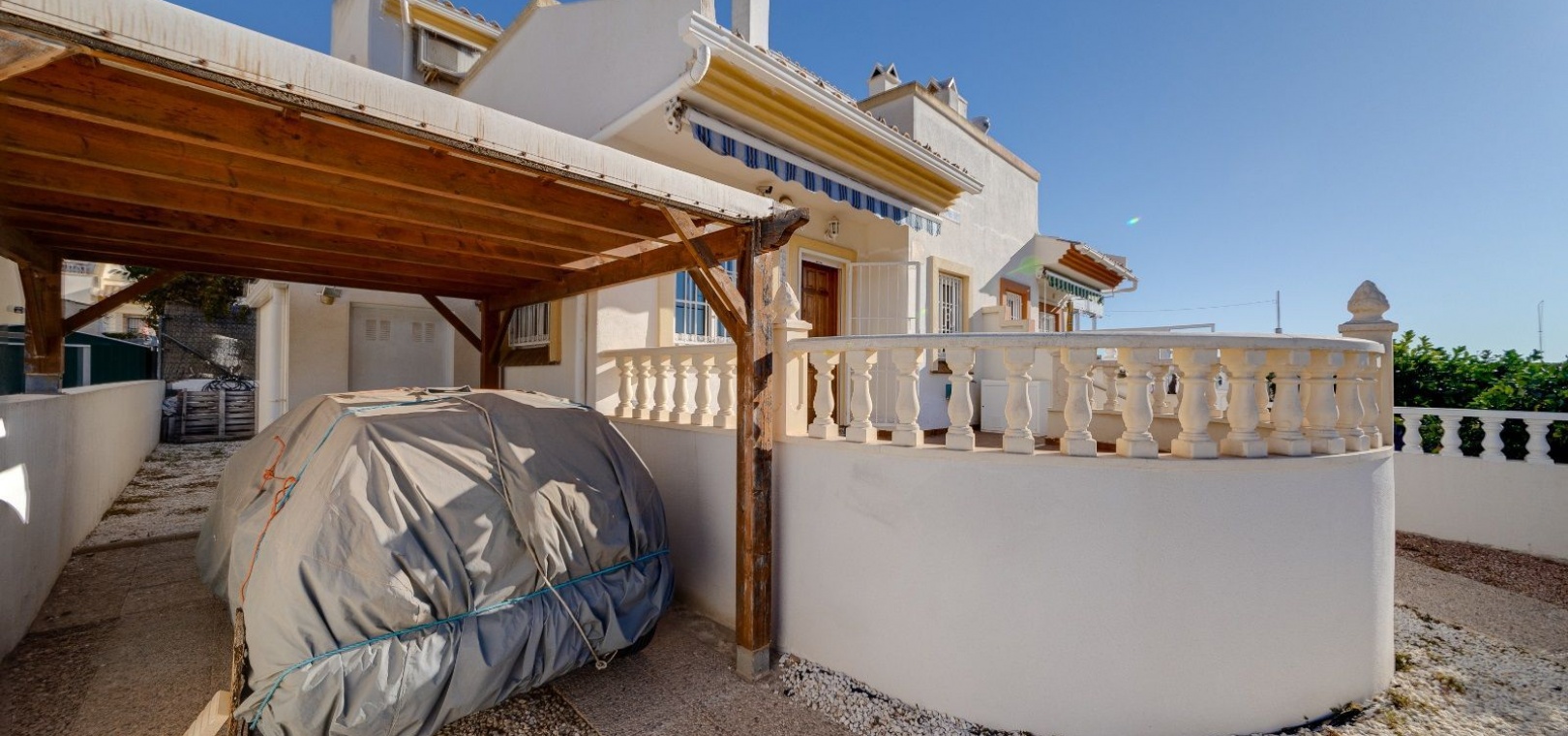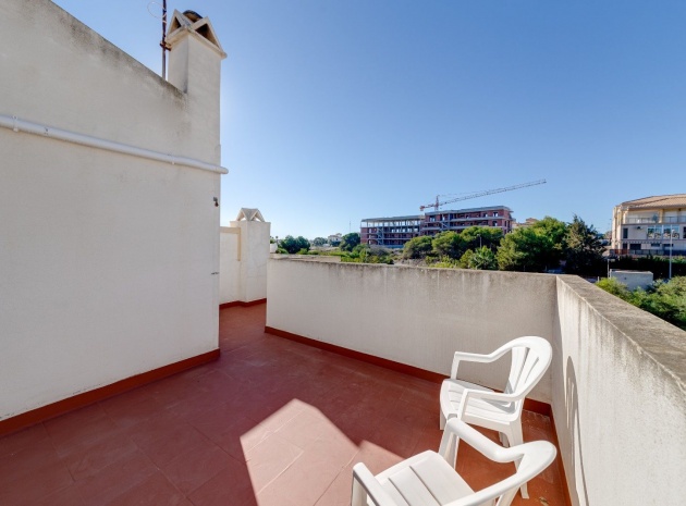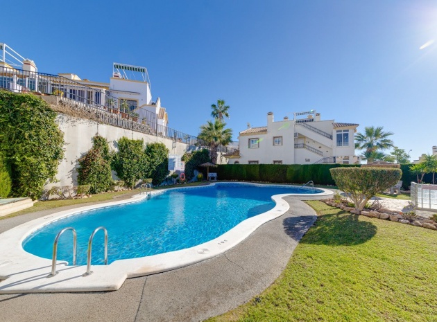 Ett parhus med 3 sovrum och 2 badrum i söderläge med privat takterrass som ligger nära Playa Flamenca Commercial Centre i Res. Jumilla, Playa Flamenca, Costa Blanca. Denna härliga fastighet säljs i mycket gott skick, säljs möblerad och består i korthet av följande: - På bottenvåningen finns ett vardagsrum/matrum med öppen spis, ett fullt utrustat kök med öppen planlösning, 2 x dubbelrum båda med inbyggda garderober & 1 x nymonterat duschrum. På första våningen finns det stora dubbelrum med inbyggda garderober, 1 x familjebadrum och dörrar ut till det privata solariumet på taket. Utanför finns en utökad terrass, fram- och sidoträdgård med off-road parkering, vacker gemensam pool och mycket mycket mer. Denna fastighet ligger bara 1 minuts promenad från Playa Flamenca Commercial Centre där du hittar många stormarknader, butiker, barer och restauranger etc. Vackra gyllene sandstränder med blå flagg finns i närheten vid Playa Flamenca-stranden (700m) och även vid Punta Prima, La Zenia och Cabo Roig. Det finns också en bra busslinje (var 30:e minut), som förbinder området med alla de viktigaste kustområdena som Torrevieja och Alicante i norr och Cartagena och Mar Menor i söder. Shopping: Köpcentret Zenia boulevard ligger mindre än 5 minuters bilresa från fastigheten. Murcia Corvera flygplats ligger 35 minuters bilresa och Alicantes flygplats ligger 50 minuters bilresa bort.