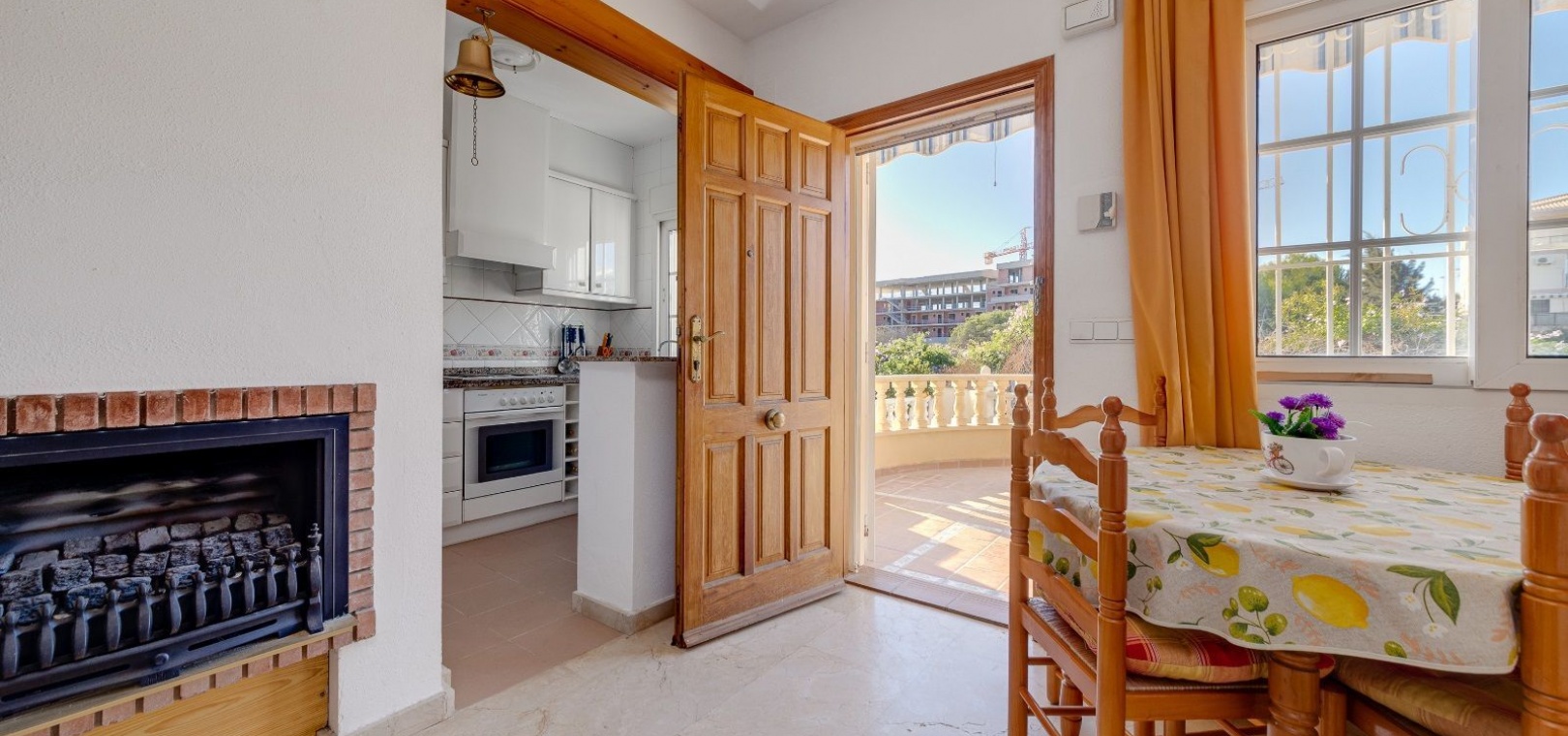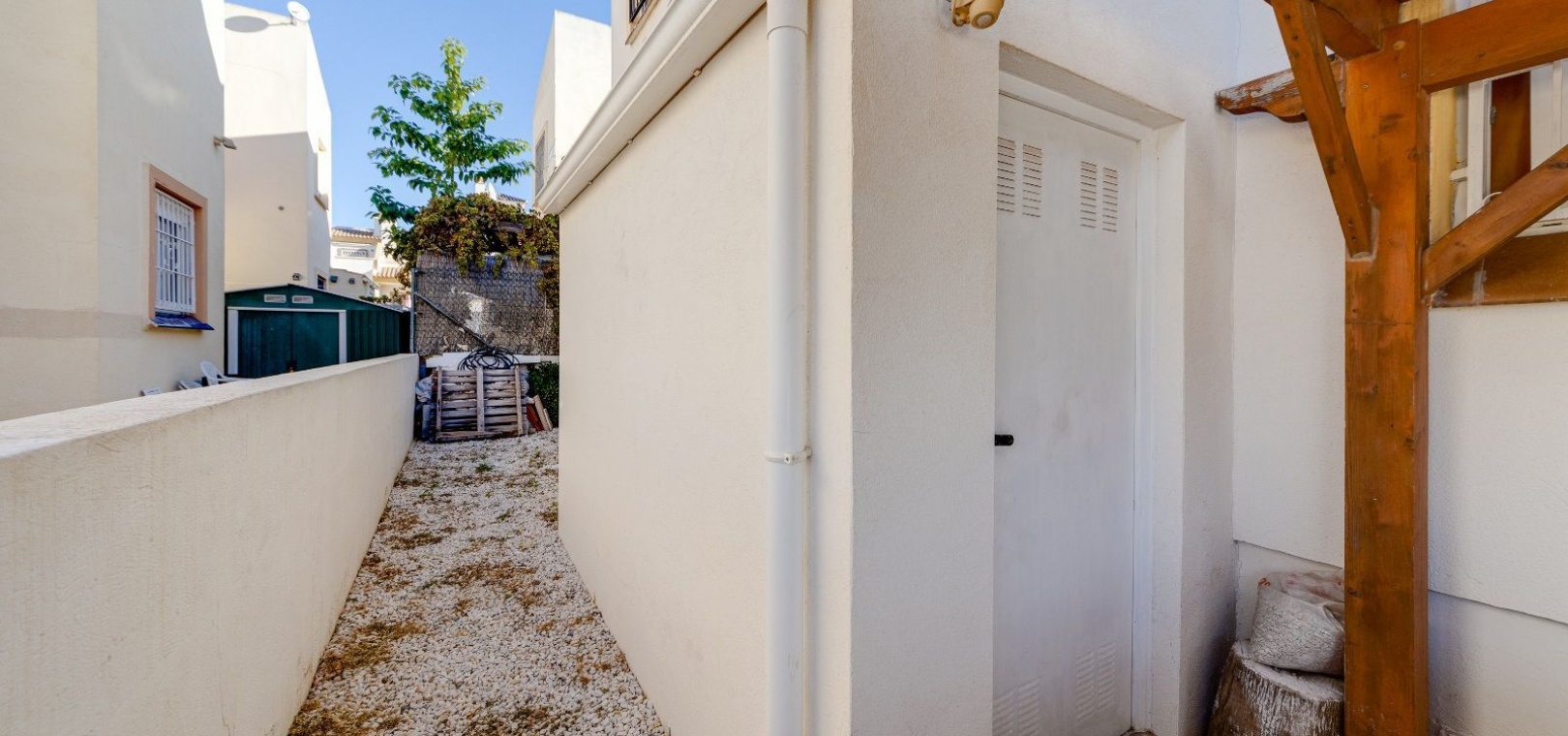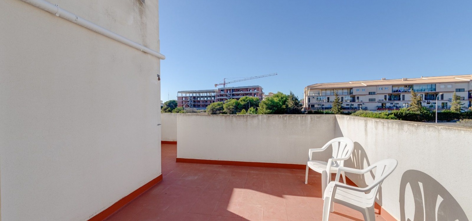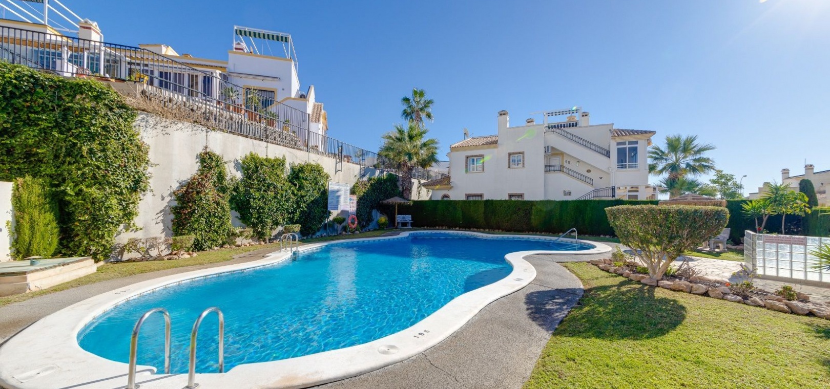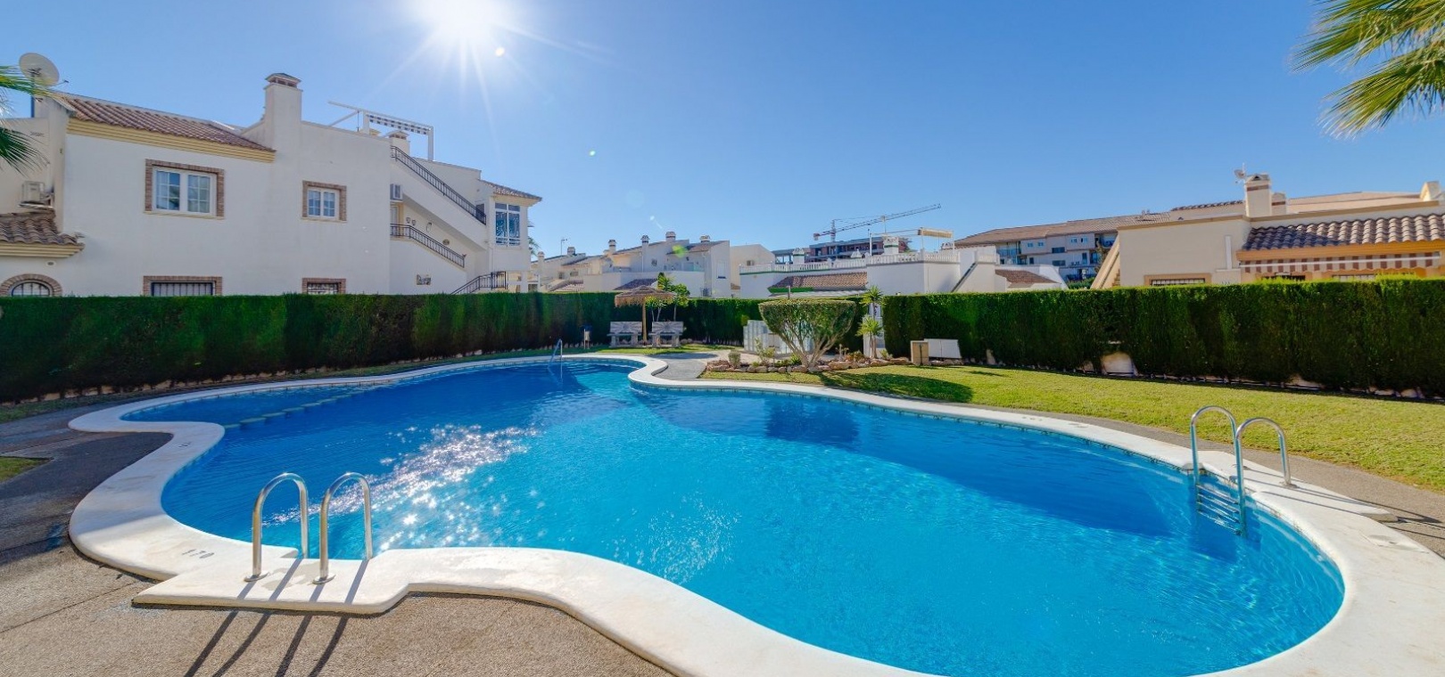Ett parhus med 3 sovrum och 2 badrum i söderläge med privat takterrass som ligger nära Playa Flamenca Commercial Centre i Res. Jumilla, Playa Flamenca, Costa Blanca. Denna härliga fastighet säljs i mycket gott skick, säljs möblerad och består i korthet av följande: - På bottenvåningen finns ett vardagsrum/matrum med öppen spis, ett fullt utrustat kök med öppen planlösning, 2 x dubbelrum båda med inbyggda garderober & 1 x nymonterat duschrum. På första våningen finns det stora dubbelrum med inbyggda garderober, 1 x familjebadrum och dörrar ut till det privata solariumet på taket. Utanför finns en utökad terrass, fram- och sidoträdgård med off-road parkering, vacker gemensam pool och mycket mycket mer. Denna fastighet ligger bara 1 minuts promenad från Playa Flamenca Commercial Centre där du hittar många stormarknader, butiker, barer och restauranger etc. Vackra gyllene sandstränder med blå flagg finns i närheten vid Playa Flamenca-stranden (700m) och även vid Punta Prima, La Zenia och Cabo Roig. Det finns också en bra busslinje (var 30:e minut), som förbinder området med alla de viktigaste kustområdena som Torrevieja och Alicante i norr och Cartagena och Mar Menor i söder. Shopping: Köpcentret Zenia boulevard ligger mindre än 5 minuters bilresa från fastigheten. Murcia Corvera flygplats ligger 35 minuters bilresa och Alicantes flygplats ligger 50 minuters bilresa bort.
