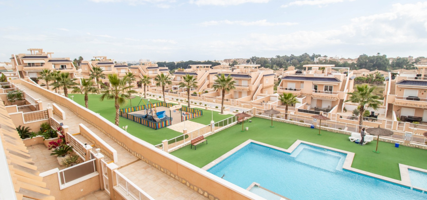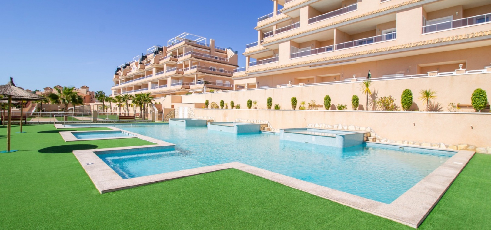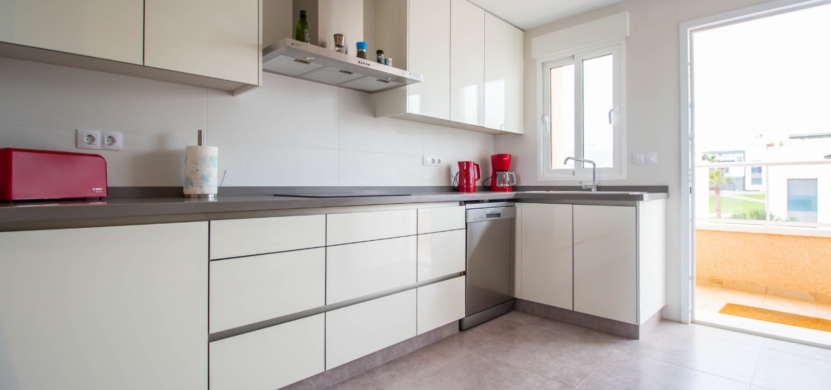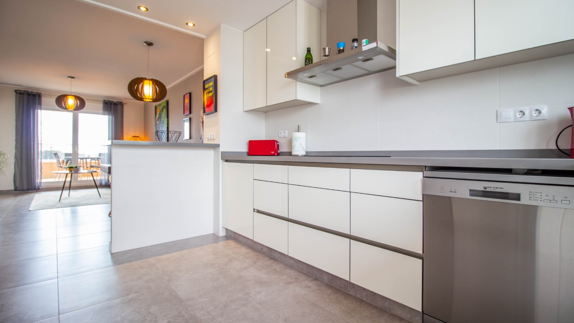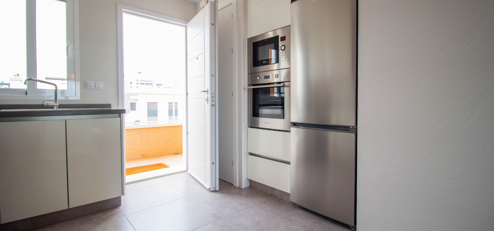 En sydostläge, som ny, två sovrum, första våningen lägenhet i Punta Prima, belägen bara 10 minuters promenad till Punta Marina kommersiella centrum, där du hittar JYSK, snabbköp, McDonalds, butiker, cafébarer/restauranger. Stranden ligger 5 minuter med bil, plus ett sjukhus och staden Torrevieja, känd för sin småbåtshamn och populära strandpromenad. Alla bekvämligheter på Orihuela Costa, inklusive shoppingcentret La Zenia Boulevard ligger inom en radie på 10 minuters bilresa och för golfare ett stort urval av banor. Själva komplexet har 2 gemensamma pooler (en är täckt och uppvärmd), trädgårdar, barnområde, spa/jacuzzi och biohälsosamt gym. Lägenheten består av: vardagsrum/matsal med skjutbara glasdörrar ut till en rymlig terrass, som erbjuder gott om utrymme för uteservering, med utsikt över den gemensamma poolen och trädgårdsområdet; rymligt kök med öppen planlösning med bardisk, dörr som leder till en uteplats på baksidan och dörr som leder till verktyget; två dubbelrum, master med tillgång till terrassen, lådor i den inbyggda garderoben och eget duschrum; ytterligare modernt duschrum. Extrafunktionerna inkluderar luftkonditionering med kanal, golvuppvärmda badrum, plus att det finns en hiss i kvarteret och en underjordisk parkeringsplats. Du får alla "nybyggda" fördelar med denna fantastiska lägenhet.