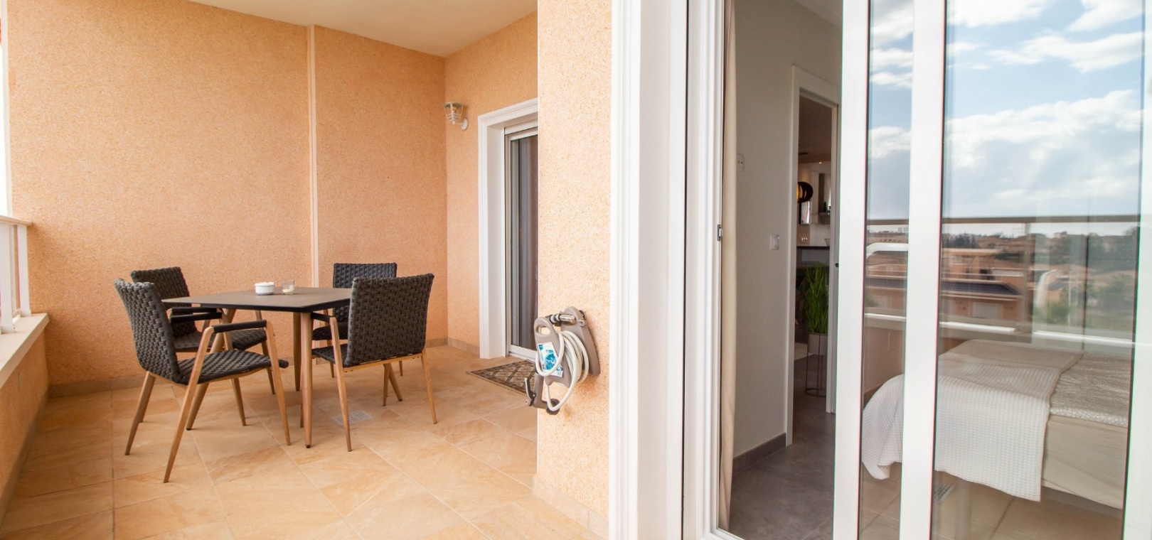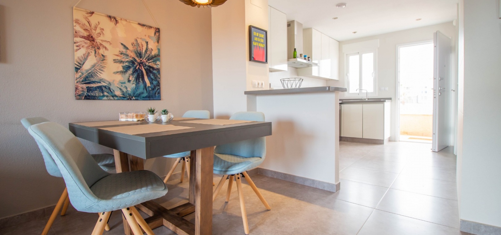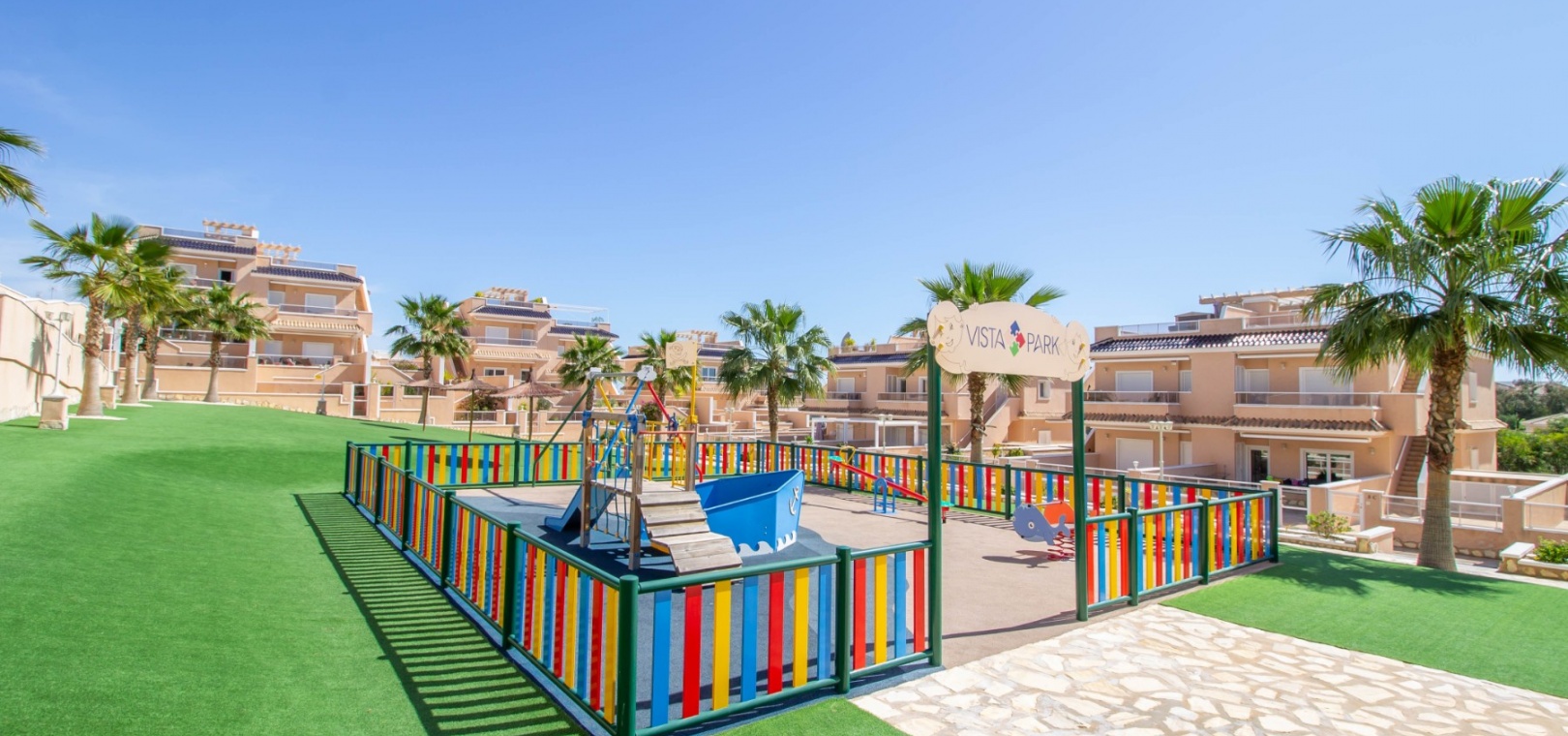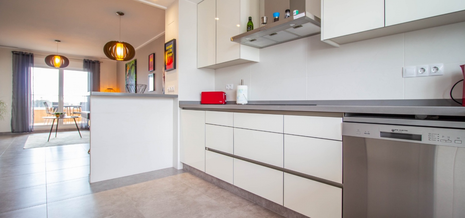 En sydostläge, som ny, två sovrum, första våningen lägenhet i Punta Prima, belägen bara 10 minuters promenad till Punta Marina kommersiella centrum, där du hittar JYSK, snabbköp, McDonalds, butiker, cafébarer/restauranger. Stranden ligger 5 minuter med bil, plus ett sjukhus och staden Torrevieja, känd för sin småbåtshamn och populära strandpromenad. Alla bekvämligheter på Orihuela Costa, inklusive shoppingcentret La Zenia Boulevard ligger inom en radie på 10 minuters bilresa och för golfare ett stort urval av banor. Själva komplexet har 2 gemensamma pooler (en är täckt och uppvärmd), trädgårdar, barnområde, spa/jacuzzi och biohälsosamt gym. Lägenheten består av: vardagsrum/matsal med skjutbara glasdörrar ut till en rymlig terrass, som erbjuder gott om utrymme för uteservering, med utsikt över den gemensamma poolen och trädgårdsområdet; rymligt kök med öppen planlösning med bardisk, dörr som leder till en uteplats på baksidan och dörr som leder till verktyget; två dubbelrum, master med tillgång till terrassen, lådor i den inbyggda garderoben och eget duschrum; ytterligare modernt duschrum. Extrafunktionerna inkluderar luftkonditionering med kanal, golvuppvärmda badrum, plus att det finns en hiss i kvarteret och en underjordisk parkeringsplats. Du får alla "nybyggda" fördelar med denna fantastiska lägenhet.