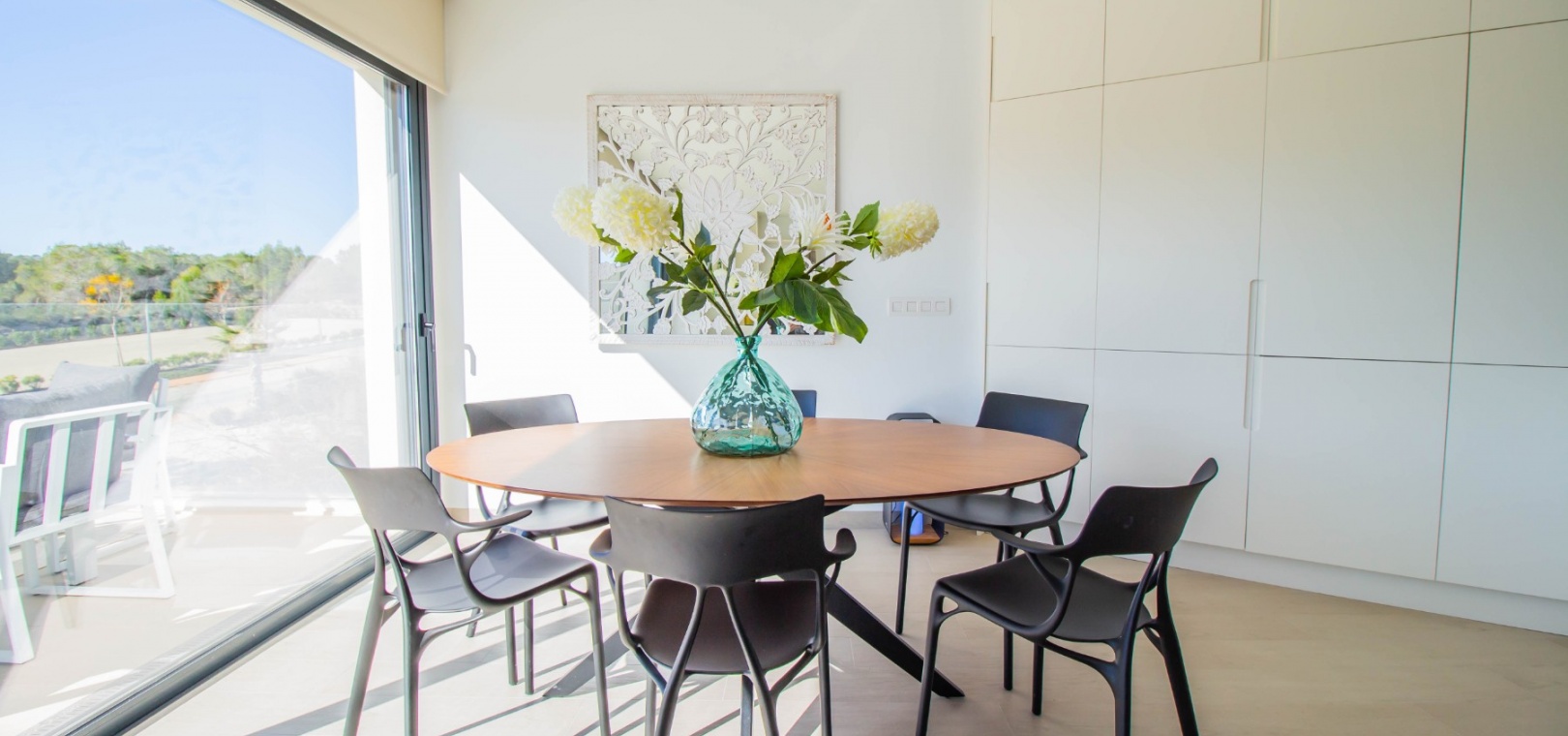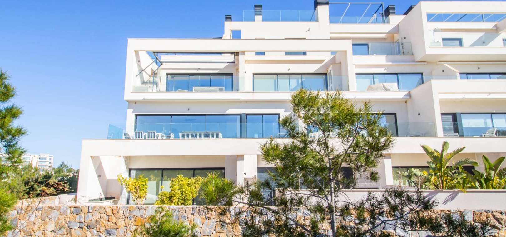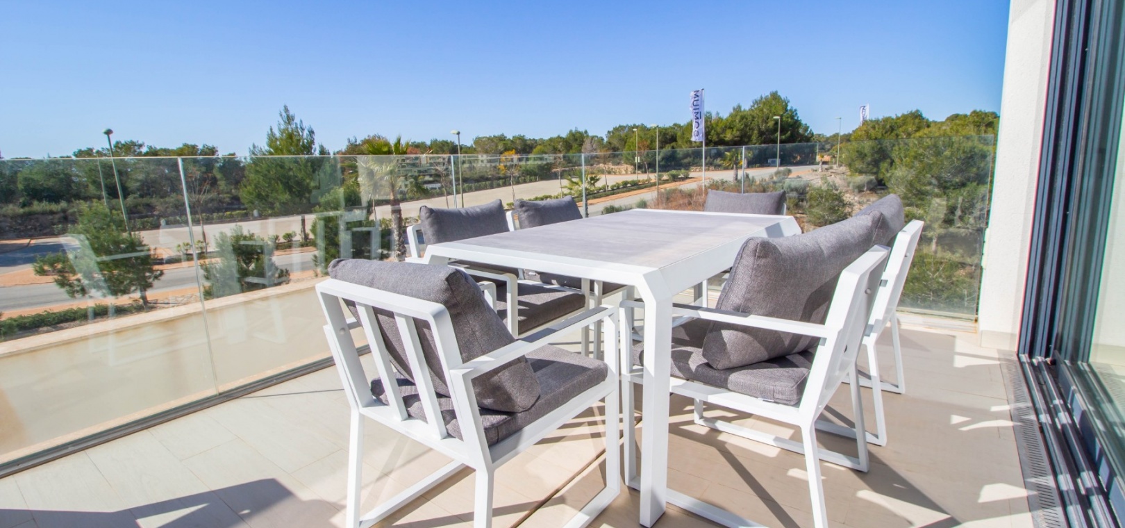 En söderläge lägenhet med tre sovrum på första våningen i Las Colinas Golf Resort, en prestigefylld 5-stjärnig resort med klubbhus, restaurang, bar och stormarknad. Bara fem minuter med bil har du alla bekvämligheter i San Miguel de Salinas; 10 minuter har du Villamartin eller till och med Campoamor och kusten med en mängd bekvämligheter och stränder. Denna rymliga lägenhet, byggd år 2000, på cirka 110 m2 erbjuder öppen planlösning, med vardagsrum/matsal med skjutdörrar från vägg till vägg som leder direkt ut till den mest otroliga terrassen, koppla av medan du njuter av en fridfull utsikt över ett skogsområde och vidsträckt havsutsikt; modernt utrustat kök; tre dubbelrum med inbyggda garderober, master bedroom med terrass och eget badrum; ytterligare ett familjebadrum med dusch. Komplexet inkluderar en hiss och ett fantastiskt gemensamt poolområde, plus extrafunktioner som ingår i fastigheten inkluderar: kanal luftkonditionering, golvvärme i badrum, hemautomation, hemdörr som stänger av sovrummen, en 12 m2 stor underjordisk parkeringsplats och 8 m2 förråd.