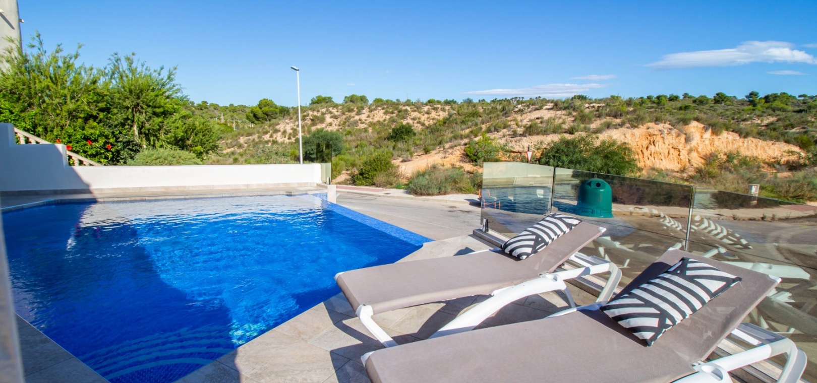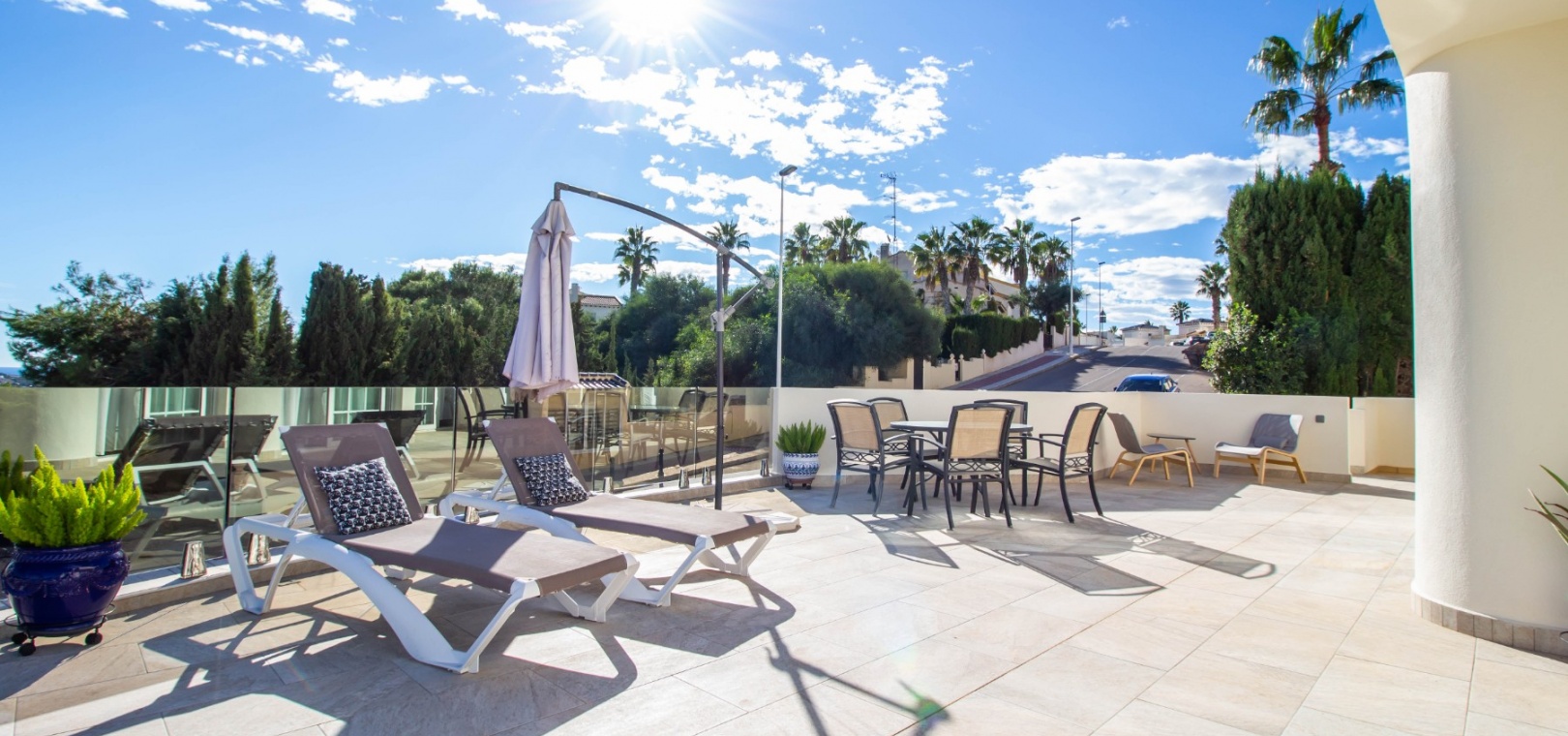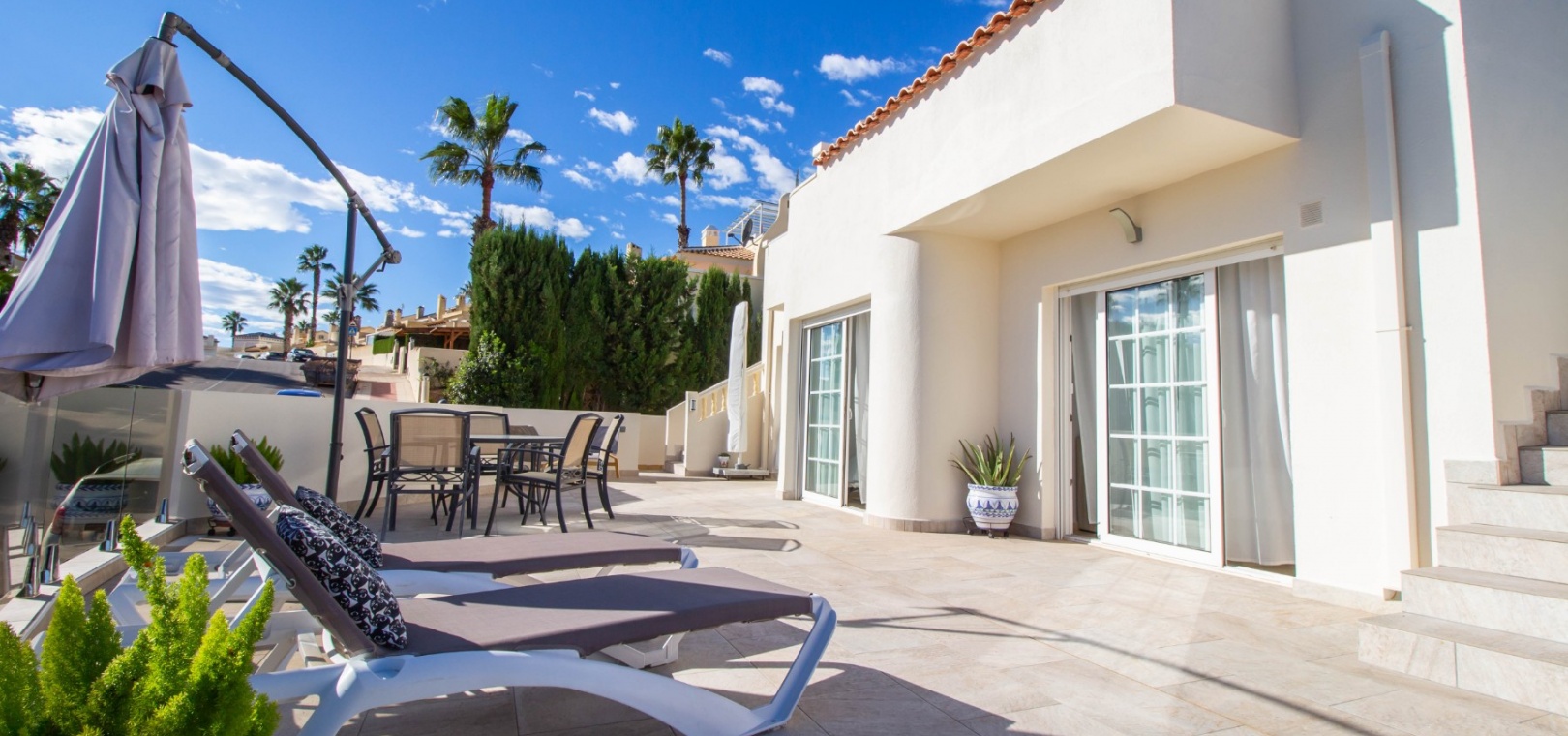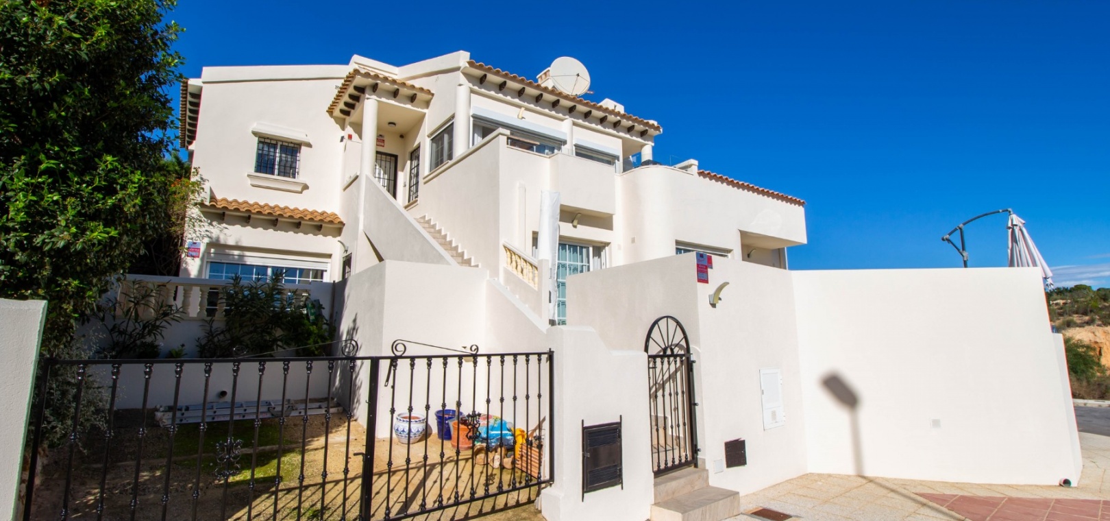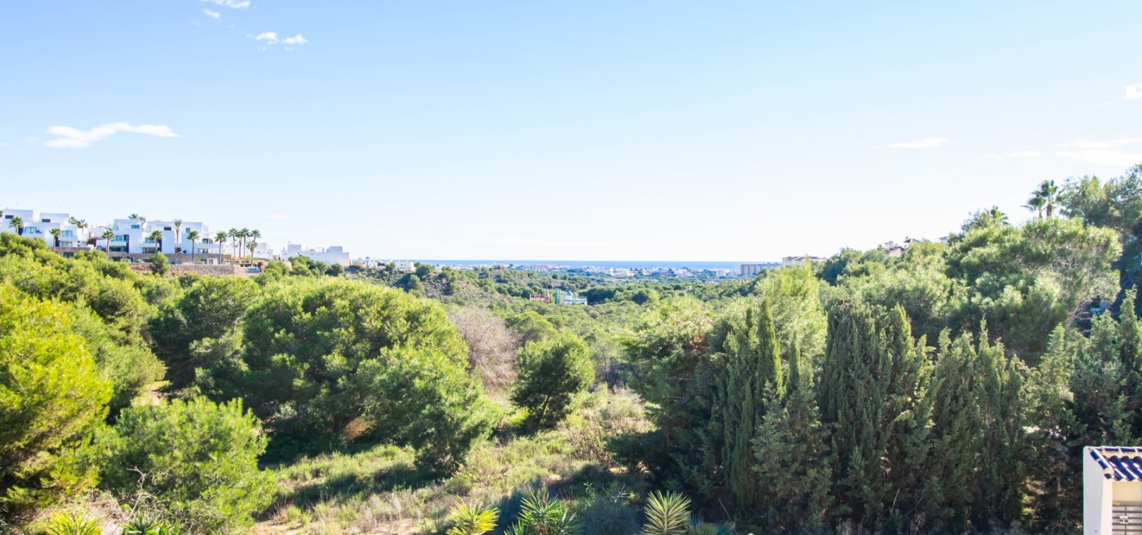 Denna fristående hörnvilla med fyra sovrum, som vetter mot sydost i Las Ramblas Golf, har renoverats omfattande och erbjuder en fridfull utsikt över skogen, som också ligger intill Campoamors golfbana. De närmaste barerna, restaurangerna och butikerna finns i La Fuentes centrum, som ligger cirka 5 minuter med bil, plus att det finns en stormarknad med storkedja. Stränderna längs Orihuela Costas kust ligger bara 10 minuters bilresa bort, plus att du har köpcentret La Zenia Boulevard där. Denna villa på cirka 161m2 fördelar sig med bostaden på första våningen, inklusive: vardagsrum med breda skjutdörrar som leder ut till en otroligt rymlig terrass, som har tillgång upp till det privata 35m2 solarium och grillplats; matplats som leder in i ett välutrustat kök med öppen planlösning; modernt duschrum. På bottenvåningen finns fyra dubbelrum, alla med inbyggda garderober, och alla har tillgång till uteområdet; garderob och ytterligare två duschrum (ett med eget badrum); ytterligare rum (kontor). Det finns terrängparkering, terrass och en privat infinitypool med utsikt över skogsområdet. Fastigheten har luftkonditionering och är ett måste att se.