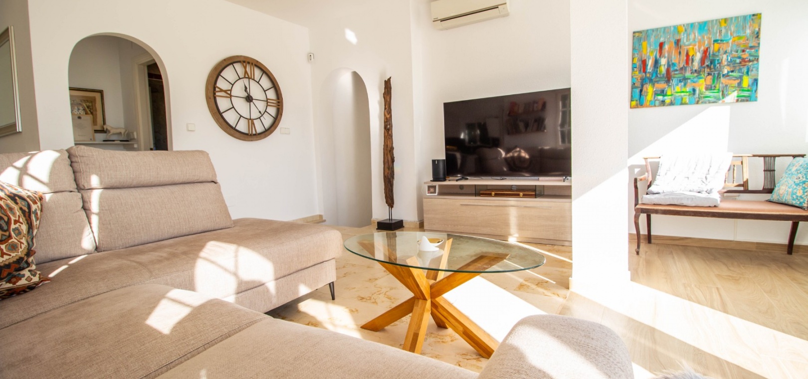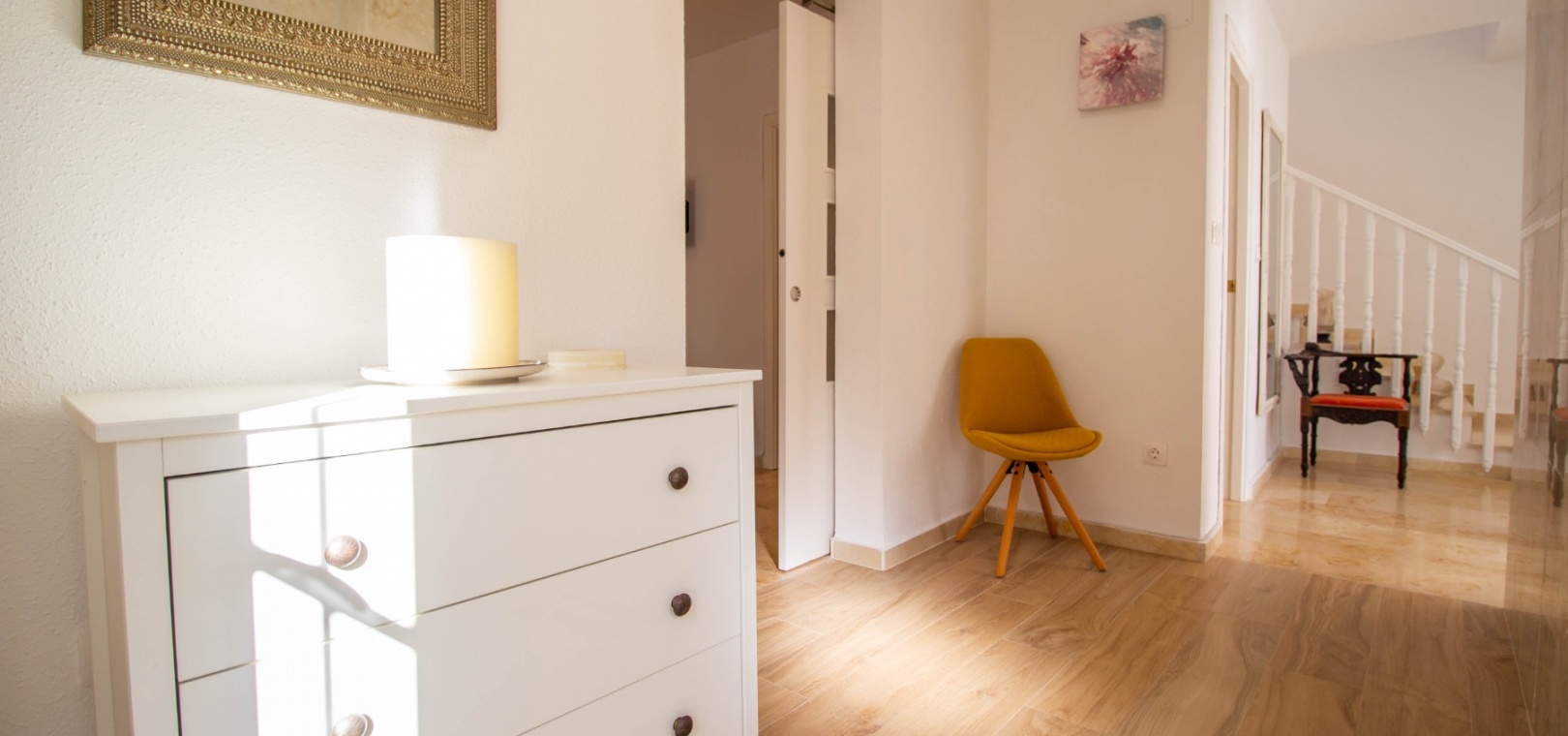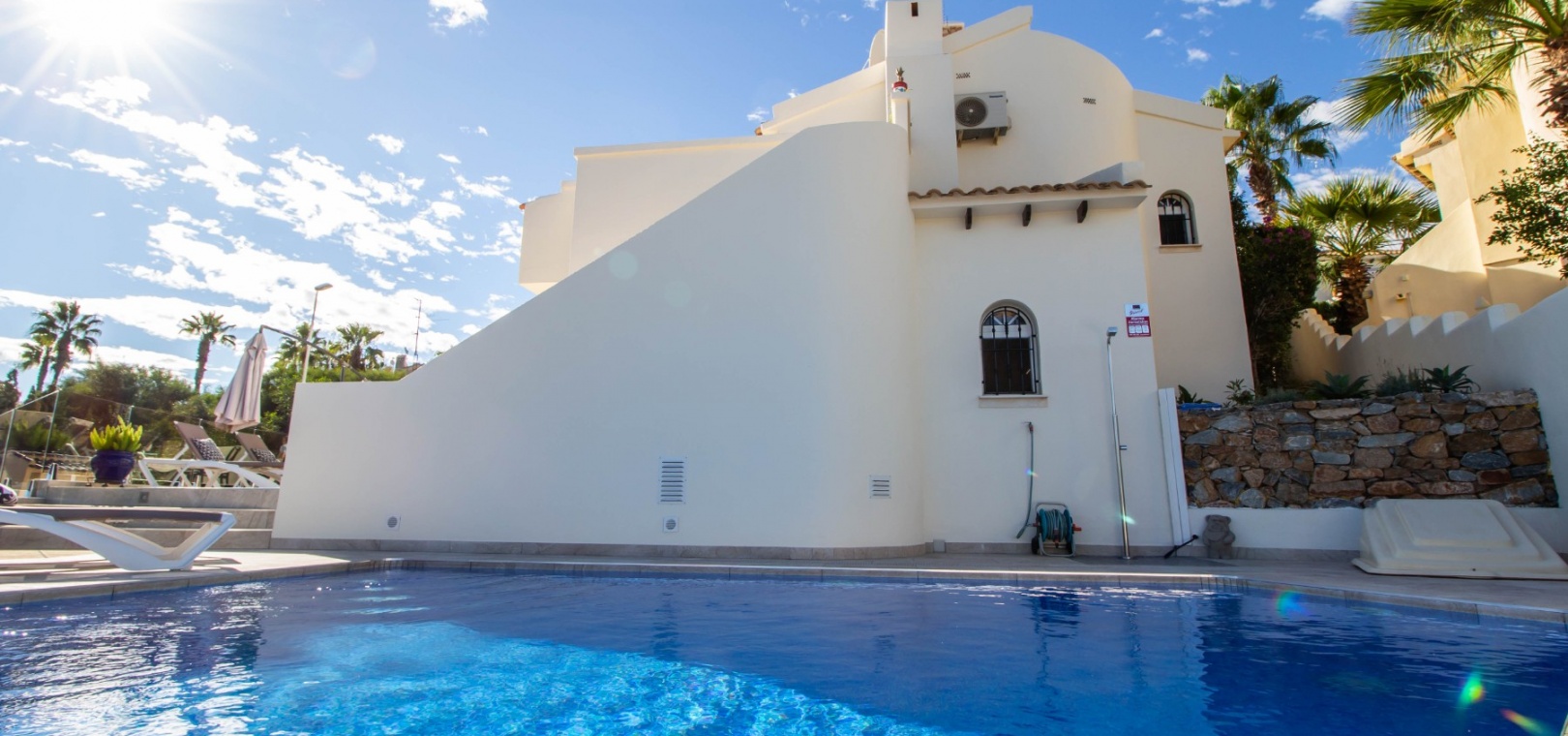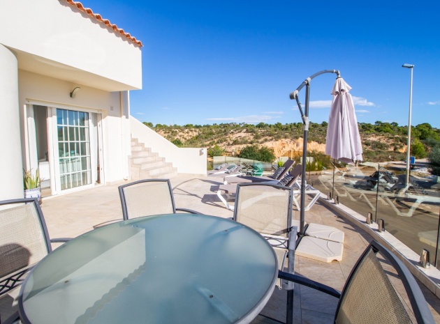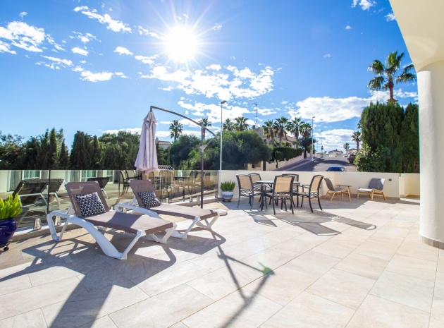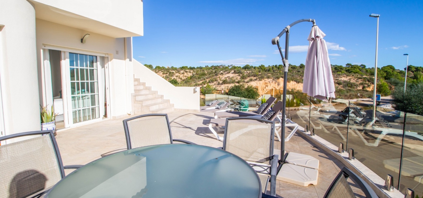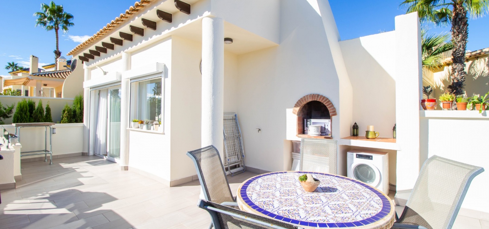 Denna fristående hörnvilla med fyra sovrum, som vetter mot sydost i Las Ramblas Golf, har renoverats omfattande och erbjuder en fridfull utsikt över skogen, som också ligger intill Campoamors golfbana. De närmaste barerna, restaurangerna och butikerna finns i La Fuentes centrum, som ligger cirka 5 minuter med bil, plus att det finns en stormarknad med storkedja. Stränderna längs Orihuela Costas kust ligger bara 10 minuters bilresa bort, plus att du har köpcentret La Zenia Boulevard där. Denna villa på cirka 161m2 fördelar sig med bostaden på första våningen, inklusive: vardagsrum med breda skjutdörrar som leder ut till en otroligt rymlig terrass, som har tillgång upp till det privata 35m2 solarium och grillplats; matplats som leder in i ett välutrustat kök med öppen planlösning; modernt duschrum. På bottenvåningen finns fyra dubbelrum, alla med inbyggda garderober, och alla har tillgång till uteområdet; garderob och ytterligare två duschrum (ett med eget badrum); ytterligare rum (kontor). Det finns terrängparkering, terrass och en privat infinitypool med utsikt över skogsområdet. Fastigheten har luftkonditionering och är ett måste att se.