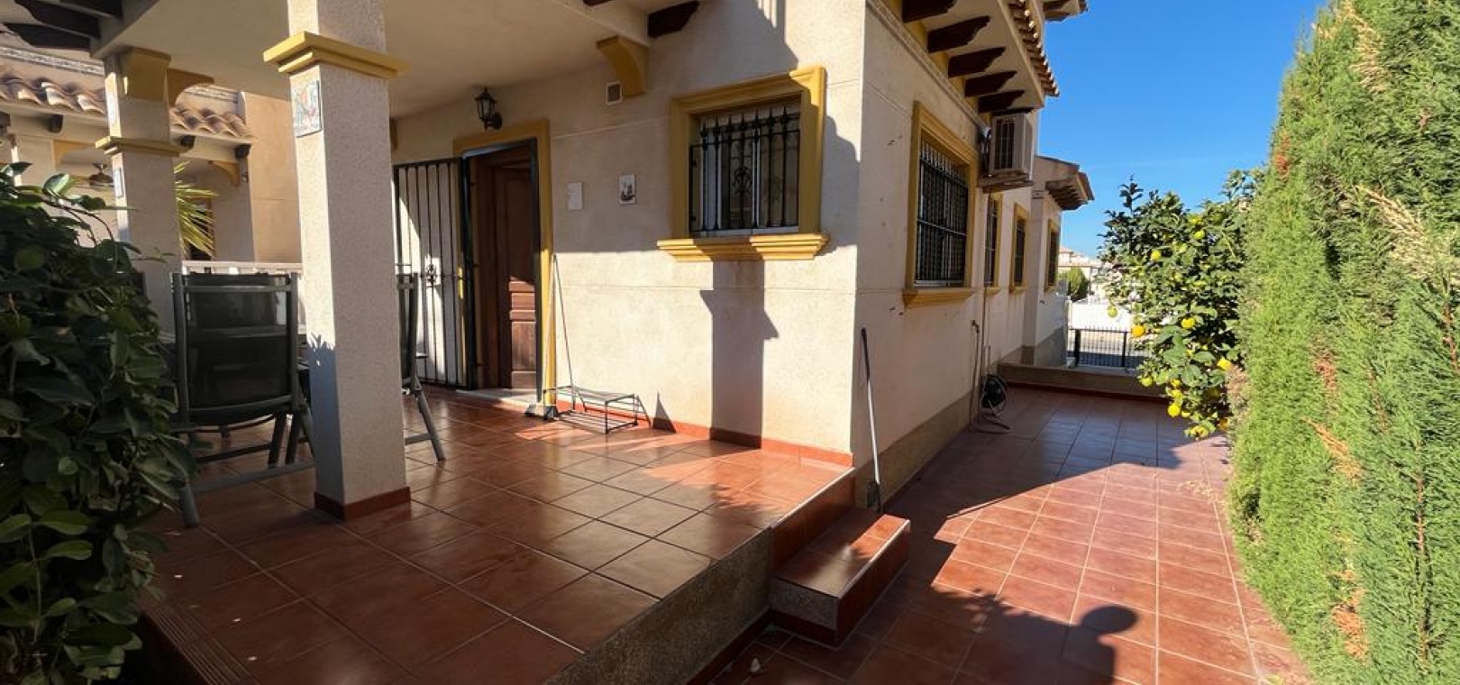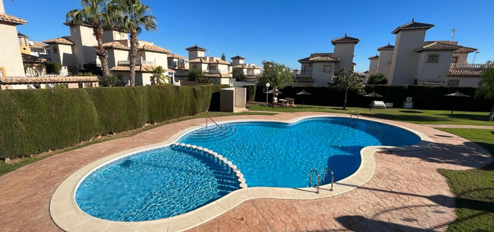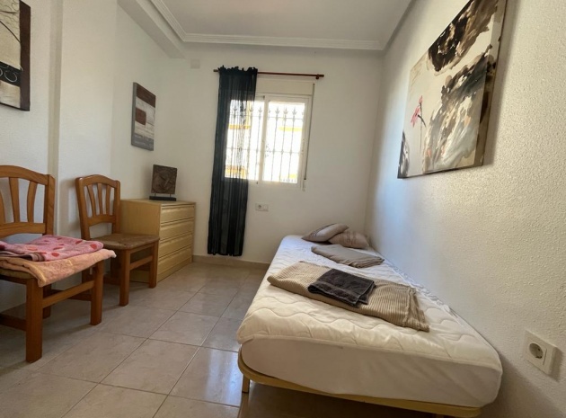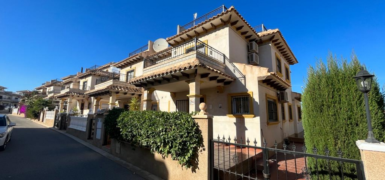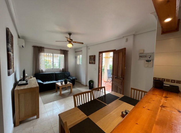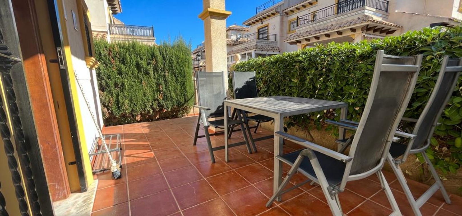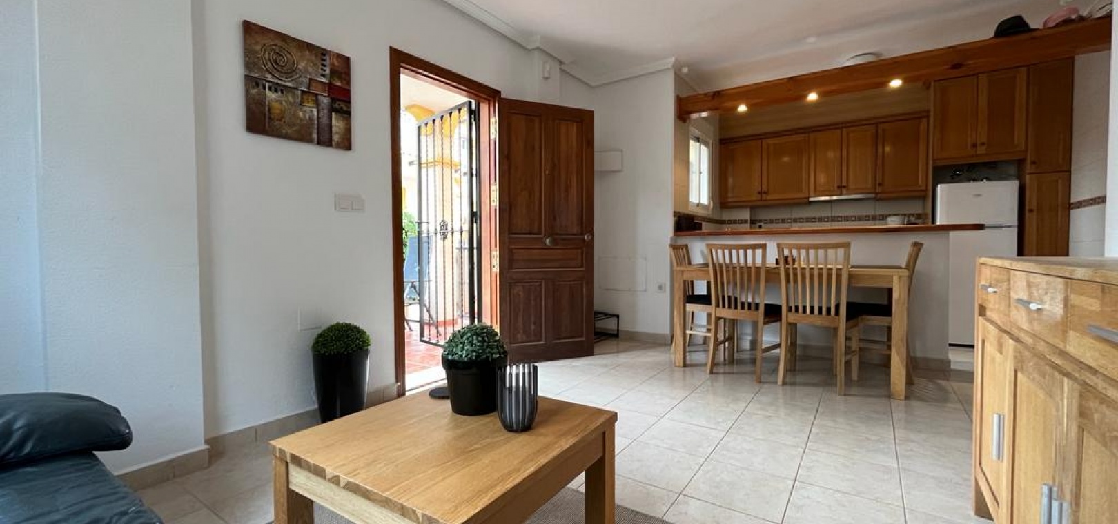 Ett söderläge fyrbäddshus med 3 sovrum och 1,5 badrum med privat takterrass i Res. San Jose, La Zenia, Costa Blanca. Denna härliga fastighet säljs i gott skick, säljs möblerad och består mycket kortfattat av följande:- På bottenvåningen finns en lounge/matsal med varm och kall A/C, ett fullt utrustat kök med öppen planlösning med alla vitvaror , 1 x dubbelrum och ett 1 x W/C. Interna trappor leder till första våningen där det finns 2 x dubbelrum båda med inbyggda garderober och varm och kall A/C och det största sovrummet har en privat solbalkong och 1 x stort duschrum. Intern trappa leder till det privata taksolarium med ett annat rum/förråd. Utanför finns en terrass på framsidan, trädgård på framsidan och sidan och en uppfart för off-road parkering. Den gemensamma poolen ligger bara en kort promenad bort. Den har ett mycket bra läge, cirka 20 minuters promenad till det mycket stora köpcentret Zenia Boulevard och cirka 15 minuters promenad från Cabo Roig-remsan där du hittar många barer, butiker och restaurang & ca 10 minuters promenad till stranden. Alicantes flygplats ligger 50 minuters bilresa bort.