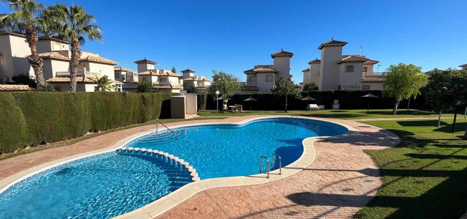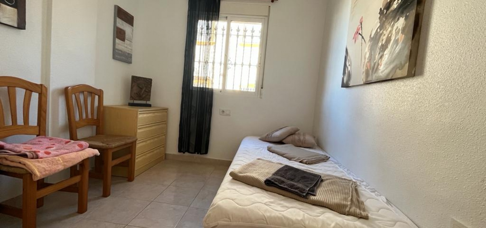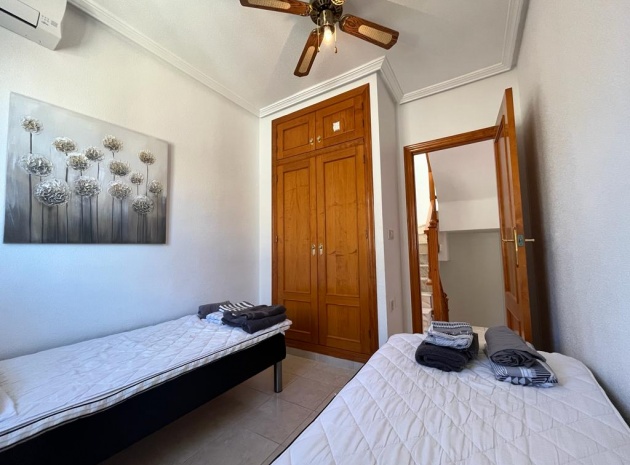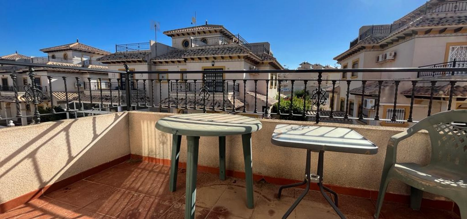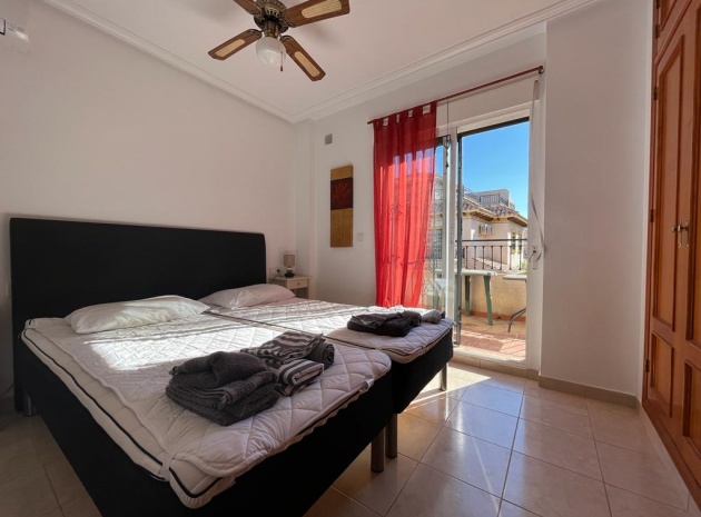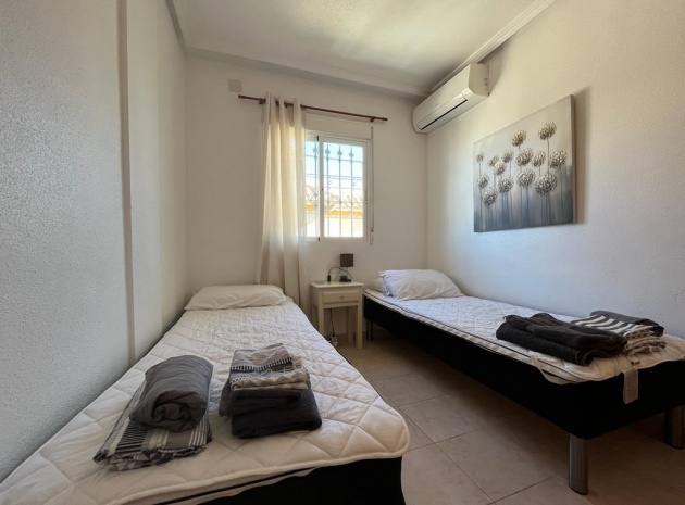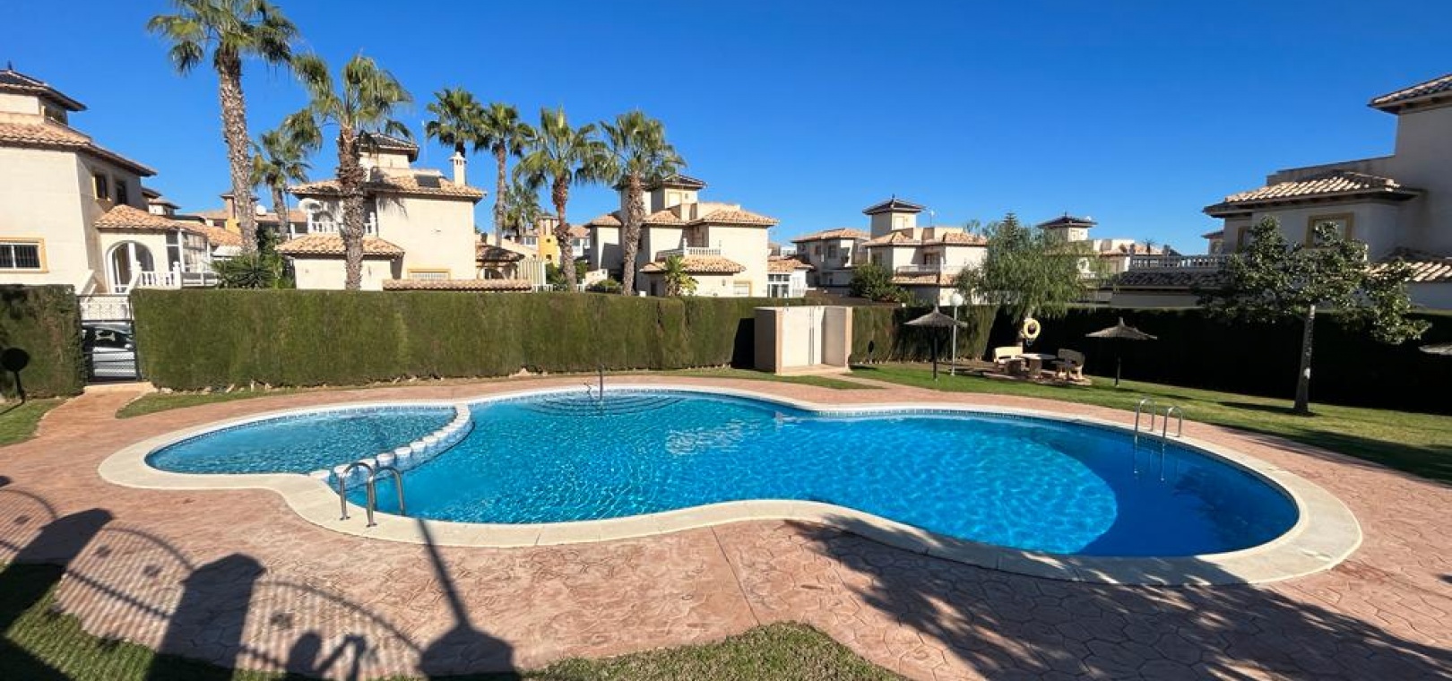 Ett söderläge fyrbäddshus med 3 sovrum och 1,5 badrum med privat takterrass i Res. San Jose, La Zenia, Costa Blanca. Denna härliga fastighet säljs i gott skick, säljs möblerad och består mycket kortfattat av följande:- På bottenvåningen finns en lounge/matsal med varm och kall A/C, ett fullt utrustat kök med öppen planlösning med alla vitvaror , 1 x dubbelrum och ett 1 x W/C. Interna trappor leder till första våningen där det finns 2 x dubbelrum båda med inbyggda garderober och varm och kall A/C och det största sovrummet har en privat solbalkong och 1 x stort duschrum. Intern trappa leder till det privata taksolarium med ett annat rum/förråd. Utanför finns en terrass på framsidan, trädgård på framsidan och sidan och en uppfart för off-road parkering. Den gemensamma poolen ligger bara en kort promenad bort. Den har ett mycket bra läge, cirka 20 minuters promenad till det mycket stora köpcentret Zenia Boulevard och cirka 15 minuters promenad från Cabo Roig-remsan där du hittar många barer, butiker och restaurang & ca 10 minuters promenad till stranden. Alicantes flygplats ligger 50 minuters bilresa bort.