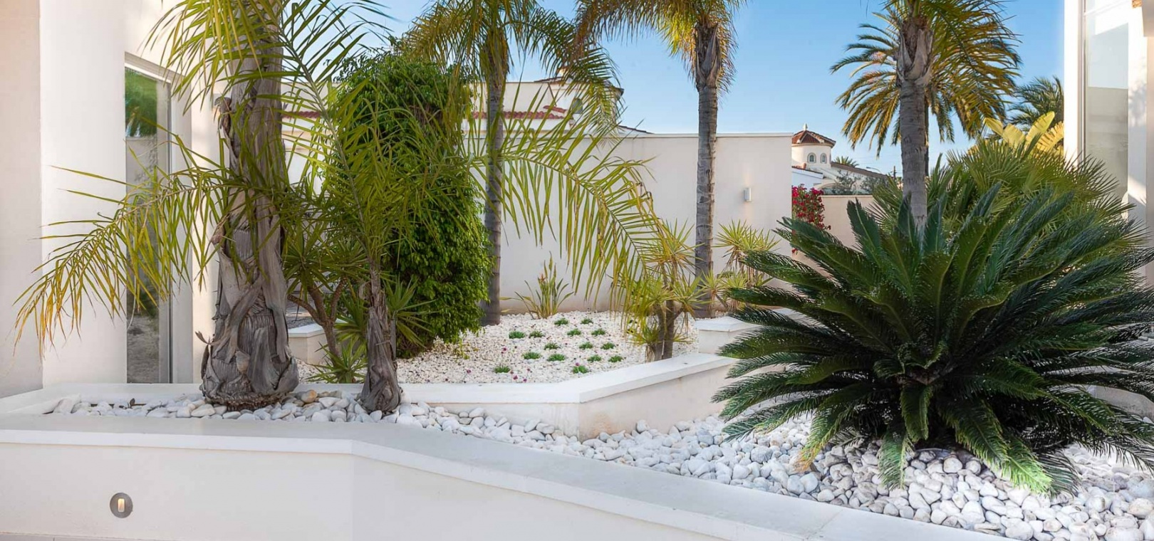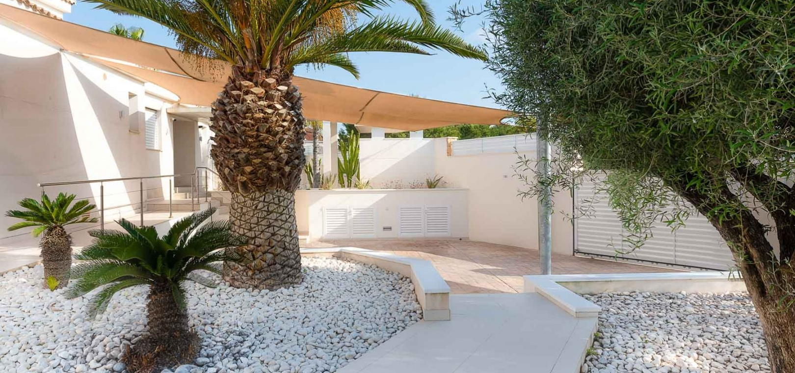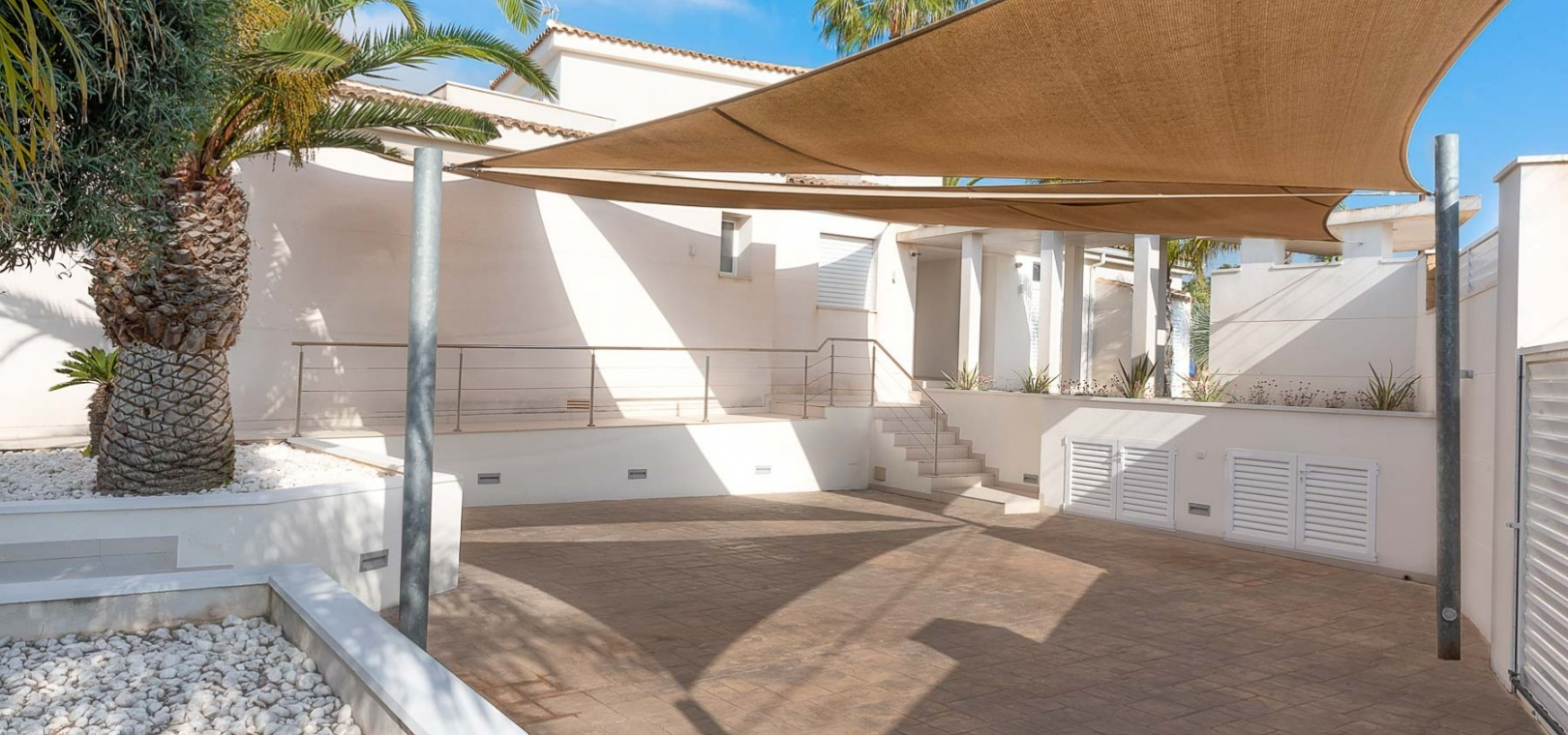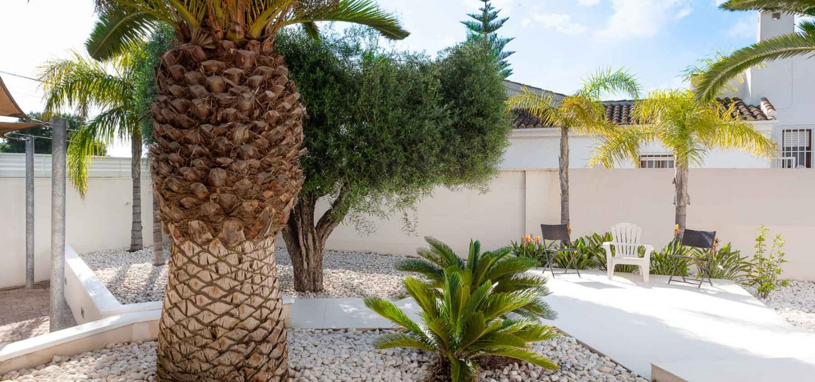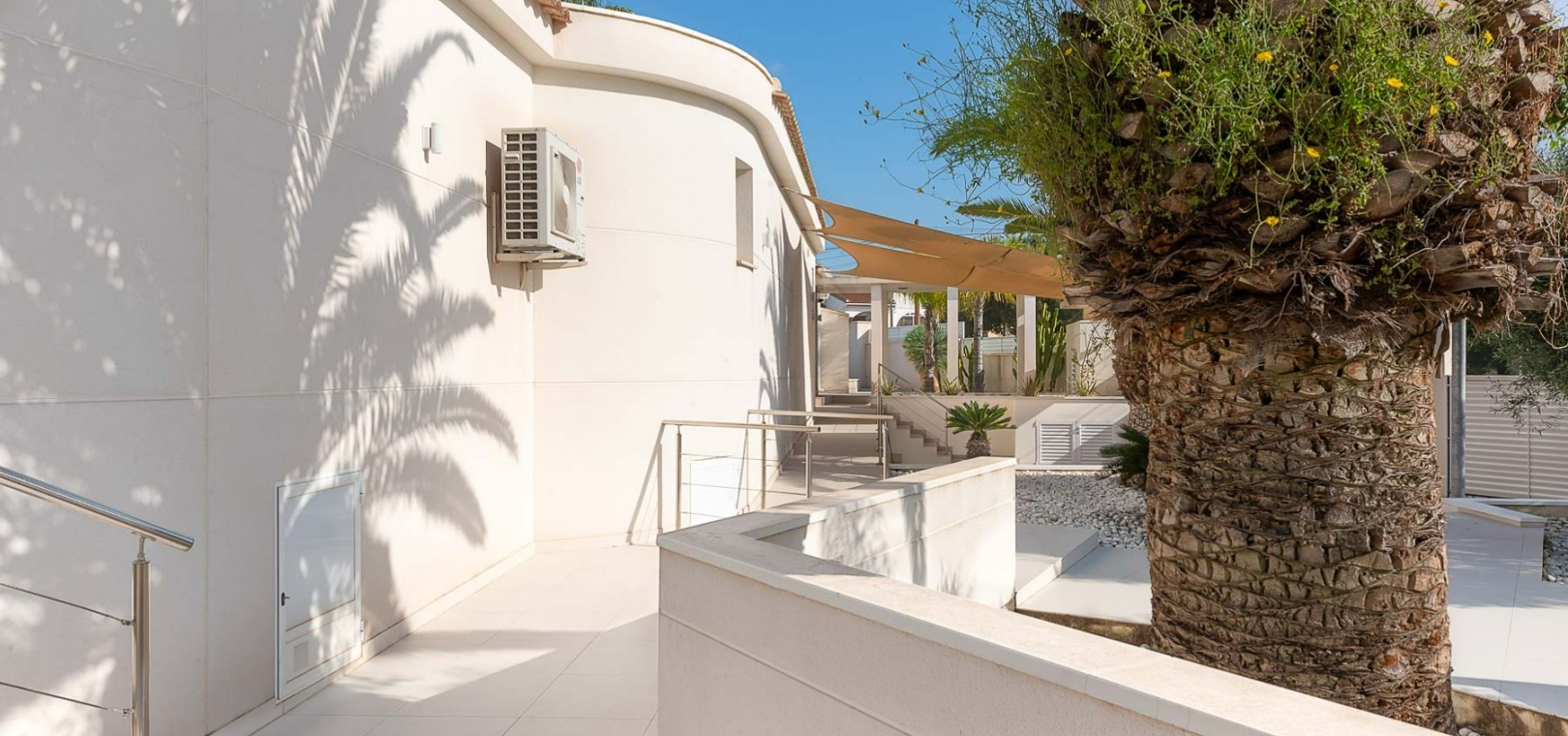 Attraktiv helrenoverad villa i centrum av Ciudad Quesada, Rojales. Detta lyxhus har unika solförhållanden och det är en fastighet med härlig utsikt. Tomten är på 2 244 m2, och fint planterad med palmer, fruktträd och olivträd. Ägaren har behållit husets charmiga stil vilket ger bostaden en särprägel av att vara ett hem. Det finns 2 kompletta utomhuskök på vardera sidan av poolen. Du kan röra dig efter solförhållandena både sommar och vinter, om du vill ha morgonsol och/eller kvällssol. I huvudbyggnaden finns 3 sovrum fördelade på 2 våningar. I trädgården finns ett garage med ytterligare en våning ovanför, med stor potential att bli ett vackert hus med vardagsrum, kök, 2 sovrum och badrum. Detta behöver renovering/renovering. Vacker utsikt från terrassen här.I trädgården finns en stor vacker saltvattenpool på 6x12m, med ljust kakel som ger en varm känsla av att bada i Karibiska havet. Vackert på kvällen med belysning. I huvuddelen kommer du in i en hall, och sedan in i ett modernt ljust kök med stora franska dubbelfönster, som vetter mot den enorma terrassen. Då har du en matplats och en soffgrupp med direkt utsikt mot poolområdet. På samma våning finns ett rymligt TV-rum. På första våningen finns ett kontor med klädkammare, sedan kommer man till en hall, samt sovrum med dusch och separat toalett. Från terrassen här kan du njuta av den underbara morgonsolen. I den andra delen av huset har du 2 sovrum och 2 badrum. Det finns stora dubbelfönster till både vardagsrum, sovrum och badrum. Ett av badrummen har dusch och bubbelbadkar. Vid badet finns stora skjutdörrar i glas, som man kan öppna ända upp. Här kan du njuta av utsikten över poolområdet, speciellt på kvällen när all belysning är tänd i både pool och trädgård. Vid altanen utanför vardagsrummet och köket finns stora ljusa kakelplattor av hög kvalitet i porslin. Samma kakel finns även i både uteköken, vid poolområdet och vid förrådet för trädgårdsmöblerna.-------------------------------- -------------------------- --------------- Isolerade golv och väggar.- Isolerade fönster och dörrar .- Vattenburen värme med termostater i varje rum på entréplan.- Hall och badrum på övervåningen har termostatstyrda värmekablar.- Uppvärmning på gas - "high end" holländskt system.- Handdukstork i badrummen.- Alla innerbelysningar är LED med dimmers.- Alla utomhusljus är LED.- Integrerad luftkonditionering, varm/kall, med rumsfördelningsfunktion.- 6 x 12 meter saltvattenpool.- Öppen spis i vardagsrum, med Bioetanol.- 2 innergårdar med två oberoende elektriska grindar med fjärrkontroll.- Kameraövervakning med inspelningsfunktion.- Larm.- Säker.- Alla golvplattor i porslin - även väggklinker i alla badrum.- Natursten på flera sektioner ute och inne.- Skugga över flera ställen av utomhus ytor.- Vinskåp i köket.- Bioetanol "eldstad" bakom induktionshällen i köket.- Nya vitvaror inklusive alla vitvaror.- Tvättstuga med extra stort kylskåp, tvättmaskin och diskbänk.- Automatiskt bevattningssystem i trädgården. - Garage för förvaring av cykel med mera. - Parkeringsplats för 4 bilar med markis.- Många låsbara förråd.- Pizzaugn.- Förråd för trädgårdsmöbler.- Utekök 1: Diskbänk, spis, diskmaskin och kyl. Badrum m/dusch och tvättstuga.- Utekök 2: Ny panna, diskho, kyl, grill och dusch.- Bar: Industrikylskåp för bar med 3 glasdörrar, diskho, stereo med egen förstärkare och subwoofer, tapptorn.Det är 10 minuters promenad till centrum, Consum, och den populära restaurangen Grande Italia. Vid infarten till tomten finns en park, och det är mindre trafik i detta område. Ciudad Quesada är en av de mest populära urbaniseringarna på Costa Blanca-kusten. Området kan erbjuda norska skolor, otaliga restauranger, butiker, apotek och bowling. Det finns även utomhusaktiviteter som tennis, fotboll, basket, minigolf, gocart och vattenpark. Rojales kan också erbjuda ett antal attraktioner som museum, grottor, arkeologiskt museum och gårdsmuseum. I Rojales har du Rio Segura, floden som rinner genom staden och hela vägen till havet och Guardamars småbåtshamn. Här kan du gå eller cykla och köra bil. Stora vackra parker alldeles intill, med lekplats, gym, grillplatser och sittplatser. Underbart fågelliv här. Det är 40 minuter med bil till flygplatsen i Alicante och 12 minuter med bil till havet.