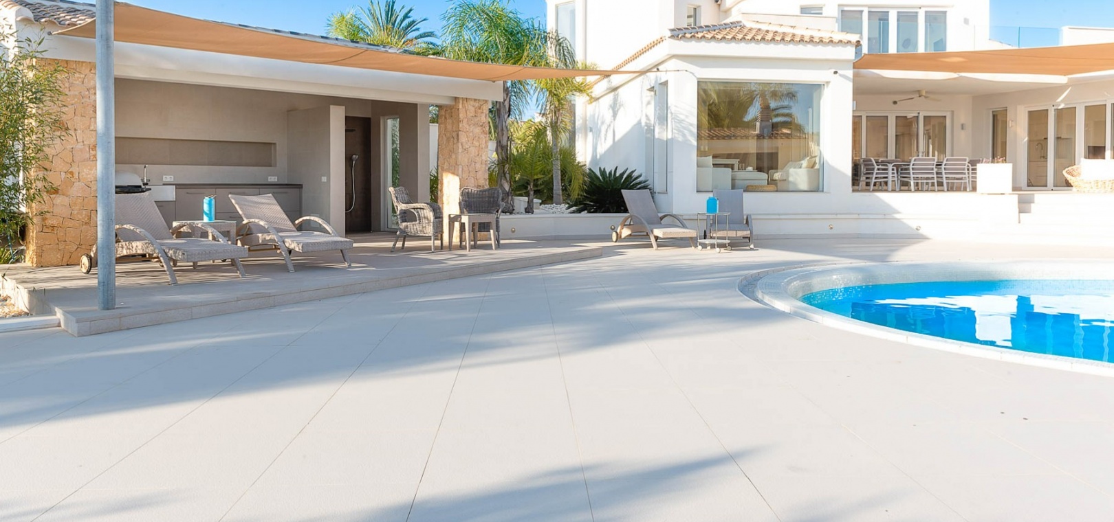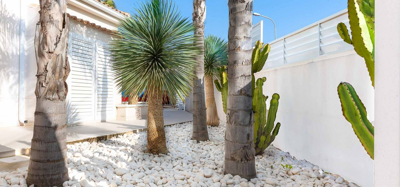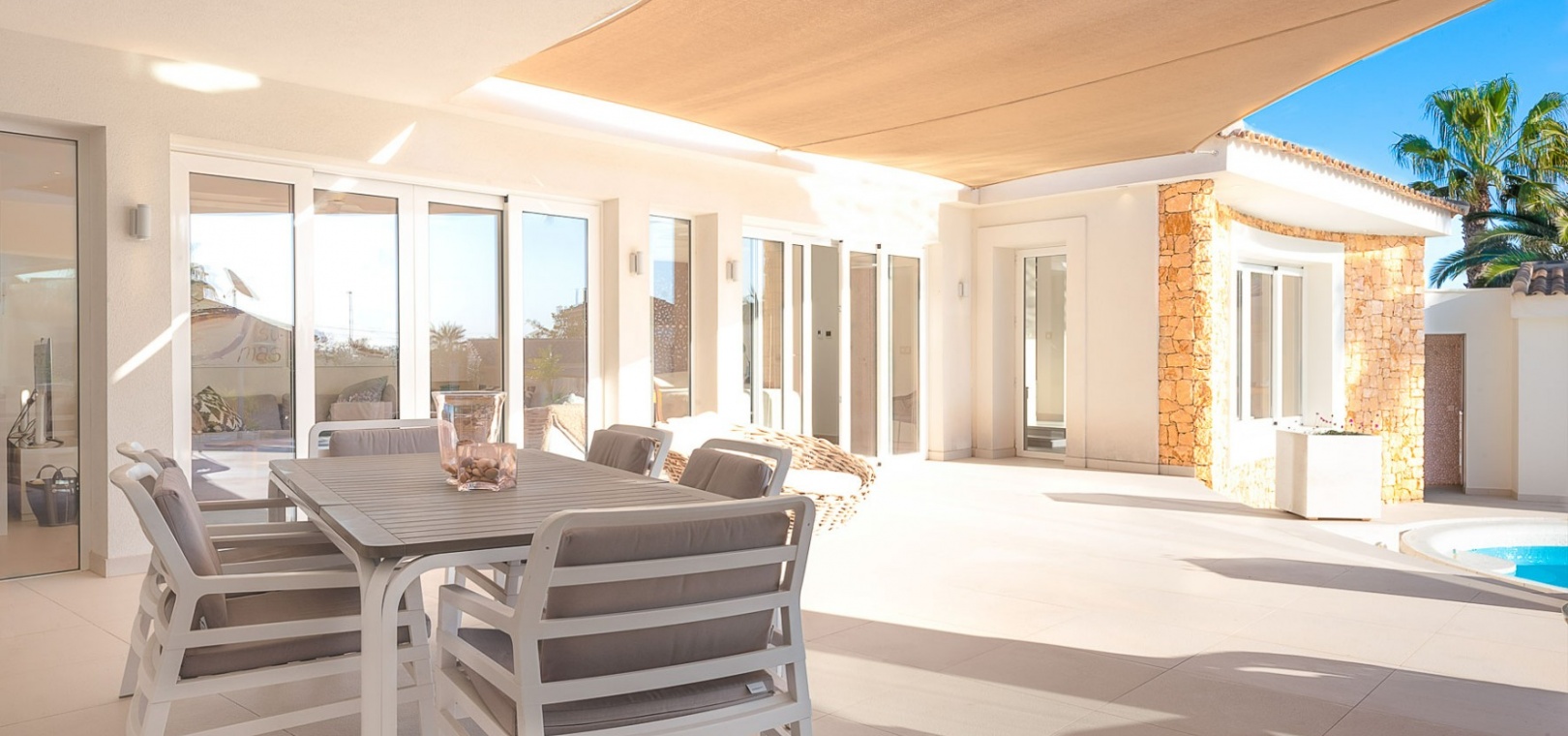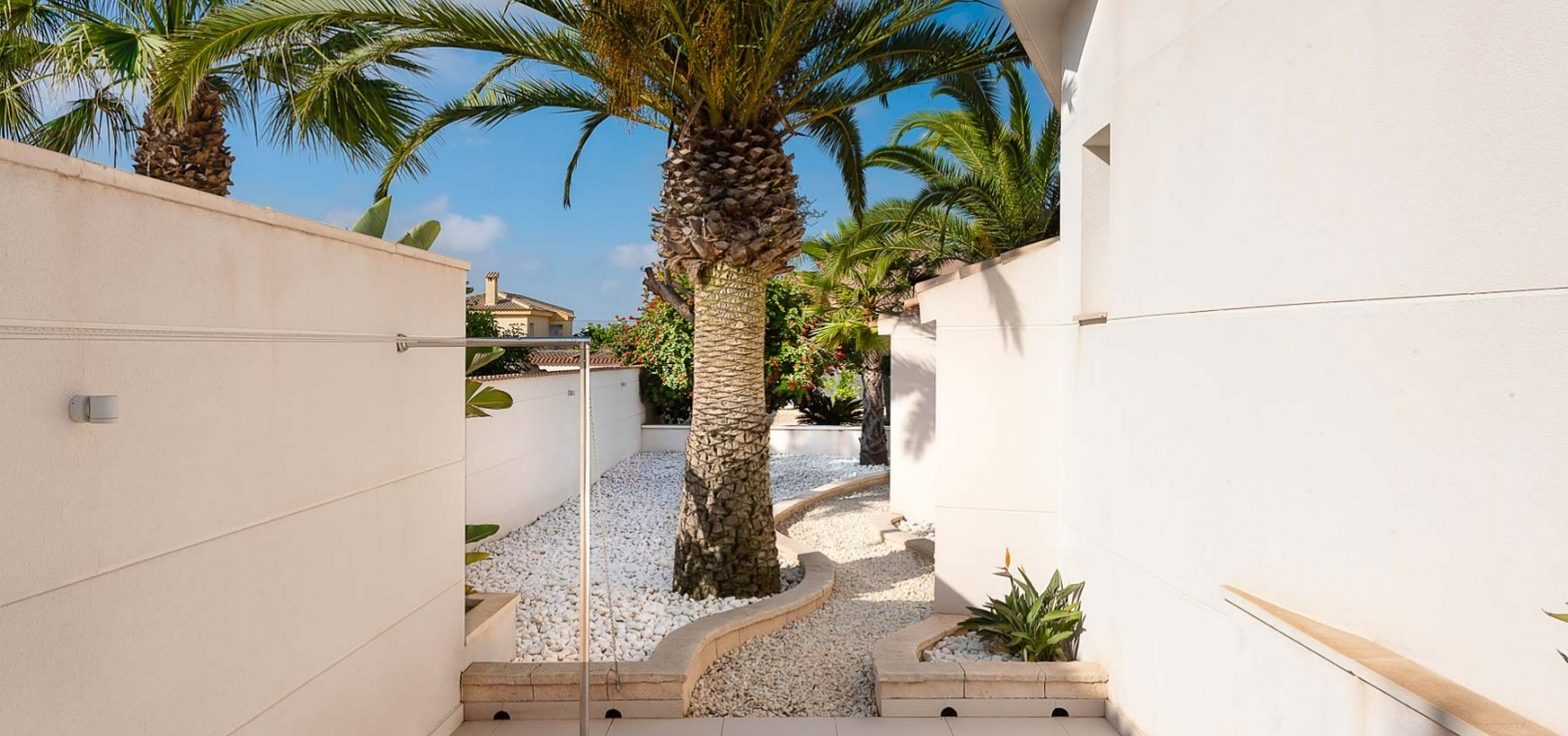 Attraktiv helrenoverad villa i centrum av Ciudad Quesada, Rojales. Detta lyxhus har unika solförhållanden och det är en fastighet med härlig utsikt. Tomten är på 2 244 m2, och fint planterad med palmer, fruktträd och olivträd. Ägaren har behållit husets charmiga stil vilket ger bostaden en särprägel av att vara ett hem. Det finns 2 kompletta utomhuskök på vardera sidan av poolen. Du kan röra dig efter solförhållandena både sommar och vinter, om du vill ha morgonsol och/eller kvällssol. I huvudbyggnaden finns 3 sovrum fördelade på 2 våningar. I trädgården finns ett garage med ytterligare en våning ovanför, med stor potential att bli ett vackert hus med vardagsrum, kök, 2 sovrum och badrum. Detta behöver renovering/renovering. Vacker utsikt från terrassen här.I trädgården finns en stor vacker saltvattenpool på 6x12m, med ljust kakel som ger en varm känsla av att bada i Karibiska havet. Vackert på kvällen med belysning. I huvuddelen kommer du in i en hall, och sedan in i ett modernt ljust kök med stora franska dubbelfönster, som vetter mot den enorma terrassen. Då har du en matplats och en soffgrupp med direkt utsikt mot poolområdet. På samma våning finns ett rymligt TV-rum. På första våningen finns ett kontor med klädkammare, sedan kommer man till en hall, samt sovrum med dusch och separat toalett. Från terrassen här kan du njuta av den underbara morgonsolen. I den andra delen av huset har du 2 sovrum och 2 badrum. Det finns stora dubbelfönster till både vardagsrum, sovrum och badrum. Ett av badrummen har dusch och bubbelbadkar. Vid badet finns stora skjutdörrar i glas, som man kan öppna ända upp. Här kan du njuta av utsikten över poolområdet, speciellt på kvällen när all belysning är tänd i både pool och trädgård. Vid altanen utanför vardagsrummet och köket finns stora ljusa kakelplattor av hög kvalitet i porslin. Samma kakel finns även i både uteköken, vid poolområdet och vid förrådet för trädgårdsmöblerna.-------------------------------- -------------------------- --------------- Isolerade golv och väggar.- Isolerade fönster och dörrar .- Vattenburen värme med termostater i varje rum på entréplan.- Hall och badrum på övervåningen har termostatstyrda värmekablar.- Uppvärmning på gas - "high end" holländskt system.- Handdukstork i badrummen.- Alla innerbelysningar är LED med dimmers.- Alla utomhusljus är LED.- Integrerad luftkonditionering, varm/kall, med rumsfördelningsfunktion.- 6 x 12 meter saltvattenpool.- Öppen spis i vardagsrum, med Bioetanol.- 2 innergårdar med två oberoende elektriska grindar med fjärrkontroll.- Kameraövervakning med inspelningsfunktion.- Larm.- Säker.- Alla golvplattor i porslin - även väggklinker i alla badrum.- Natursten på flera sektioner ute och inne.- Skugga över flera ställen av utomhus ytor.- Vinskåp i köket.- Bioetanol "eldstad" bakom induktionshällen i köket.- Nya vitvaror inklusive alla vitvaror.- Tvättstuga med extra stort kylskåp, tvättmaskin och diskbänk.- Automatiskt bevattningssystem i trädgården. - Garage för förvaring av cykel med mera. - Parkeringsplats för 4 bilar med markis.- Många låsbara förråd.- Pizzaugn.- Förråd för trädgårdsmöbler.- Utekök 1: Diskbänk, spis, diskmaskin och kyl. Badrum m/dusch och tvättstuga.- Utekök 2: Ny panna, diskho, kyl, grill och dusch.- Bar: Industrikylskåp för bar med 3 glasdörrar, diskho, stereo med egen förstärkare och subwoofer, tapptorn.Det är 10 minuters promenad till centrum, Consum, och den populära restaurangen Grande Italia. Vid infarten till tomten finns en park, och det är mindre trafik i detta område. Ciudad Quesada är en av de mest populära urbaniseringarna på Costa Blanca-kusten. Området kan erbjuda norska skolor, otaliga restauranger, butiker, apotek och bowling. Det finns även utomhusaktiviteter som tennis, fotboll, basket, minigolf, gocart och vattenpark. Rojales kan också erbjuda ett antal attraktioner som museum, grottor, arkeologiskt museum och gårdsmuseum. I Rojales har du Rio Segura, floden som rinner genom staden och hela vägen till havet och Guardamars småbåtshamn. Här kan du gå eller cykla och köra bil. Stora vackra parker alldeles intill, med lekplats, gym, grillplatser och sittplatser. Underbart fågelliv här. Det är 40 minuter med bil till flygplatsen i Alicante och 12 minuter med bil till havet.