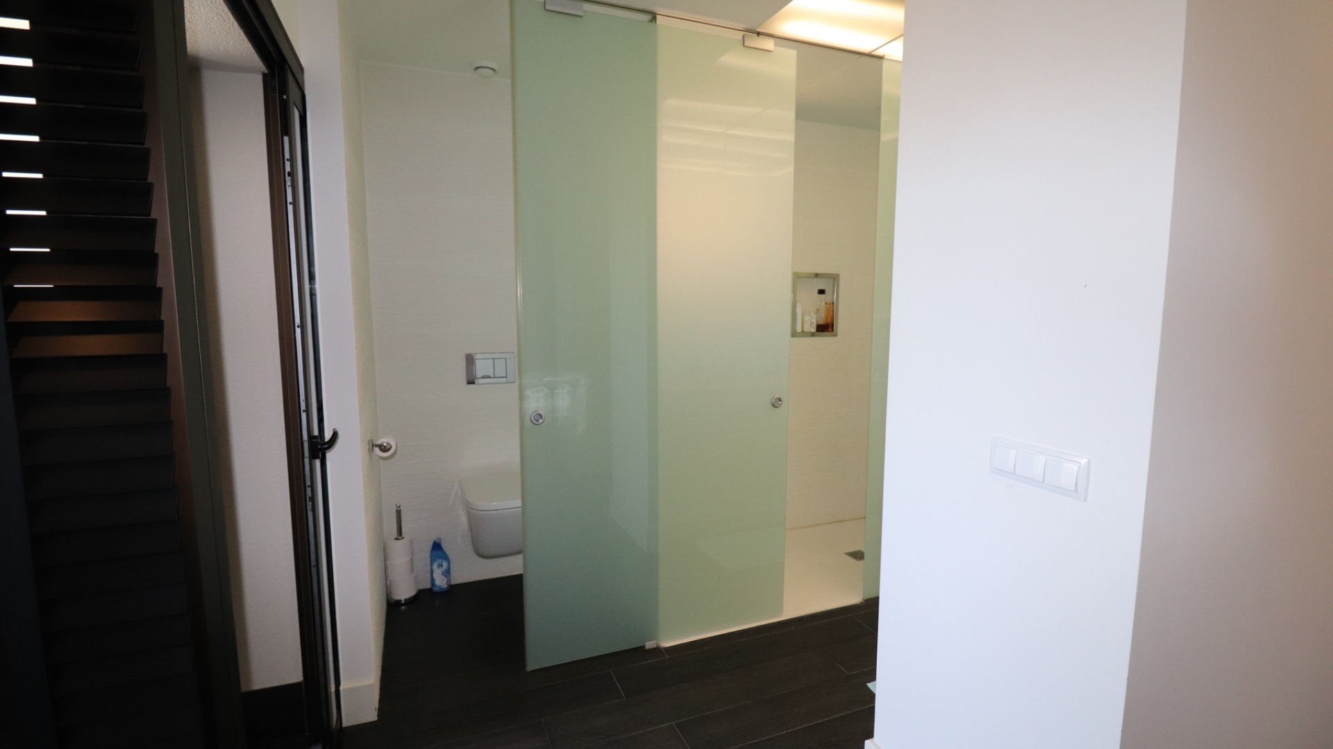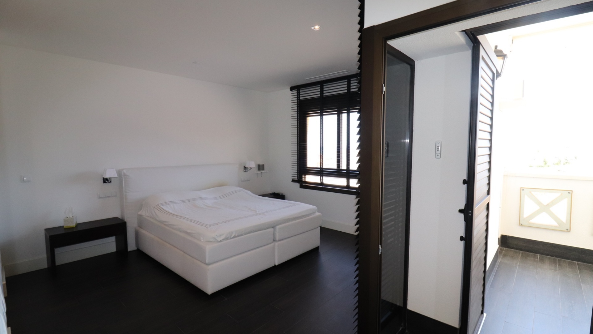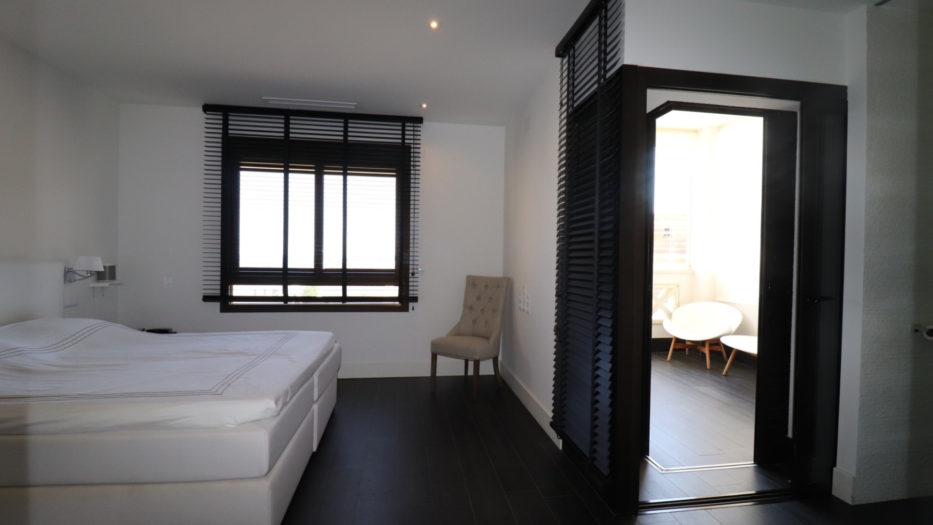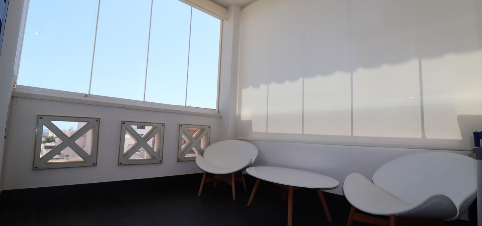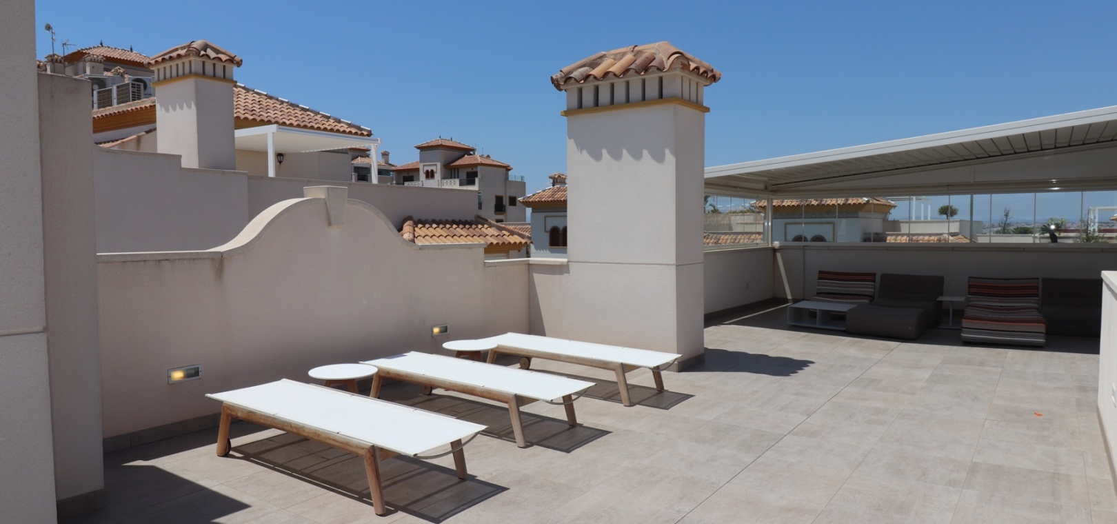 Med entusiasm presenterar vi denna vackra takvåning i Guardamar med fantastisk havsutsikt i det lyxiga komplexet Marjal Beach. Detta mycket välskötta bostadskomplex har en vackert anlagd trädgård med den gemensamma poolen. Den rymliga lägenheten består ursprungligen av två sammanfogade lägenheter, vilket skapar stora ytor. Takvåningen har 2 rymliga sovrum och ett tredje sovrum är möjligt. Båda sovrummen har ett eget badrum med klädkammare. Kvaliteten har inte sparats, vilket man märker när man tittar på lägenheten. Fastigheten har elektriska jalusier överallt. Köket är fullt utrustat med alla nödvändiga apparater. Det finns 2 mysiga terrasser på båda sidor av huset och via en invändig trappa når vi en rymlig takterrass med fantastisk havsutsikt. Takterrassen erbjuder mycket avskildhet och alla fönster kan öppnas. På vintern kan du också tillbringa en trevlig tid här på grund av de skjutbara fönstren på båda sidor av den mycket stora takterrassen. I köket finns en specialtillverkad mathiss så att dryck och snacks kan skickas upp via köket. Takterrassen har lyxiga elektriska persienner och ett Sonos musiksystem, du kan lyssna på musik i hela huset. Med hissen når du de 2 intilliggande garageplatserna med tillhörande förråd. Huset säljs möblerat. Allt handlar om läge och med denna takvåning gör du en bra investering. Mycket lämplig för permanentboende eller semesteruthyrning. De gemensamma utrymmena har utomhuspool, inomhuspool, gym, bastu och terrasser.