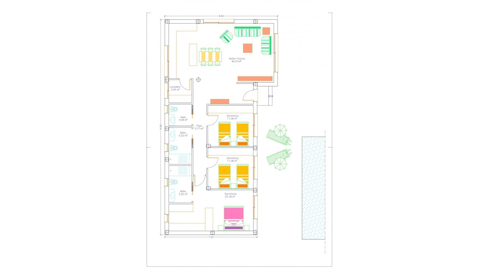 Villorna är utformade på en nivå med terrasser runt omkring och har 3 sovrum, inklusive omklädningsrum i det stora sovrummet, 2 badrum och en toalett.