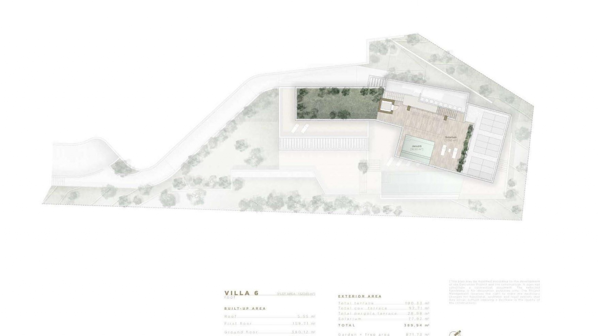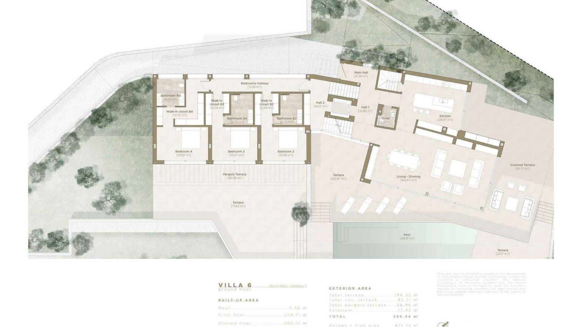 Den har 4 sovrum och ett eget omklädningsrum. Det fullt utrustade köket har en stor central ö och direkt tillgång till uteserveringen, med ett angränsande servicekök. Från denna nivå kan du njuta av olika täckta och otäckta verandor, med olika avkopplingsområden bredvid den vackra poolen, inklusive en grillplats. Källare med spelrum, vinkällare och ett garage med plats för 3-4 bilar. Villan har en andra källarvåning med ett stort gym, ångbad och biografrum.