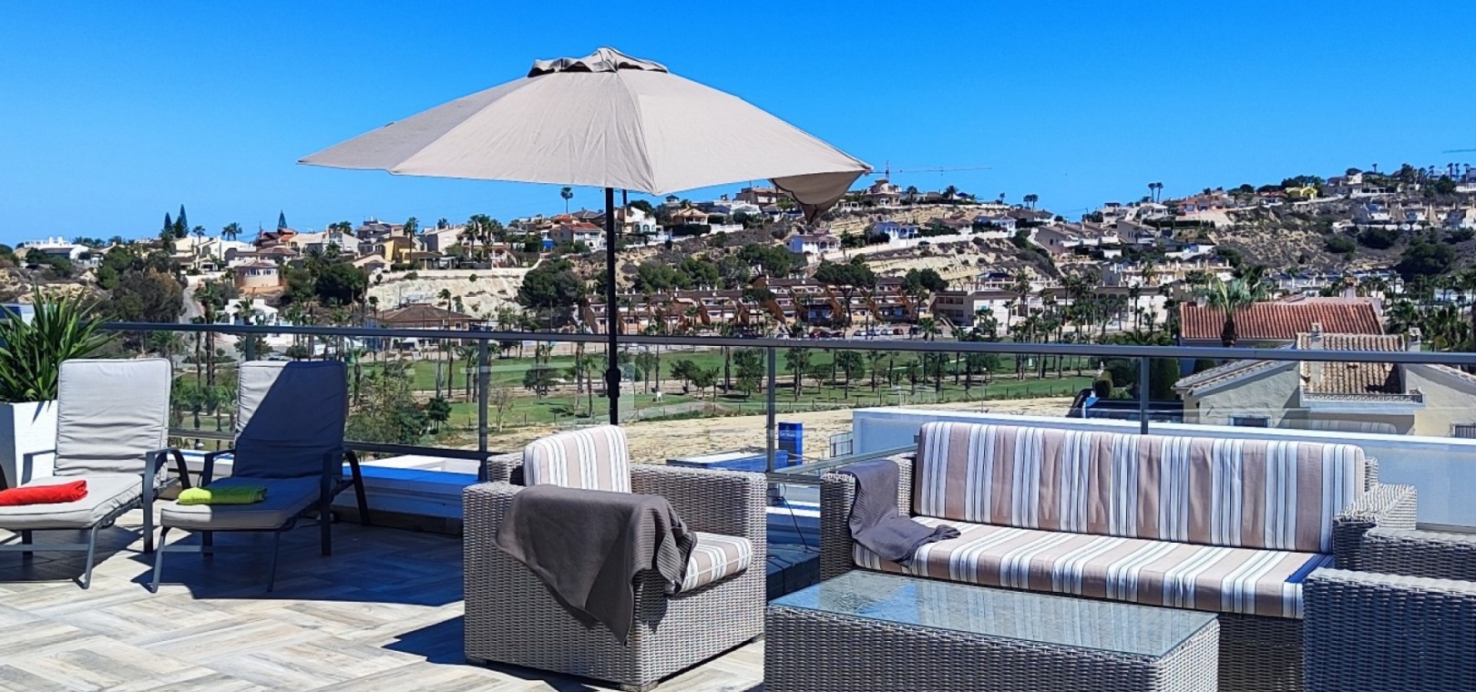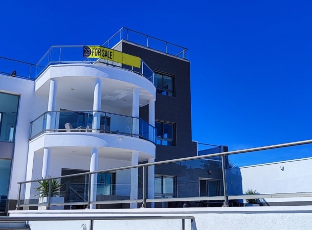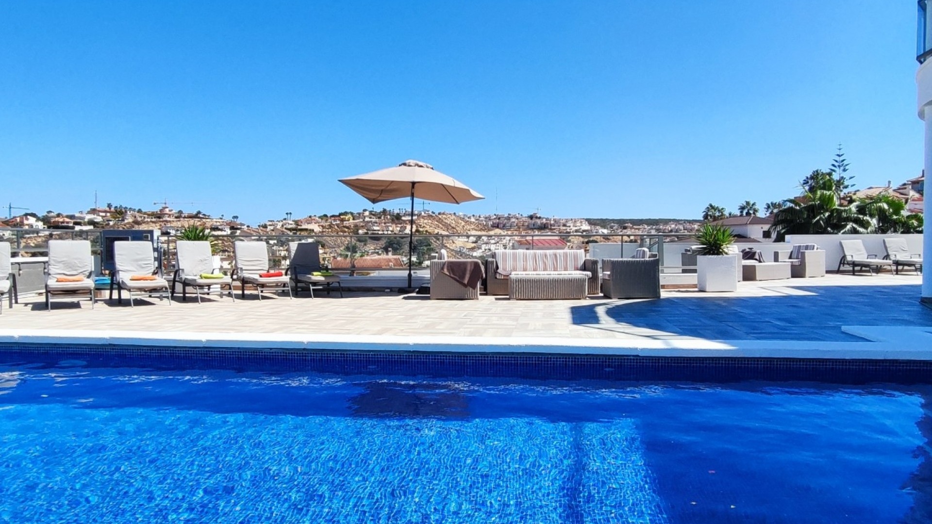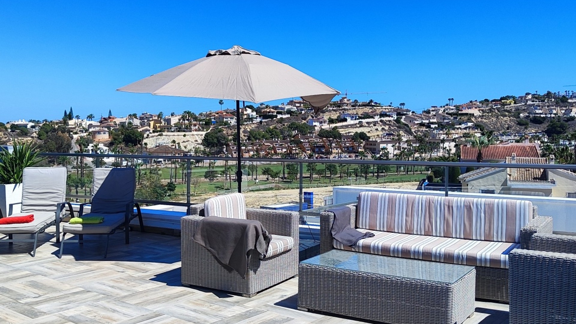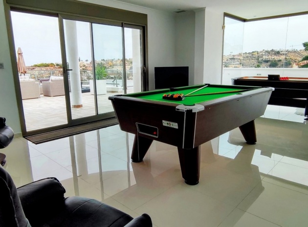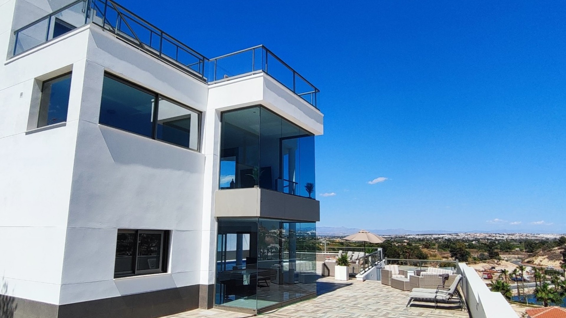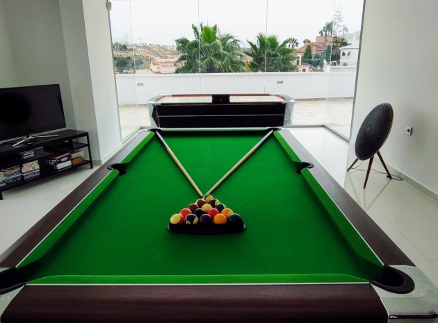 Vi är glada över att presentera denna skräddarsydda lyxiga 4/5-bäddsvilla med 3,5 badrum på marknaden i Ciudad Quesada med utsikt över golfbanan La Marquesa. Huset köptes ursprungligen som ett oavslutat projekt för 10 år sedan och stod färdigt av de nuvarande ägarna 2015 och har nyligen målats om både invändigt och utvändigt och poolen har kaklats om så den är i utmärkt skick. Det ligger stolt på en förhöjd 1203m2 tomt på Rojales/Quesada-gränsen med utsikt över landsbygden, golfbanan och det omgivande bostadsområdet. Fastigheten ligger i slutet av en privat tillfartsväg med motoriserade grindar som vetter mot en helkaklad tomt. Omedelbart till vänster finns en parkeringsplats på baksidan av villan som kan ta 3 bilar, i framtiden kan detta område täckas, det finns även gott om plats vid sidan av fastigheten för fler parkeringar vid behov. När du går runt till framsidan av villan blir du bara blåst av den fantastiska utsikten och öppenheten på tomten, till höger finns 2 nedre terrasser där du kan koppla av och koppla av eller installera en badtunna. Det stora poolområdet har ett överflöd av utrymme runt den 12 x 6 uppvärmda poolen och glasräcken på omkretsväggarna gör att utsikten aldrig hindras. Det finns en stor täckt veranda vid huvudentrén till huset där bekväma soffor och stolar placeras i skuggan för att njuta av det spanska vädret. Det finns också tillgång till bottenvåningens kök som också används som tvättstuga och det finns en WC för användning när du är vid poolen. Den invändiga planlösningen av fastigheten har lagts upp så att bottenvåningen handlar om att underhålla! De nuvarande ägarna använder loungen på nedervåningen som ett spelrum med ett biljardbord och ett airhockeybord samt TV och sittgrupp. På denna våning finns det också 2 sovrum ett är en stor dubbelsäng och det andra är ett familjerum med en dubbelsäng och 2 enkelsängar plus i detta rum finns det en ytterdörr. Bottenvåningen betjänas av ett duschrum med duschkabin, underdel och WC. Den första våningen i fastigheten rymmer det stora vardagsrummet omgivet av fönster inklusive en vägg av ramlöst glas som är som en enorm bild och ger så mycket ljus , köket i öppen planlösning är fullt utrustat med Neff-apparater inklusive en kaffebryggare, mikrovågsugn och dubbelugn plus en stor granit-ö med taklampor hängande över diskbänken med den bästa utsikten! Från vardagsrummet öppnar altandörrar upp mot en cirkulär täckt terrass som används som en matplats och plats att sitta och koppla av. På denna nivå har villan ytterligare ett badrum med duschkabin och ett stort dubbelrum med inbyggda garderober och altandörr som leder till sidoterrassen med sittgrupp och solplats med utsikt över poolen. Till översta våningen i denna magnifika villa har vi ett master bedroom med inbyggda garderober, huvudsängen sitter i mitten av rummet med en halvvägg som separerar omklädningsområdet, det finns ett eget duschrum med duschkabin och uteplatsfönster som kan öppnas på den massiva sidoterrassen. Utsidan av denna fastighet fortsätter bara att ge med ytterligare en trappa som leder till taket och även om detta är bruksområdet som rymmer luftkonditioneringskompressorerna och solpanelerna för varmvatten, är det också toppen av huset och en fantastisk plats att sitta och stjärnblicka eller titta på eldverk från de omgivande byarna på fiestakvällar. Detta är ett speciellt hus och ses bäst efter överenskommelse antingen personligen eller som en virtuell visning. De nuvarande ägarna har använt villan både som familjesemesterhus och för privat uthyrning vilket har gett god vinst. fråga oss för mer information.