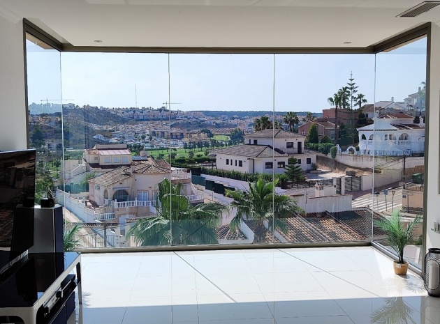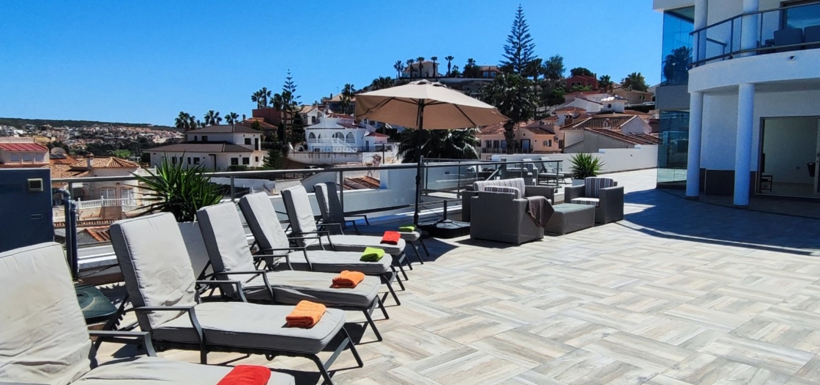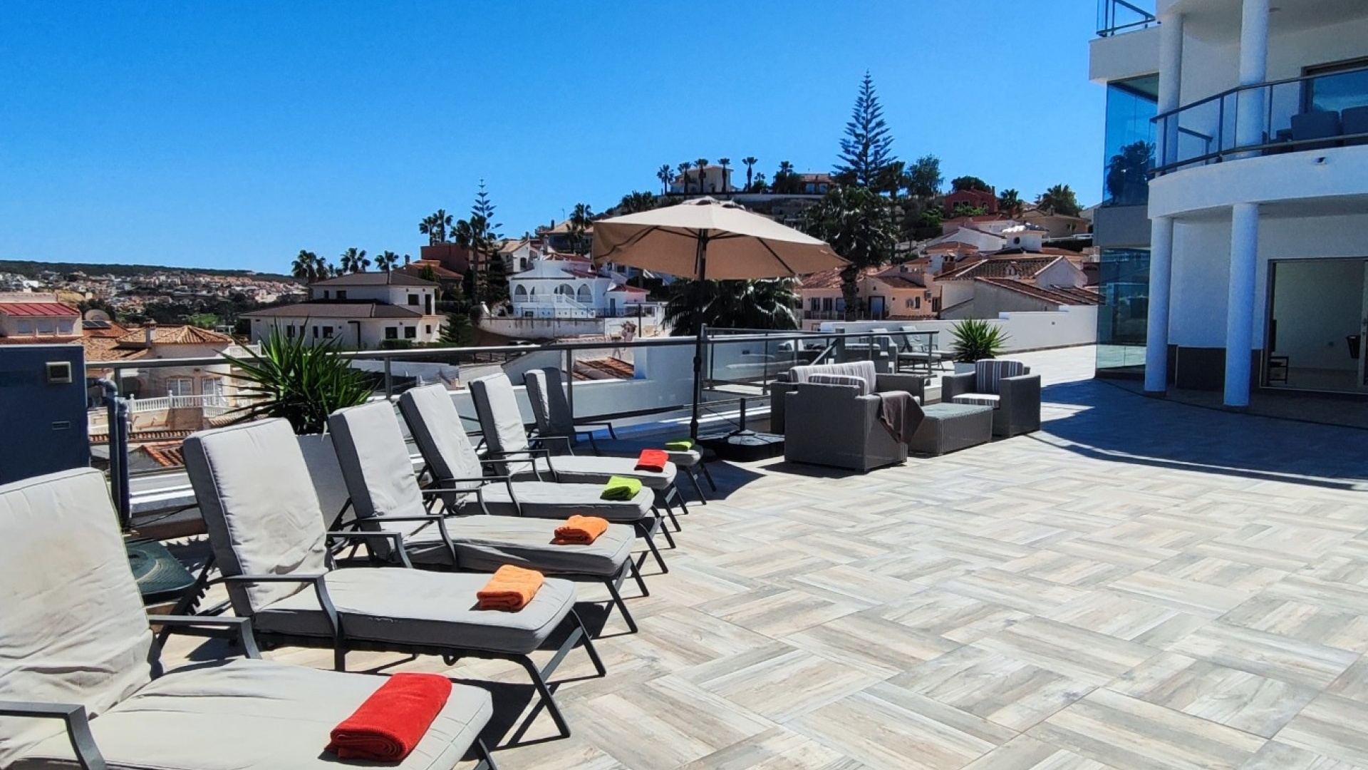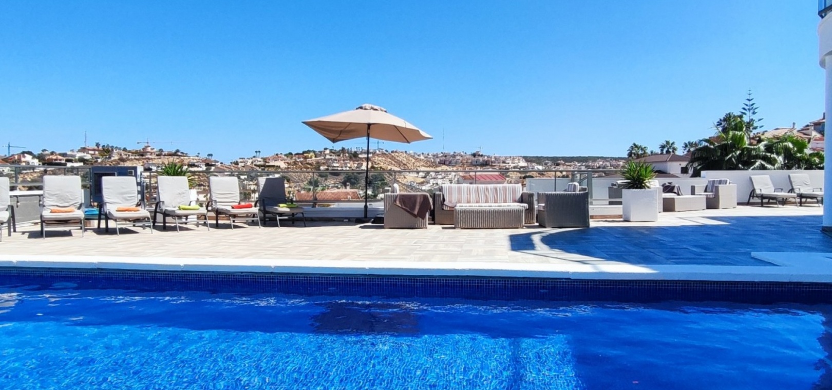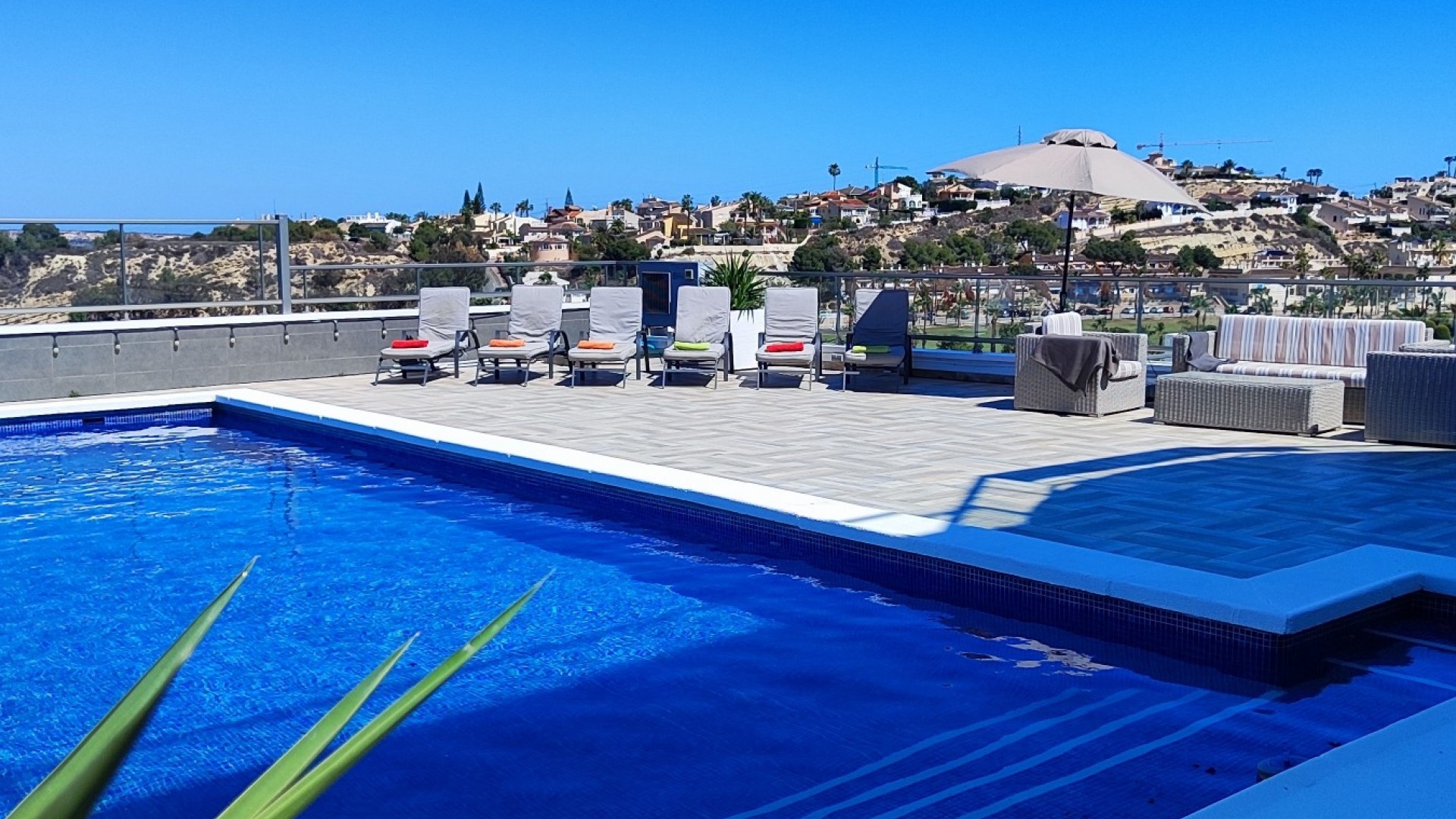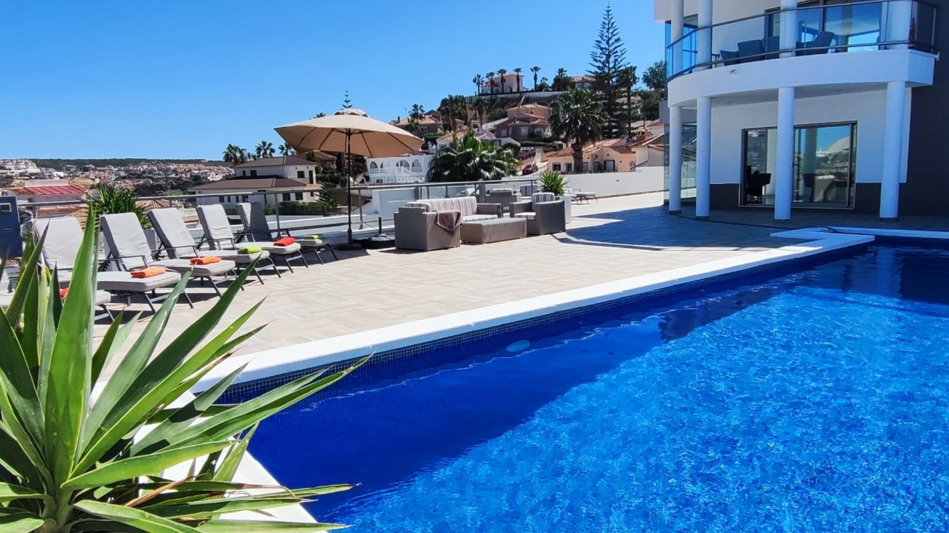 Vi är glada över att presentera denna skräddarsydda lyxiga 4/5-bäddsvilla med 3,5 badrum på marknaden i Ciudad Quesada med utsikt över golfbanan La Marquesa. Huset köptes ursprungligen som ett oavslutat projekt för 10 år sedan och stod färdigt av de nuvarande ägarna 2015 och har nyligen målats om både invändigt och utvändigt och poolen har kaklats om så den är i utmärkt skick. Det ligger stolt på en förhöjd 1203m2 tomt på Rojales/Quesada-gränsen med utsikt över landsbygden, golfbanan och det omgivande bostadsområdet. Fastigheten ligger i slutet av en privat tillfartsväg med motoriserade grindar som vetter mot en helkaklad tomt. Omedelbart till vänster finns en parkeringsplats på baksidan av villan som kan ta 3 bilar, i framtiden kan detta område täckas, det finns även gott om plats vid sidan av fastigheten för fler parkeringar vid behov. När du går runt till framsidan av villan blir du bara blåst av den fantastiska utsikten och öppenheten på tomten, till höger finns 2 nedre terrasser där du kan koppla av och koppla av eller installera en badtunna. Det stora poolområdet har ett överflöd av utrymme runt den 12 x 6 uppvärmda poolen och glasräcken på omkretsväggarna gör att utsikten aldrig hindras. Det finns en stor täckt veranda vid huvudentrén till huset där bekväma soffor och stolar placeras i skuggan för att njuta av det spanska vädret. Det finns också tillgång till bottenvåningens kök som också används som tvättstuga och det finns en WC för användning när du är vid poolen. Den invändiga planlösningen av fastigheten har lagts upp så att bottenvåningen handlar om att underhålla! De nuvarande ägarna använder loungen på nedervåningen som ett spelrum med ett biljardbord och ett airhockeybord samt TV och sittgrupp. På denna våning finns det också 2 sovrum ett är en stor dubbelsäng och det andra är ett familjerum med en dubbelsäng och 2 enkelsängar plus i detta rum finns det en ytterdörr. Bottenvåningen betjänas av ett duschrum med duschkabin, underdel och WC. Den första våningen i fastigheten rymmer det stora vardagsrummet omgivet av fönster inklusive en vägg av ramlöst glas som är som en enorm bild och ger så mycket ljus , köket i öppen planlösning är fullt utrustat med Neff-apparater inklusive en kaffebryggare, mikrovågsugn och dubbelugn plus en stor granit-ö med taklampor hängande över diskbänken med den bästa utsikten! Från vardagsrummet öppnar altandörrar upp mot en cirkulär täckt terrass som används som en matplats och plats att sitta och koppla av. På denna nivå har villan ytterligare ett badrum med duschkabin och ett stort dubbelrum med inbyggda garderober och altandörr som leder till sidoterrassen med sittgrupp och solplats med utsikt över poolen. Till översta våningen i denna magnifika villa har vi ett master bedroom med inbyggda garderober, huvudsängen sitter i mitten av rummet med en halvvägg som separerar omklädningsområdet, det finns ett eget duschrum med duschkabin och uteplatsfönster som kan öppnas på den massiva sidoterrassen. Utsidan av denna fastighet fortsätter bara att ge med ytterligare en trappa som leder till taket och även om detta är bruksområdet som rymmer luftkonditioneringskompressorerna och solpanelerna för varmvatten, är det också toppen av huset och en fantastisk plats att sitta och stjärnblicka eller titta på eldverk från de omgivande byarna på fiestakvällar. Detta är ett speciellt hus och ses bäst efter överenskommelse antingen personligen eller som en virtuell visning. De nuvarande ägarna har använt villan både som familjesemesterhus och för privat uthyrning vilket har gett god vinst. fråga oss för mer information.