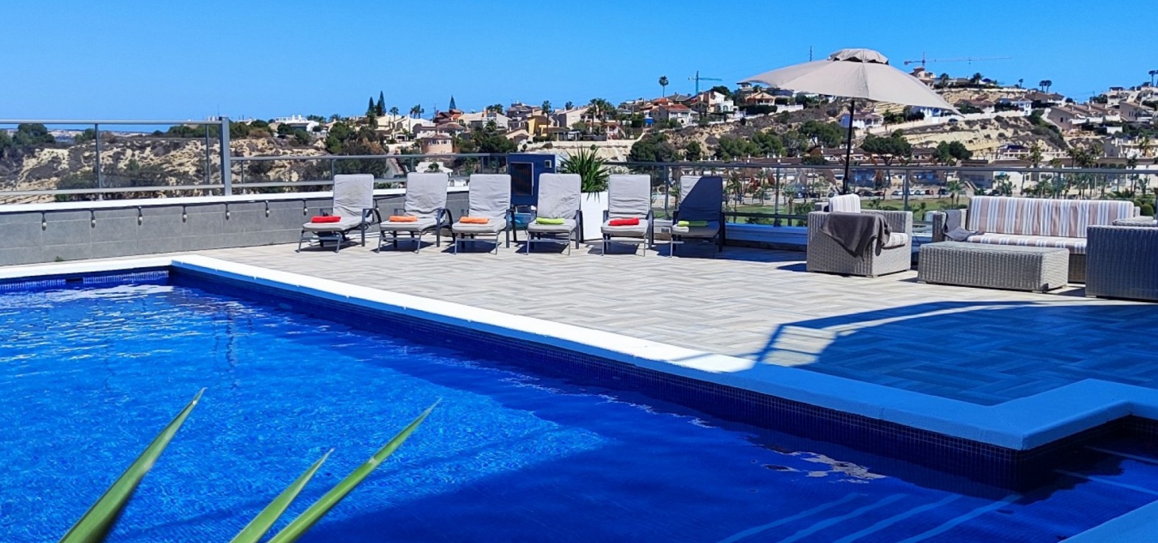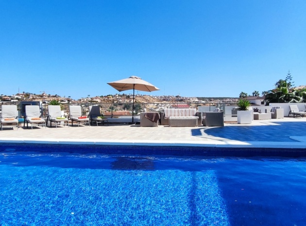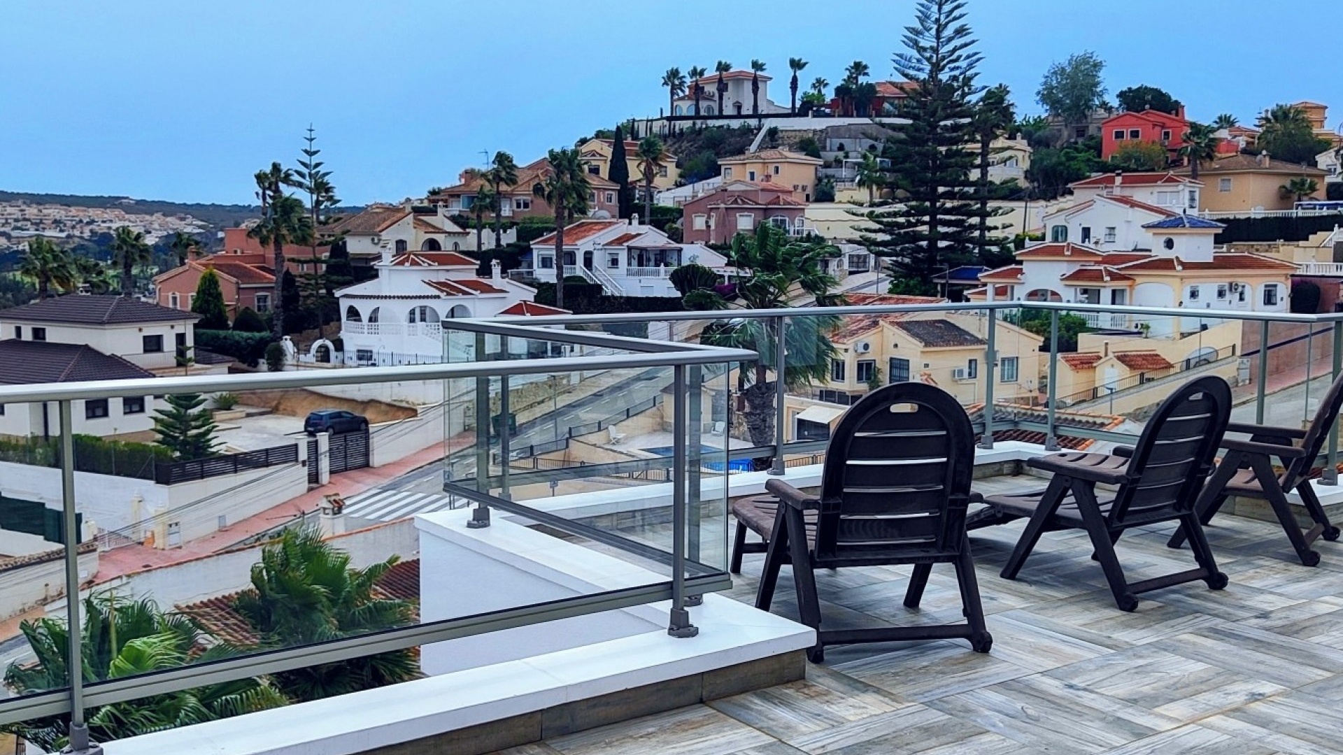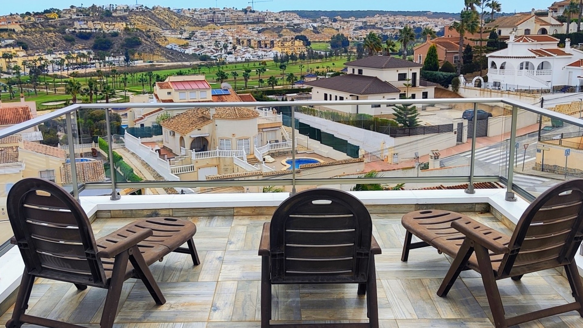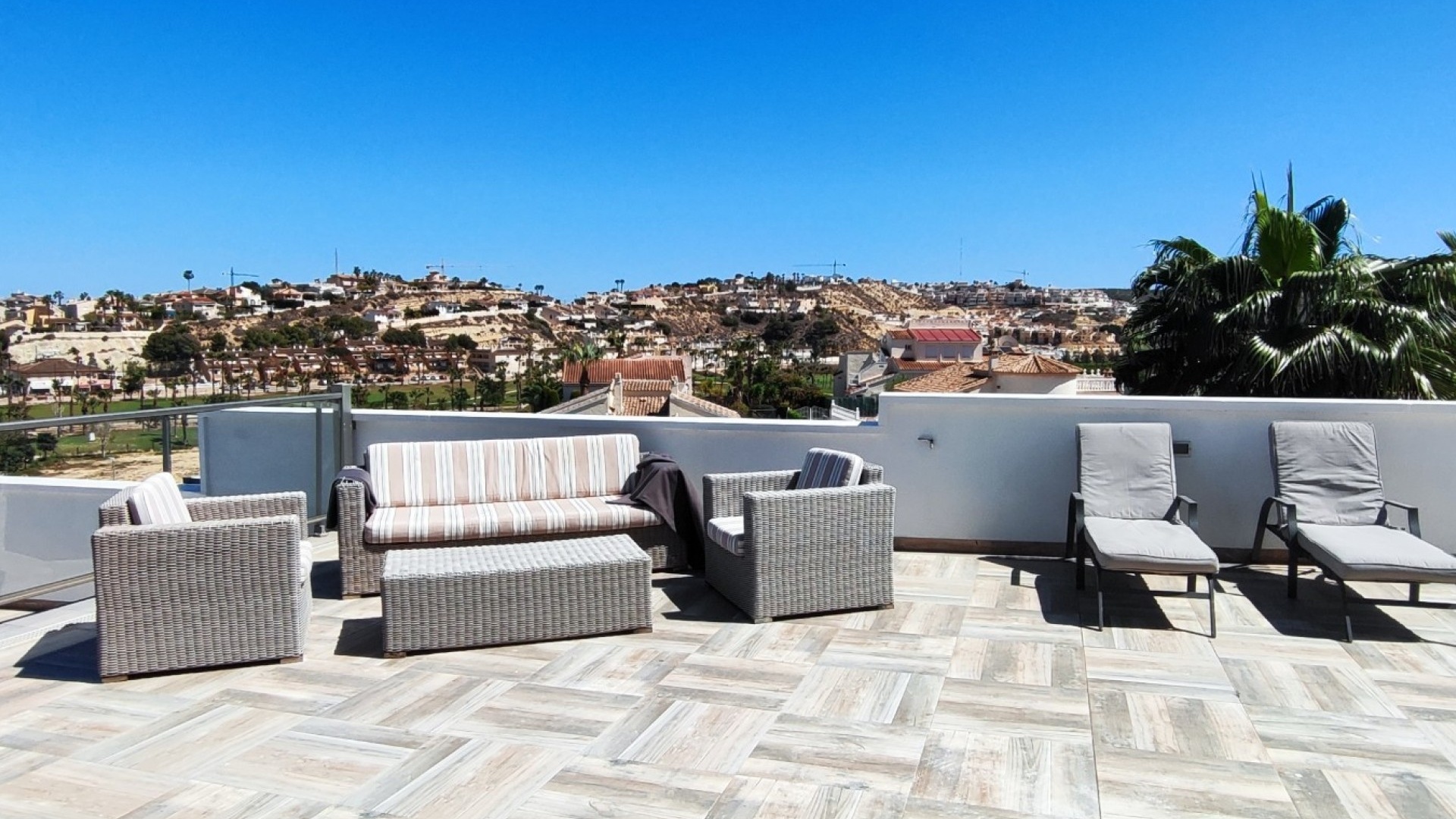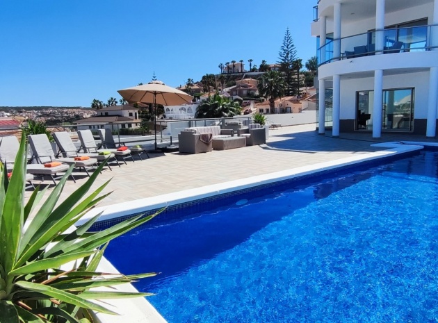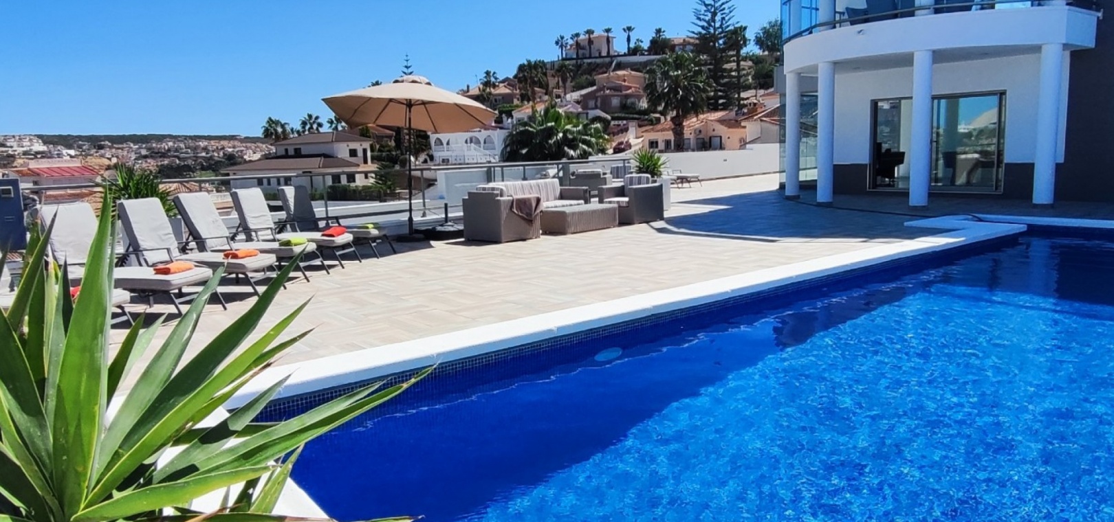 Vi är glada över att presentera denna skräddarsydda lyxiga 4/5-bäddsvilla med 3,5 badrum på marknaden i Ciudad Quesada med utsikt över golfbanan La Marquesa. Huset köptes ursprungligen som ett oavslutat projekt för 10 år sedan och stod färdigt av de nuvarande ägarna 2015 och har nyligen målats om både invändigt och utvändigt och poolen har kaklats om så den är i utmärkt skick. Det ligger stolt på en förhöjd 1203m2 tomt på Rojales/Quesada-gränsen med utsikt över landsbygden, golfbanan och det omgivande bostadsområdet. Fastigheten ligger i slutet av en privat tillfartsväg med motoriserade grindar som vetter mot en helkaklad tomt. Omedelbart till vänster finns en parkeringsplats på baksidan av villan som kan ta 3 bilar, i framtiden kan detta område täckas, det finns även gott om plats vid sidan av fastigheten för fler parkeringar vid behov. När du går runt till framsidan av villan blir du bara blåst av den fantastiska utsikten och öppenheten på tomten, till höger finns 2 nedre terrasser där du kan koppla av och koppla av eller installera en badtunna. Det stora poolområdet har ett överflöd av utrymme runt den 12 x 6 uppvärmda poolen och glasräcken på omkretsväggarna gör att utsikten aldrig hindras. Det finns en stor täckt veranda vid huvudentrén till huset där bekväma soffor och stolar placeras i skuggan för att njuta av det spanska vädret. Det finns också tillgång till bottenvåningens kök som också används som tvättstuga och det finns en WC för användning när du är vid poolen. Den invändiga planlösningen av fastigheten har lagts upp så att bottenvåningen handlar om att underhålla! De nuvarande ägarna använder loungen på nedervåningen som ett spelrum med ett biljardbord och ett airhockeybord samt TV och sittgrupp. På denna våning finns det också 2 sovrum ett är en stor dubbelsäng och det andra är ett familjerum med en dubbelsäng och 2 enkelsängar plus i detta rum finns det en ytterdörr. Bottenvåningen betjänas av ett duschrum med duschkabin, underdel och WC. Den första våningen i fastigheten rymmer det stora vardagsrummet omgivet av fönster inklusive en vägg av ramlöst glas som är som en enorm bild och ger så mycket ljus , köket i öppen planlösning är fullt utrustat med Neff-apparater inklusive en kaffebryggare, mikrovågsugn och dubbelugn plus en stor granit-ö med taklampor hängande över diskbänken med den bästa utsikten! Från vardagsrummet öppnar altandörrar upp mot en cirkulär täckt terrass som används som en matplats och plats att sitta och koppla av. På denna nivå har villan ytterligare ett badrum med duschkabin och ett stort dubbelrum med inbyggda garderober och altandörr som leder till sidoterrassen med sittgrupp och solplats med utsikt över poolen. Till översta våningen i denna magnifika villa har vi ett master bedroom med inbyggda garderober, huvudsängen sitter i mitten av rummet med en halvvägg som separerar omklädningsområdet, det finns ett eget duschrum med duschkabin och uteplatsfönster som kan öppnas på den massiva sidoterrassen. Utsidan av denna fastighet fortsätter bara att ge med ytterligare en trappa som leder till taket och även om detta är bruksområdet som rymmer luftkonditioneringskompressorerna och solpanelerna för varmvatten, är det också toppen av huset och en fantastisk plats att sitta och stjärnblicka eller titta på eldverk från de omgivande byarna på fiestakvällar. Detta är ett speciellt hus och ses bäst efter överenskommelse antingen personligen eller som en virtuell visning. De nuvarande ägarna har använt villan både som familjesemesterhus och för privat uthyrning vilket har gett god vinst. fråga oss för mer information.