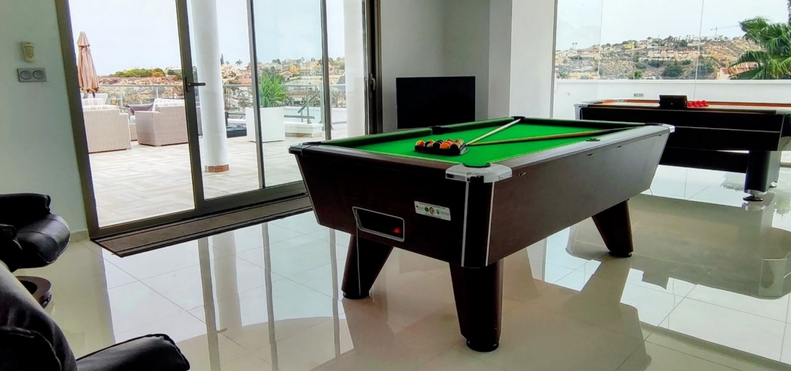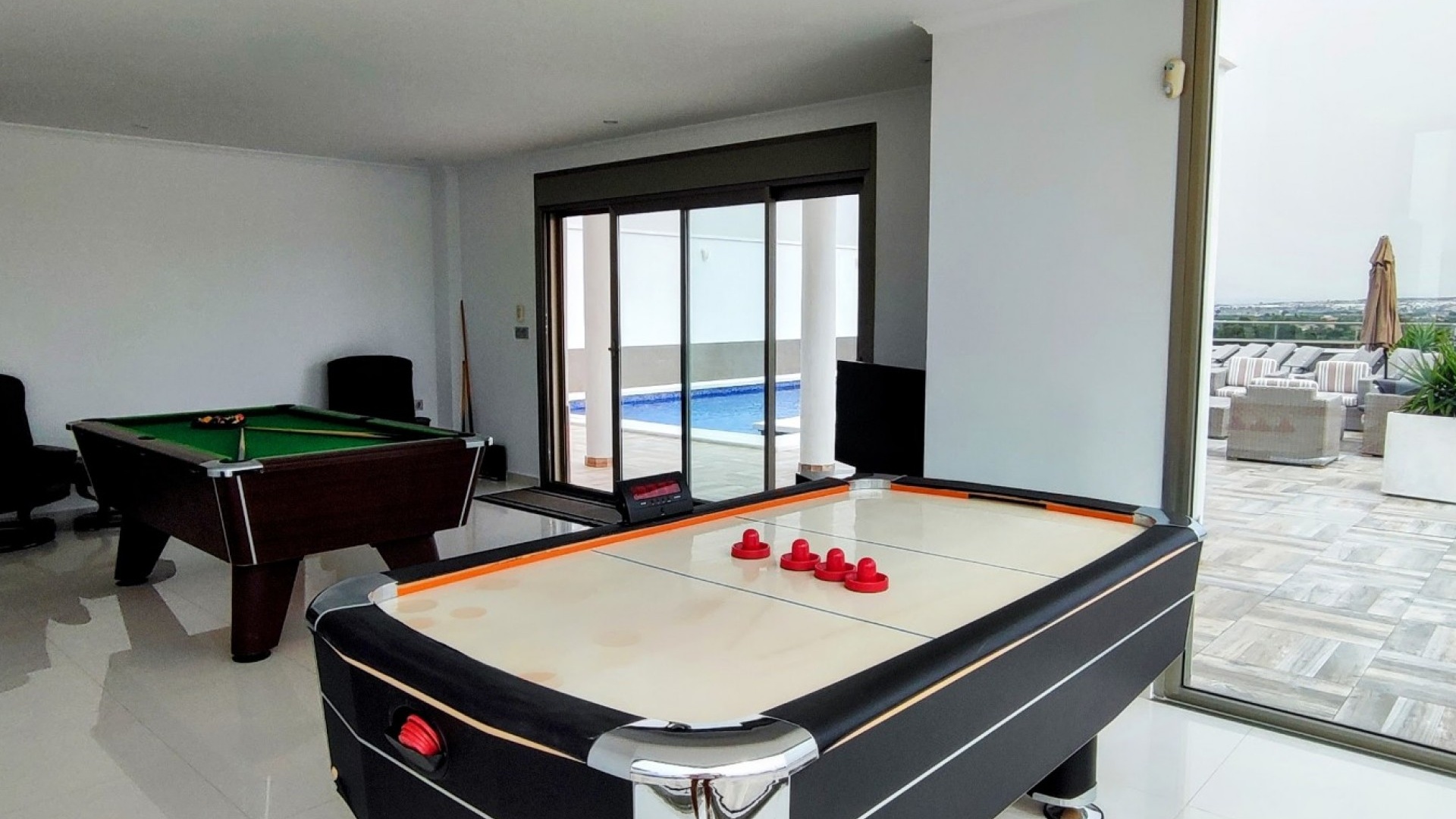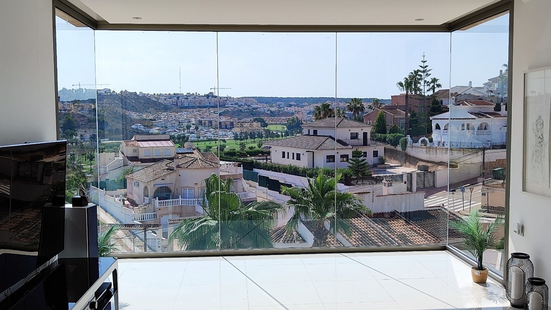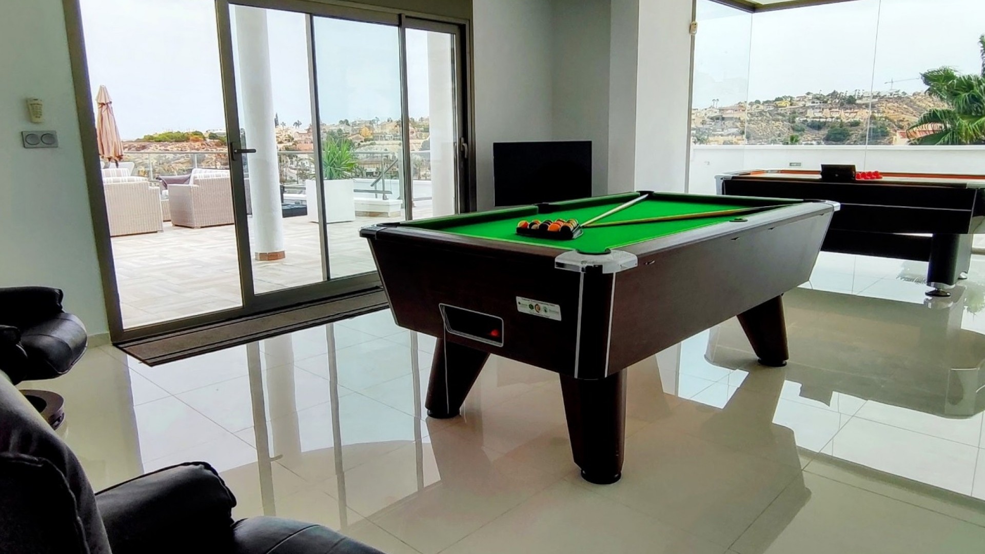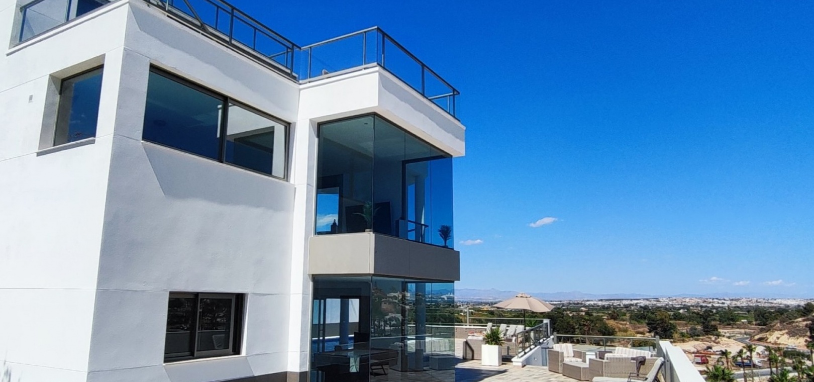 Vi är glada över att presentera denna skräddarsydda lyxiga 4/5-bäddsvilla med 3,5 badrum på marknaden i Ciudad Quesada med utsikt över golfbanan La Marquesa. Huset köptes ursprungligen som ett oavslutat projekt för 10 år sedan och stod färdigt av de nuvarande ägarna 2015 och har nyligen målats om både invändigt och utvändigt och poolen har kaklats om så den är i utmärkt skick. Det ligger stolt på en förhöjd 1203m2 tomt på Rojales/Quesada-gränsen med utsikt över landsbygden, golfbanan och det omgivande bostadsområdet. Fastigheten ligger i slutet av en privat tillfartsväg med motoriserade grindar som vetter mot en helkaklad tomt. Omedelbart till vänster finns en parkeringsplats på baksidan av villan som kan ta 3 bilar, i framtiden kan detta område täckas, det finns även gott om plats vid sidan av fastigheten för fler parkeringar vid behov. När du går runt till framsidan av villan blir du bara blåst av den fantastiska utsikten och öppenheten på tomten, till höger finns 2 nedre terrasser där du kan koppla av och koppla av eller installera en badtunna. Det stora poolområdet har ett överflöd av utrymme runt den 12 x 6 uppvärmda poolen och glasräcken på omkretsväggarna gör att utsikten aldrig hindras. Det finns en stor täckt veranda vid huvudentrén till huset där bekväma soffor och stolar placeras i skuggan för att njuta av det spanska vädret. Det finns också tillgång till bottenvåningens kök som också används som tvättstuga och det finns en WC för användning när du är vid poolen. Den invändiga planlösningen av fastigheten har lagts upp så att bottenvåningen handlar om att underhålla! De nuvarande ägarna använder loungen på nedervåningen som ett spelrum med ett biljardbord och ett airhockeybord samt TV och sittgrupp. På denna våning finns det också 2 sovrum ett är en stor dubbelsäng och det andra är ett familjerum med en dubbelsäng och 2 enkelsängar plus i detta rum finns det en ytterdörr. Bottenvåningen betjänas av ett duschrum med duschkabin, underdel och WC. Den första våningen i fastigheten rymmer det stora vardagsrummet omgivet av fönster inklusive en vägg av ramlöst glas som är som en enorm bild och ger så mycket ljus , köket i öppen planlösning är fullt utrustat med Neff-apparater inklusive en kaffebryggare, mikrovågsugn och dubbelugn plus en stor granit-ö med taklampor hängande över diskbänken med den bästa utsikten! Från vardagsrummet öppnar altandörrar upp mot en cirkulär täckt terrass som används som en matplats och plats att sitta och koppla av. På denna nivå har villan ytterligare ett badrum med duschkabin och ett stort dubbelrum med inbyggda garderober och altandörr som leder till sidoterrassen med sittgrupp och solplats med utsikt över poolen. Till översta våningen i denna magnifika villa har vi ett master bedroom med inbyggda garderober, huvudsängen sitter i mitten av rummet med en halvvägg som separerar omklädningsområdet, det finns ett eget duschrum med duschkabin och uteplatsfönster som kan öppnas på den massiva sidoterrassen. Utsidan av denna fastighet fortsätter bara att ge med ytterligare en trappa som leder till taket och även om detta är bruksområdet som rymmer luftkonditioneringskompressorerna och solpanelerna för varmvatten, är det också toppen av huset och en fantastisk plats att sitta och stjärnblicka eller titta på eldverk från de omgivande byarna på fiestakvällar. Detta är ett speciellt hus och ses bäst efter överenskommelse antingen personligen eller som en virtuell visning. De nuvarande ägarna har använt villan både som familjesemesterhus och för privat uthyrning vilket har gett god vinst. fråga oss för mer information.