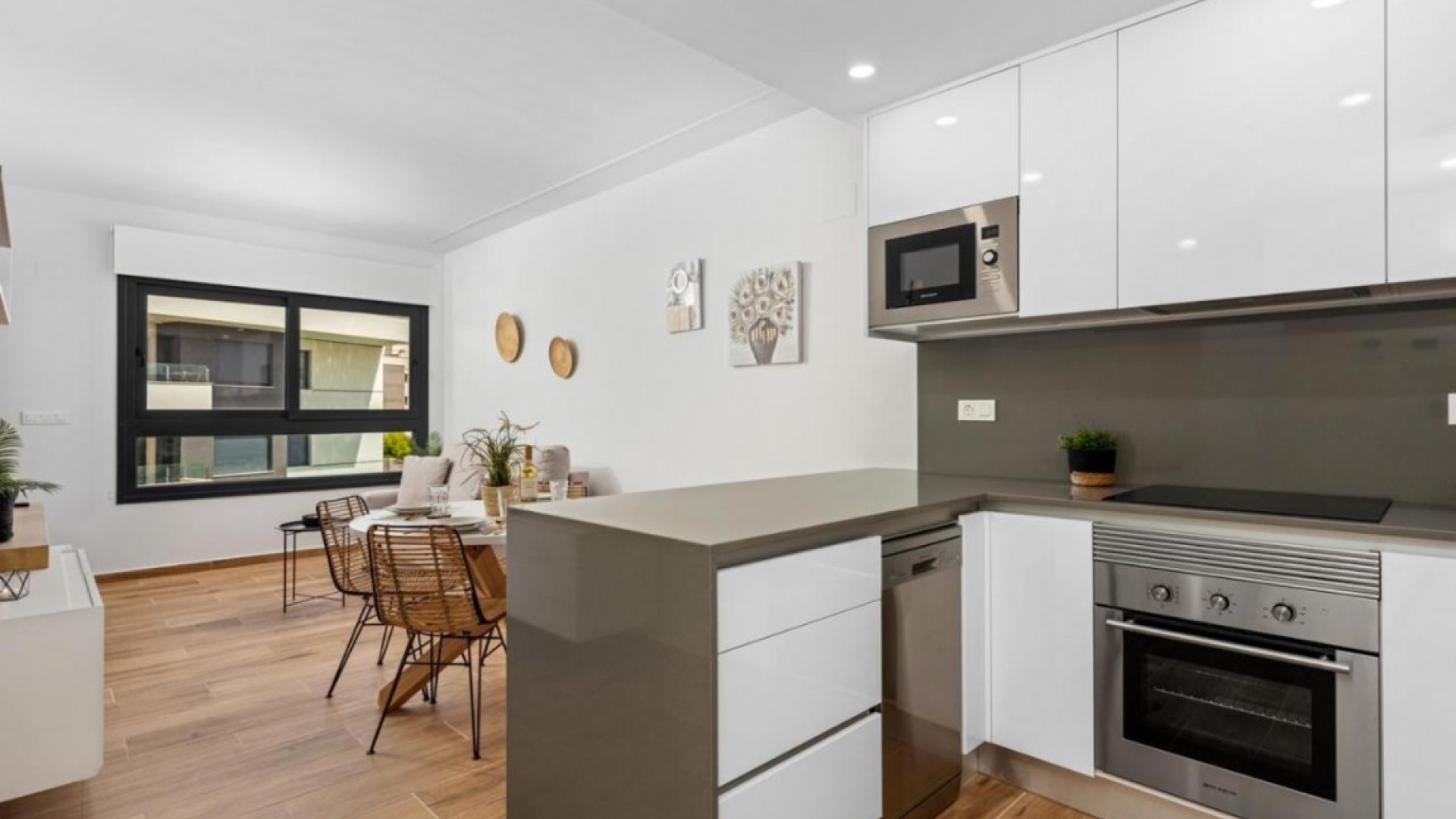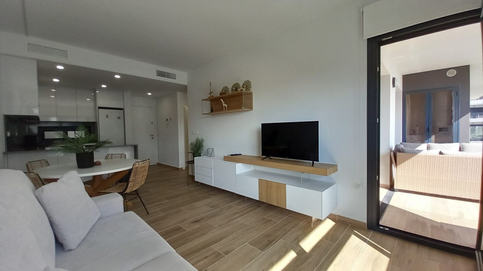 Ljust och luftigt vardagsrum/matsal med dörrar till balkongen, fullt utrustat kök i öppen planlösning, 1 x huvudsovrum med inbyggda garderober och ett eget duschrum, 1 x tvåbäddsrum, 1 x familjeduschrum, balkong, gemensam pool, gemensam parkering, hiss, tennisbana, en lekplats och mycket mycket mer.