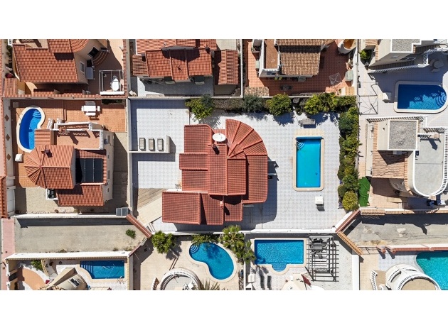 Modern villa i ett plan byggd på en enorm tomt på 5.000 m2, har 3 sovrum, 2 badrum, gästtoalett, kök med öppen planlösning med rymligt vardagsrum med matsal, stora fönster från golv till tak med mycket naturligt ljus, inbyggda garderober.