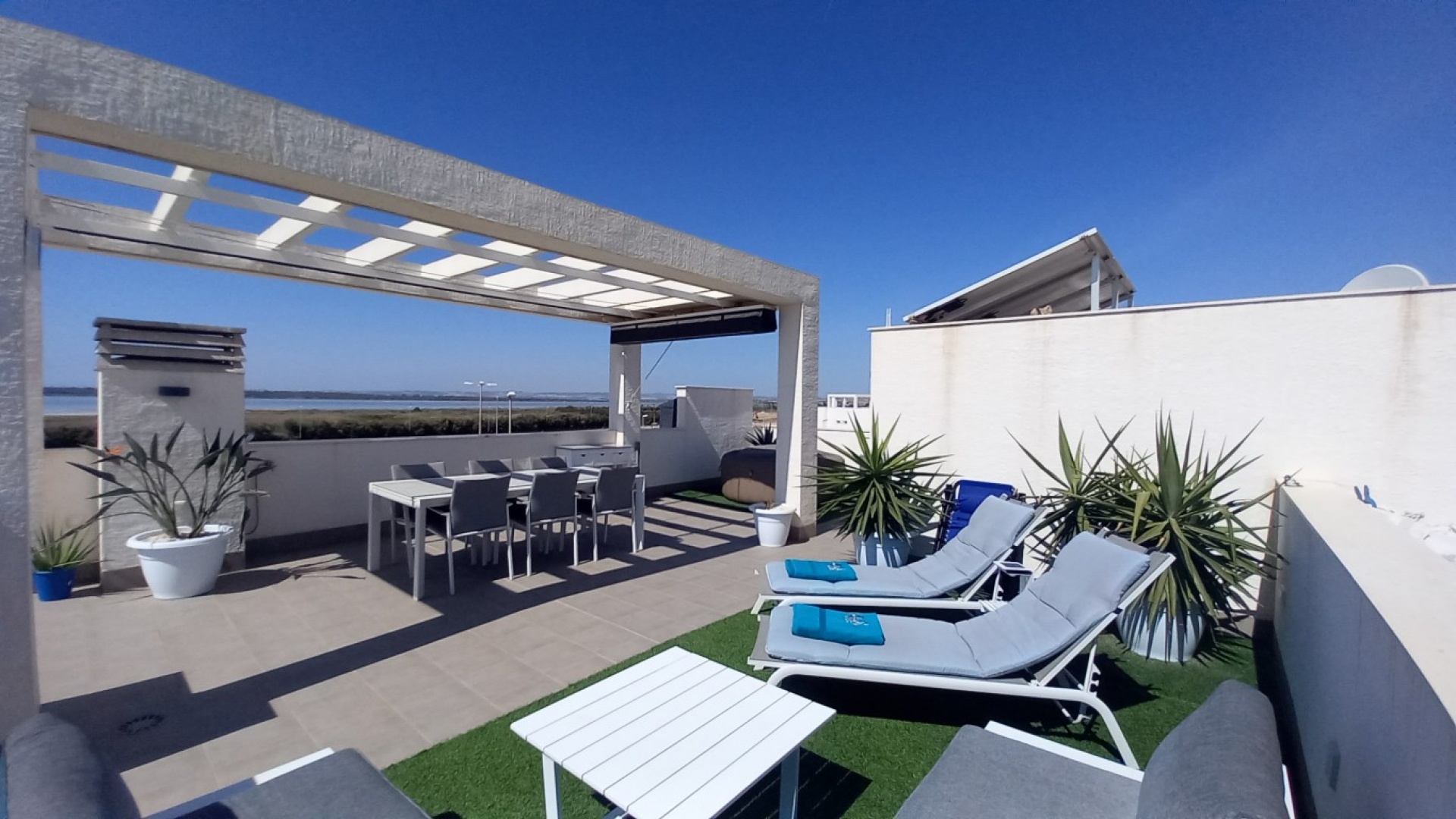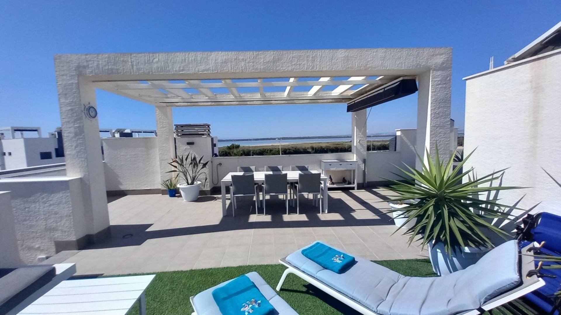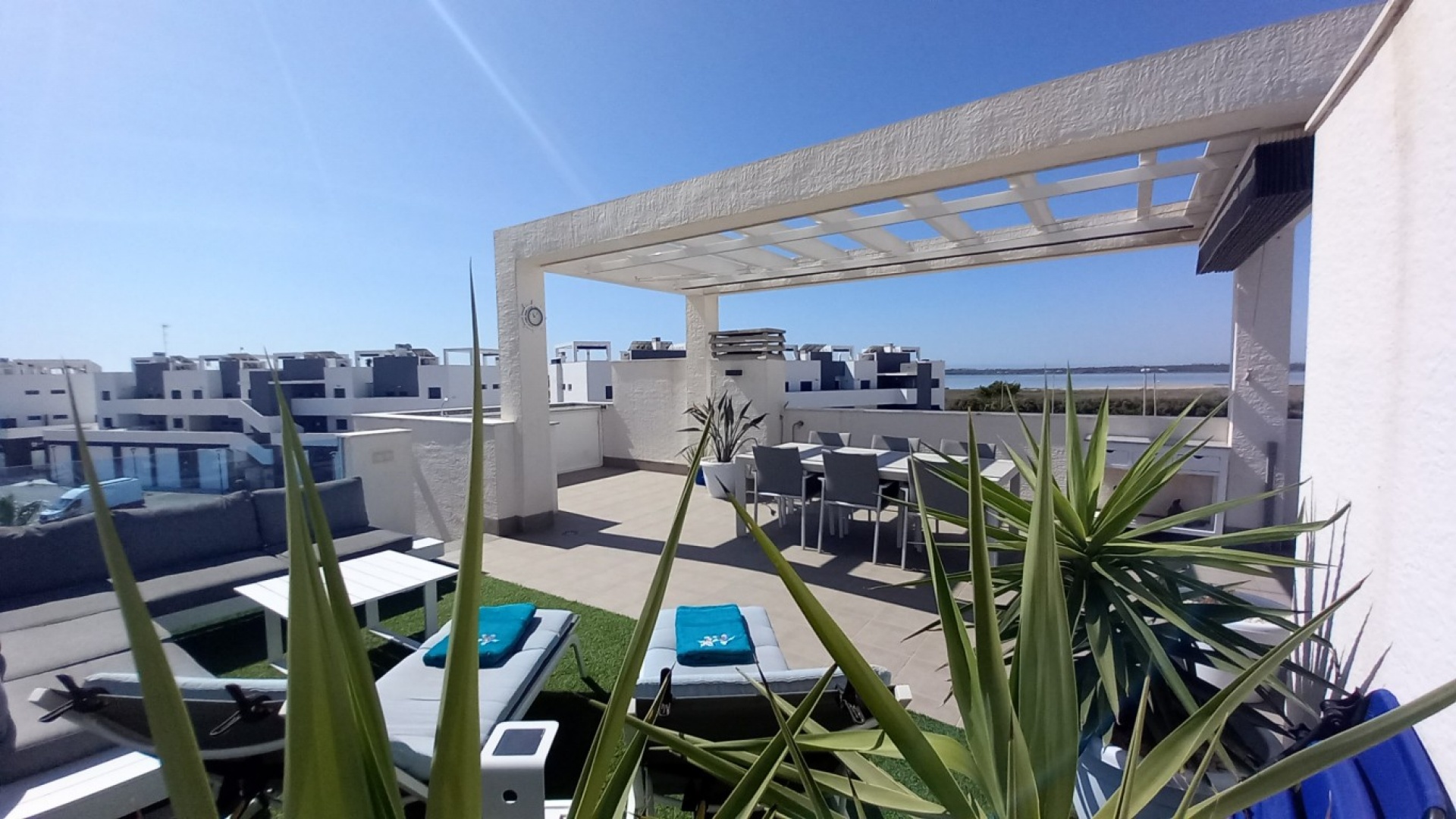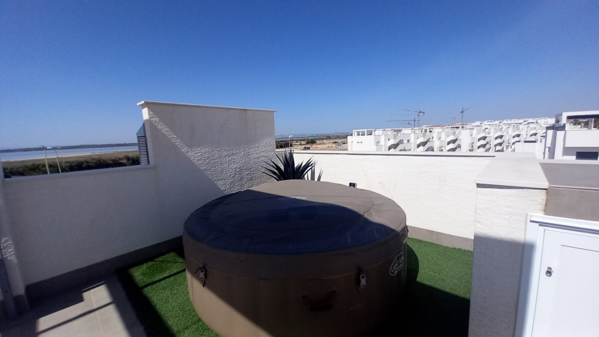 Denna vackra takvåning ligger i det moderna Oasis Beach XIII-komplexet nära den vackra spanska staden Guardamar del Segura och de naturliga sjöarna. Detta komplex byggdes 2020 och har en gemensam trädgård med en 25 x 10 m pool, ett spa med gym och bastu .Lägenheten har en privat parkeringsplats och ett förråd i det nedre garaget. Komplexet är inhägnat och lägenheten är utrustad med ett videoingångssystem och stålfönsterskydd. När du kommer in i lägenheten har du en hall som leder till ett mycket modernt, öppet och fullt utrustat kök med bardisk. Det rymliga och ljusa vardagsrummet/matsalen har luftkonditionering. De stora skjutdörrarna tar dig till den täckta terrassen med utsikt över poolen och trädgården. Du har två dubbelrum, båda med vacker utsikt, inbyggda garderober och oberoende luftkonditionering. Det stora sovrummet har utsikt över den gemensamma trädgården och har ett stort badrum med duschkabin. Ett andra badrum har en duschkabin. Lägenheten är inredd med mycket hög standard, är fullt möblerad och är i mycket gott (ny) skick. Från balkongen har du en trappa som leder till solariet på 68 m², med fantastisk utsikt över komplexets saltsjöar och grönområden. Solariet har ett utomhuskök och jacuzzi. Fastigheten ligger i El Raso-distriktet i närheten av affärer, barer och restauranger, 5 minuters bilresa från de vackra lokala stränderna och 30 minuter från Alicantes flygplats. En lägenhet som passar alla årstider i Spanien. Vi inbjuder dig att uppleva den underbara semesteratmosfären i denna vackra lägenhet. Kontakta oss för mer information eller för att boka ett besök.