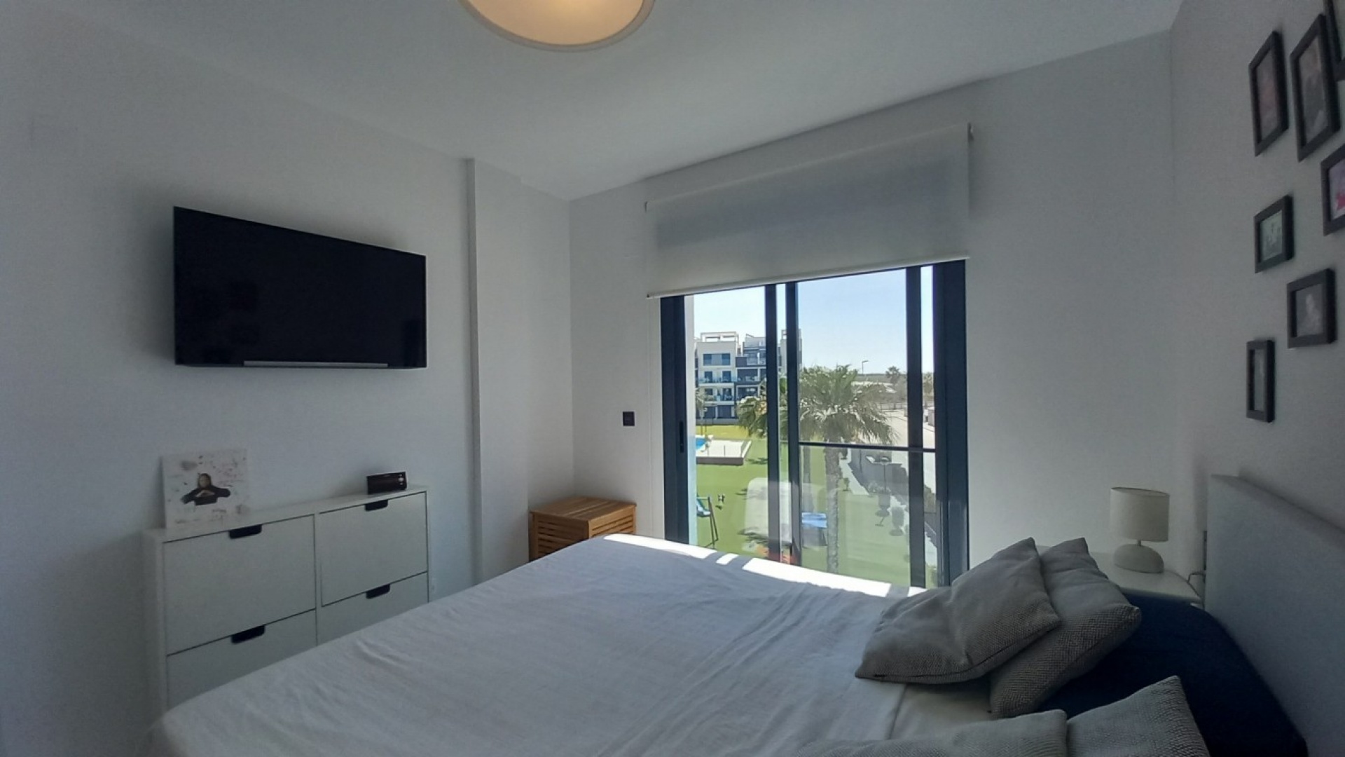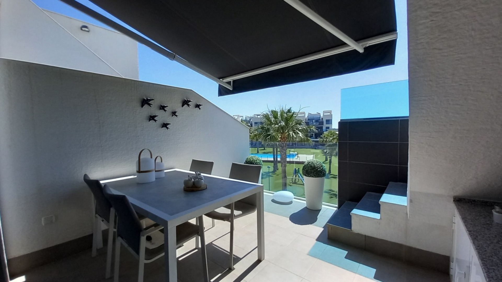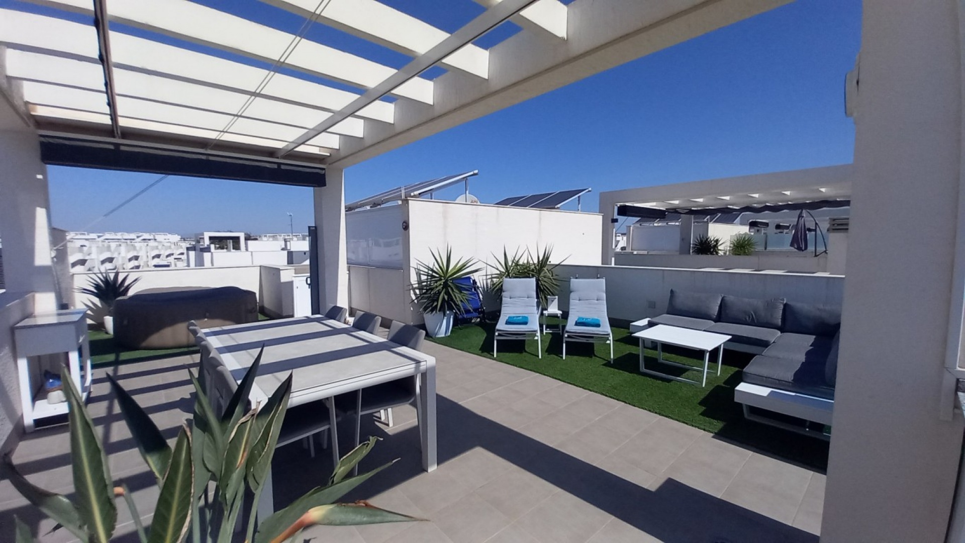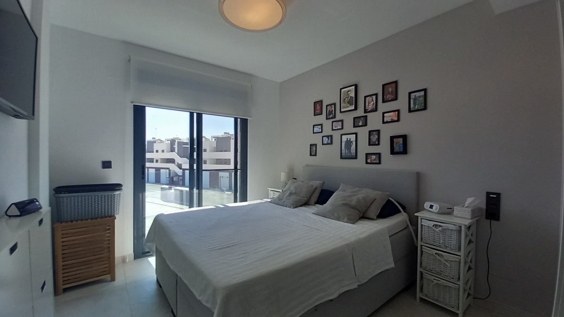 Denna vackra takvåning ligger i det moderna Oasis Beach XIII-komplexet nära den vackra spanska staden Guardamar del Segura och de naturliga sjöarna. Detta komplex byggdes 2020 och har en gemensam trädgård med en 25 x 10 m pool, ett spa med gym och bastu .Lägenheten har en privat parkeringsplats och ett förråd i det nedre garaget. Komplexet är inhägnat och lägenheten är utrustad med ett videoingångssystem och stålfönsterskydd. När du kommer in i lägenheten har du en hall som leder till ett mycket modernt, öppet och fullt utrustat kök med bardisk. Det rymliga och ljusa vardagsrummet/matsalen har luftkonditionering. De stora skjutdörrarna tar dig till den täckta terrassen med utsikt över poolen och trädgården. Du har två dubbelrum, båda med vacker utsikt, inbyggda garderober och oberoende luftkonditionering. Det stora sovrummet har utsikt över den gemensamma trädgården och har ett stort badrum med duschkabin. Ett andra badrum har en duschkabin. Lägenheten är inredd med mycket hög standard, är fullt möblerad och är i mycket gott (ny) skick. Från balkongen har du en trappa som leder till solariet på 68 m², med fantastisk utsikt över komplexets saltsjöar och grönområden. Solariet har ett utomhuskök och jacuzzi. Fastigheten ligger i El Raso-distriktet i närheten av affärer, barer och restauranger, 5 minuters bilresa från de vackra lokala stränderna och 30 minuter från Alicantes flygplats. En lägenhet som passar alla årstider i Spanien. Vi inbjuder dig att uppleva den underbara semesteratmosfären i denna vackra lägenhet. Kontakta oss för mer information eller för att boka ett besök.