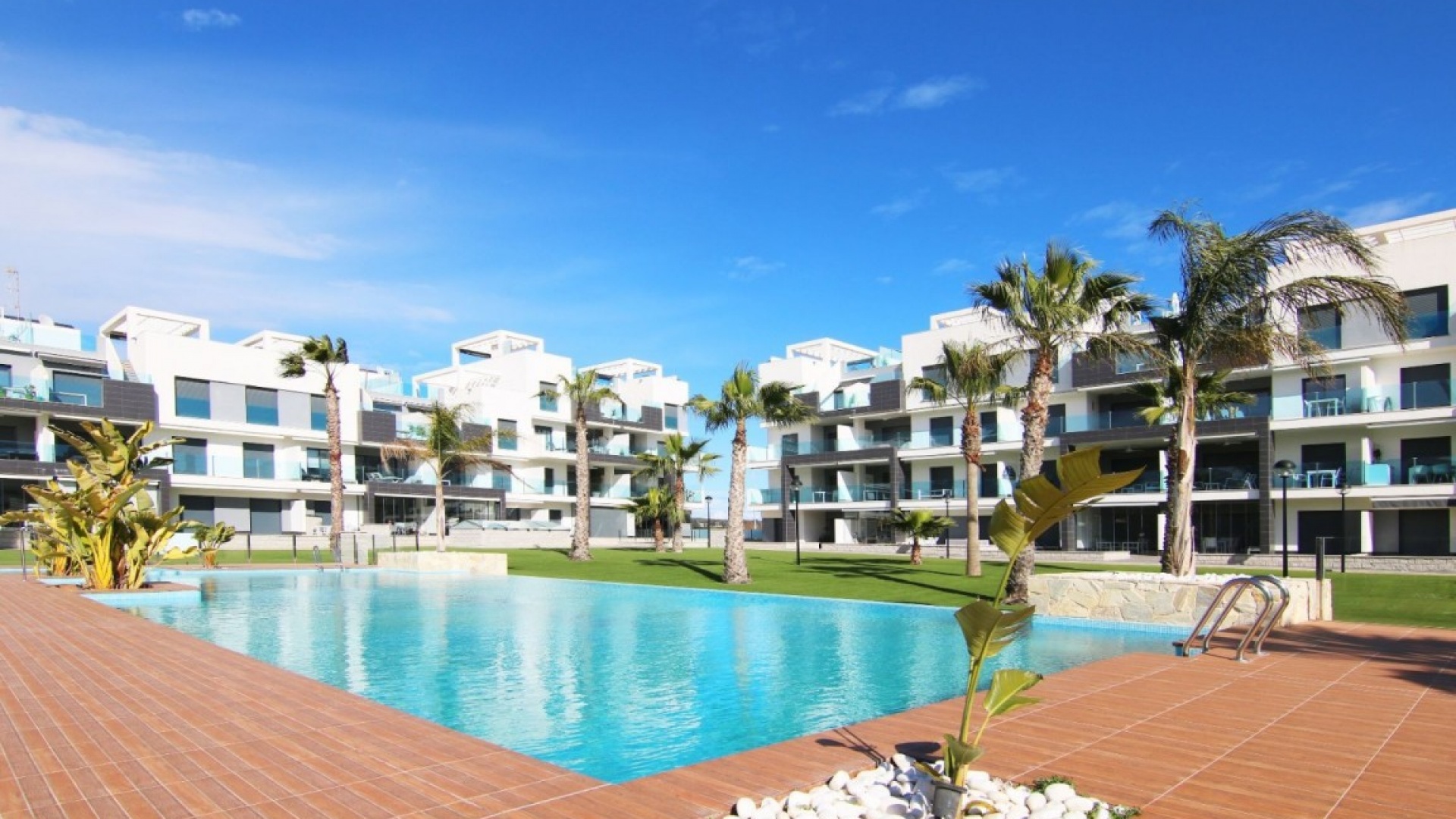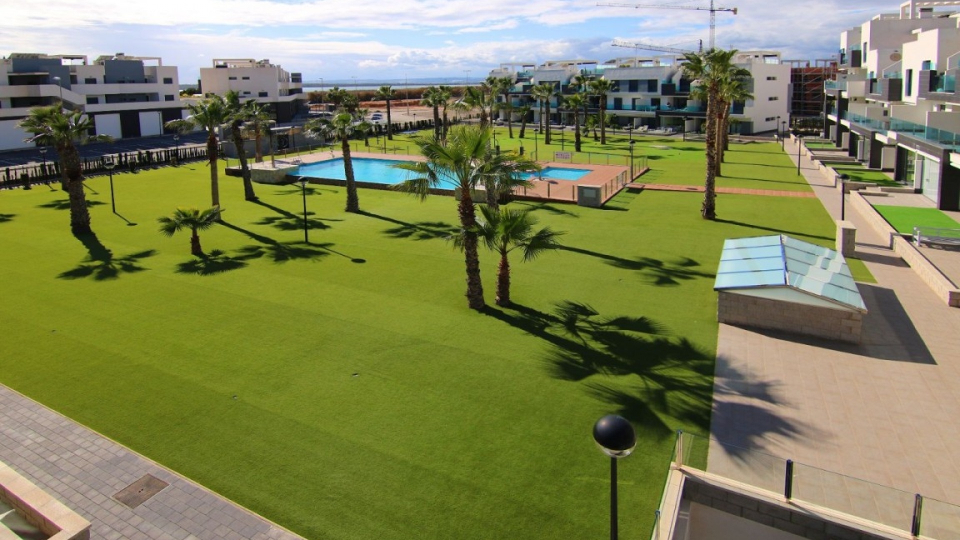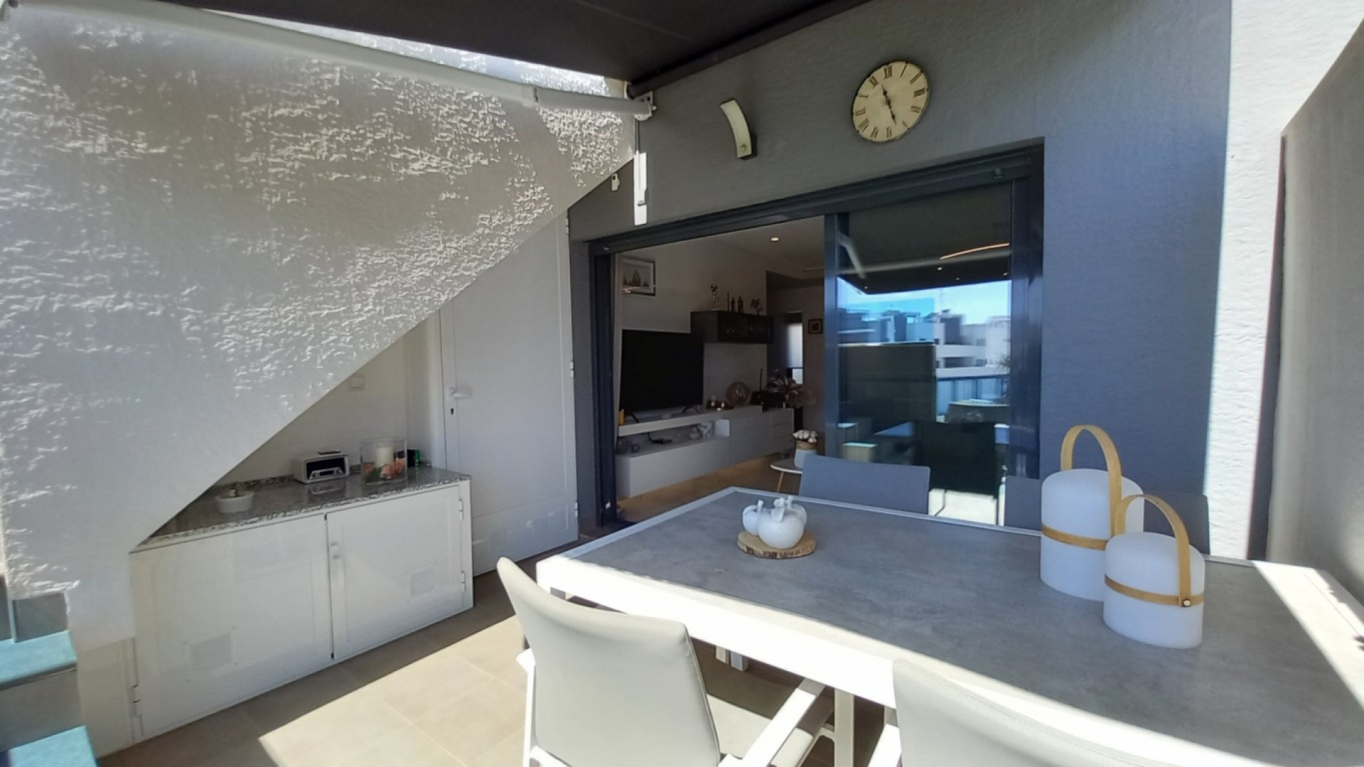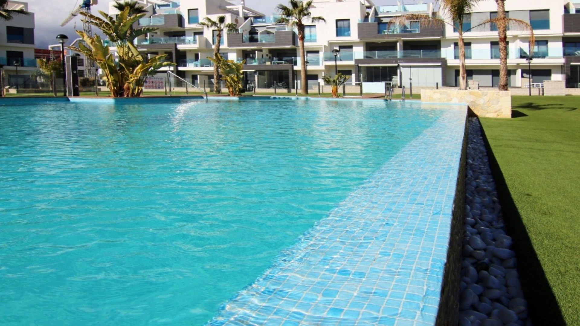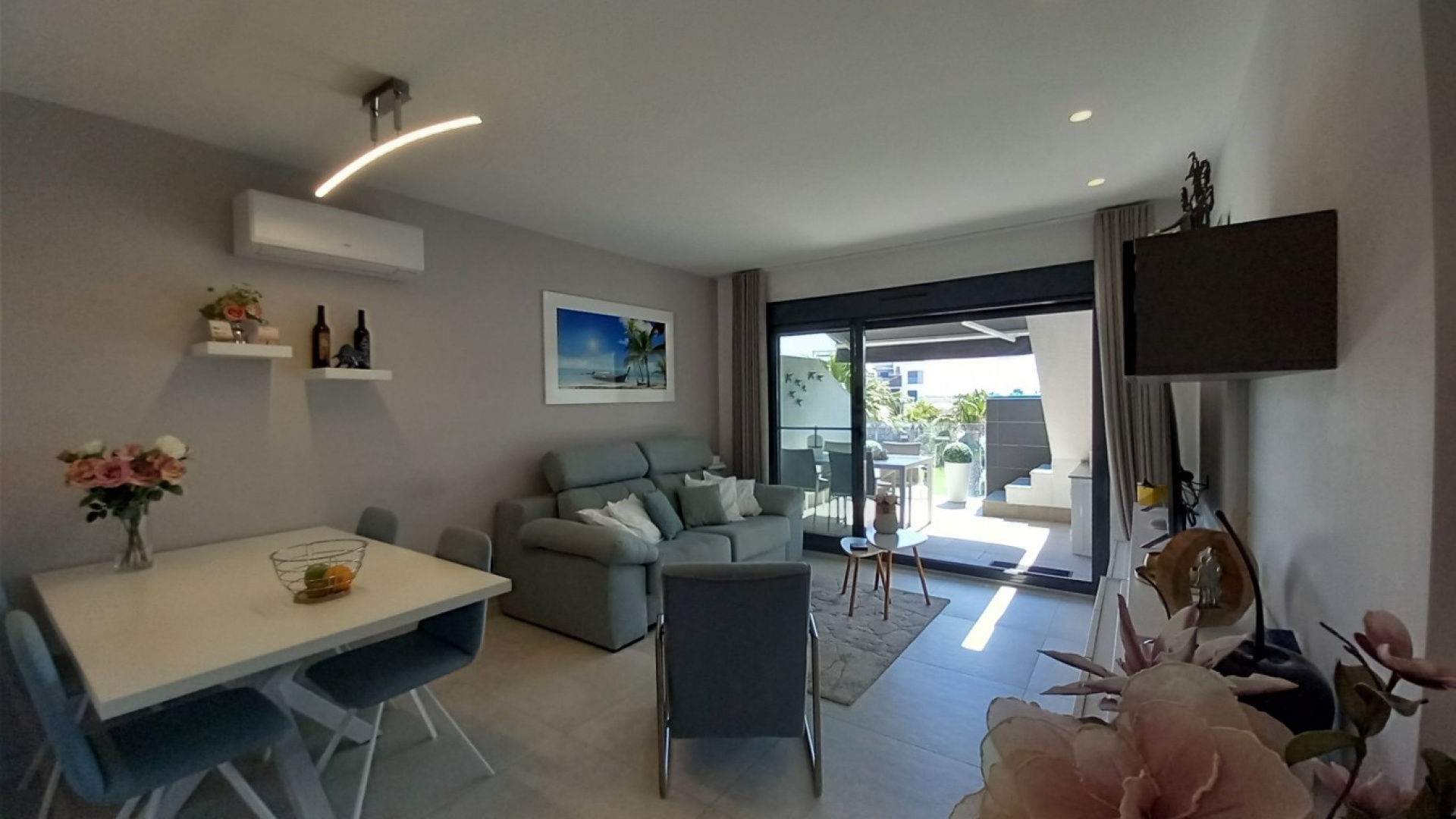 Denna vackra takvåning ligger i det moderna Oasis Beach XIII-komplexet nära den vackra spanska staden Guardamar del Segura och de naturliga sjöarna. Detta komplex byggdes 2020 och har en gemensam trädgård med en 25 x 10 m pool, ett spa med gym och bastu .Lägenheten har en privat parkeringsplats och ett förråd i det nedre garaget. Komplexet är inhägnat och lägenheten är utrustad med ett videoingångssystem och stålfönsterskydd. När du kommer in i lägenheten har du en hall som leder till ett mycket modernt, öppet och fullt utrustat kök med bardisk. Det rymliga och ljusa vardagsrummet/matsalen har luftkonditionering. De stora skjutdörrarna tar dig till den täckta terrassen med utsikt över poolen och trädgården. Du har två dubbelrum, båda med vacker utsikt, inbyggda garderober och oberoende luftkonditionering. Det stora sovrummet har utsikt över den gemensamma trädgården och har ett stort badrum med duschkabin. Ett andra badrum har en duschkabin. Lägenheten är inredd med mycket hög standard, är fullt möblerad och är i mycket gott (ny) skick. Från balkongen har du en trappa som leder till solariet på 68 m², med fantastisk utsikt över komplexets saltsjöar och grönområden. Solariet har ett utomhuskök och jacuzzi. Fastigheten ligger i El Raso-distriktet i närheten av affärer, barer och restauranger, 5 minuters bilresa från de vackra lokala stränderna och 30 minuter från Alicantes flygplats. En lägenhet som passar alla årstider i Spanien. Vi inbjuder dig att uppleva den underbara semesteratmosfären i denna vackra lägenhet. Kontakta oss för mer information eller för att boka ett besök.